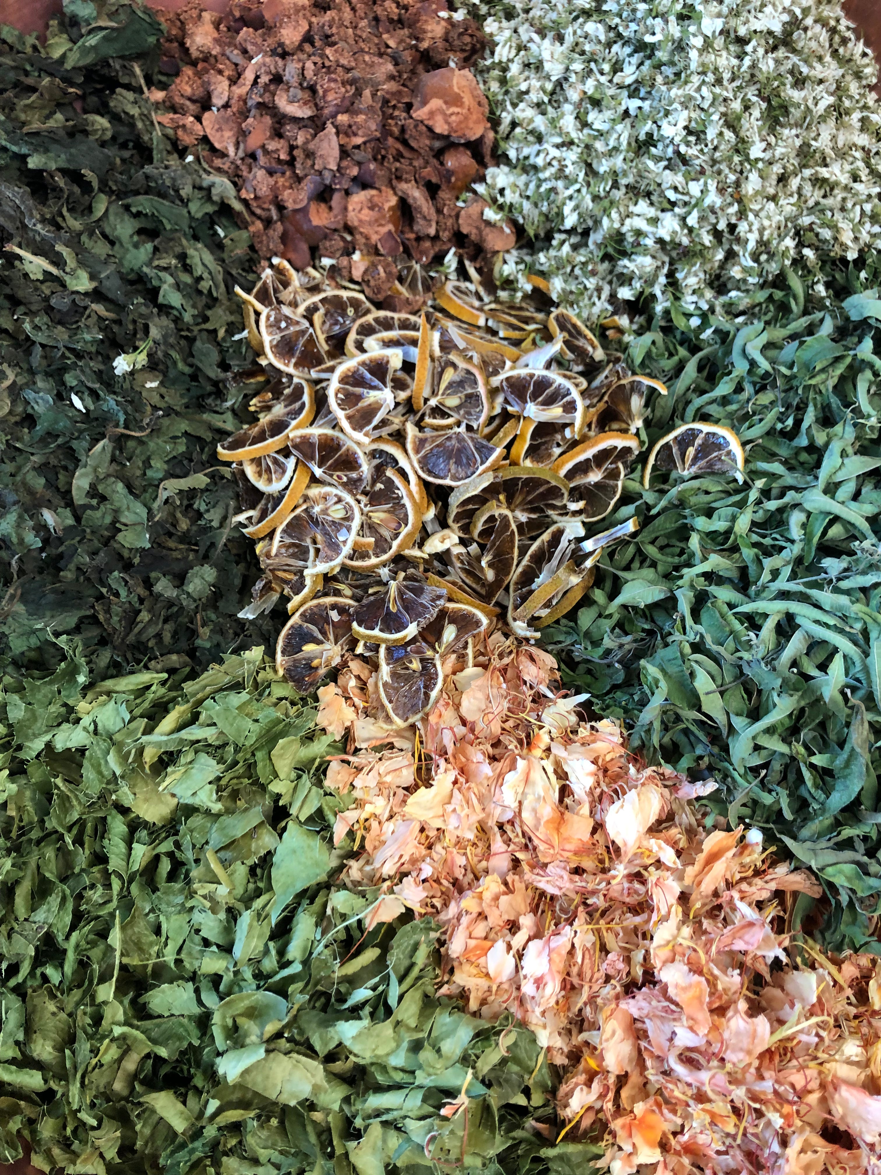 このように、果実を感じる植物や、果皮をブレンドして。爽やかでジューシー、甘みのあるお茶を作りました。