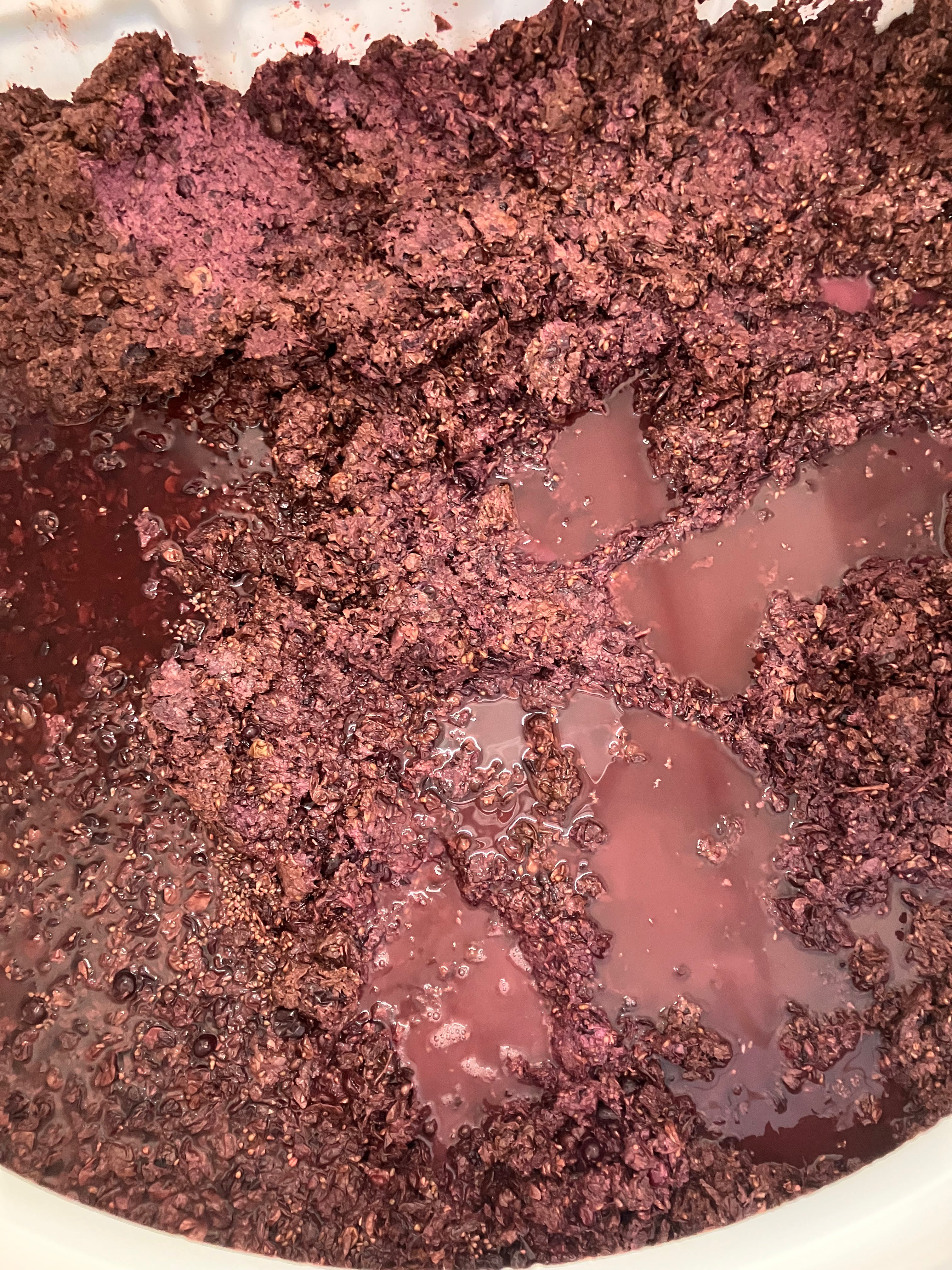 アルコール発酵を終えたワインは、一晩かけて重力のみでタンクから抜き取る「フリーラン」という方法で搾られています。そのフリーランワインを抜いた後の良質なもろみが、山形のタケダワイナリーから届きます。mitosayaで蒸留後、フレンチオーク樽で14か月熟成しました。