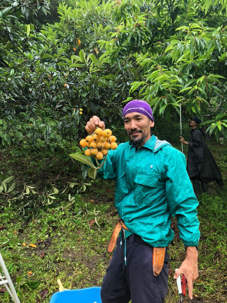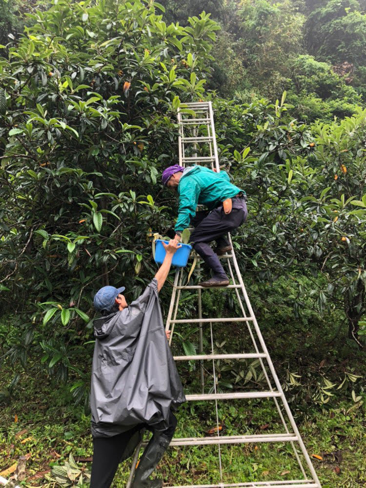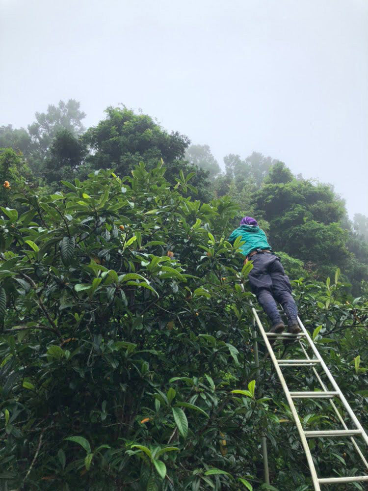 There are three large loquat trees on the mountains of AMBESSA, with loquat fruits hanging from the trees as they grow wildly. We climb the trees to the upper parts, where even a stepladder cannot reach, and shake the branches to knock them down, over the course of several hours we harvest 54kg of loquats.
