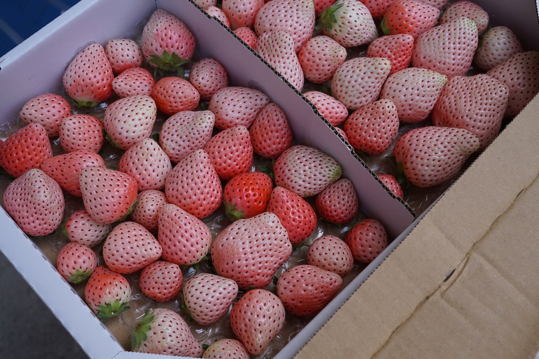 Pure white strawberries delivered from a strawberry farmer in Makinohara City, Shizuoka Prefecture. The transparent white fruit with a light pink color is very beautiful. They have a mild sweetness and acidity, and a sweet candy-like aroma. It is a blessing to look at, and even more so to eat.