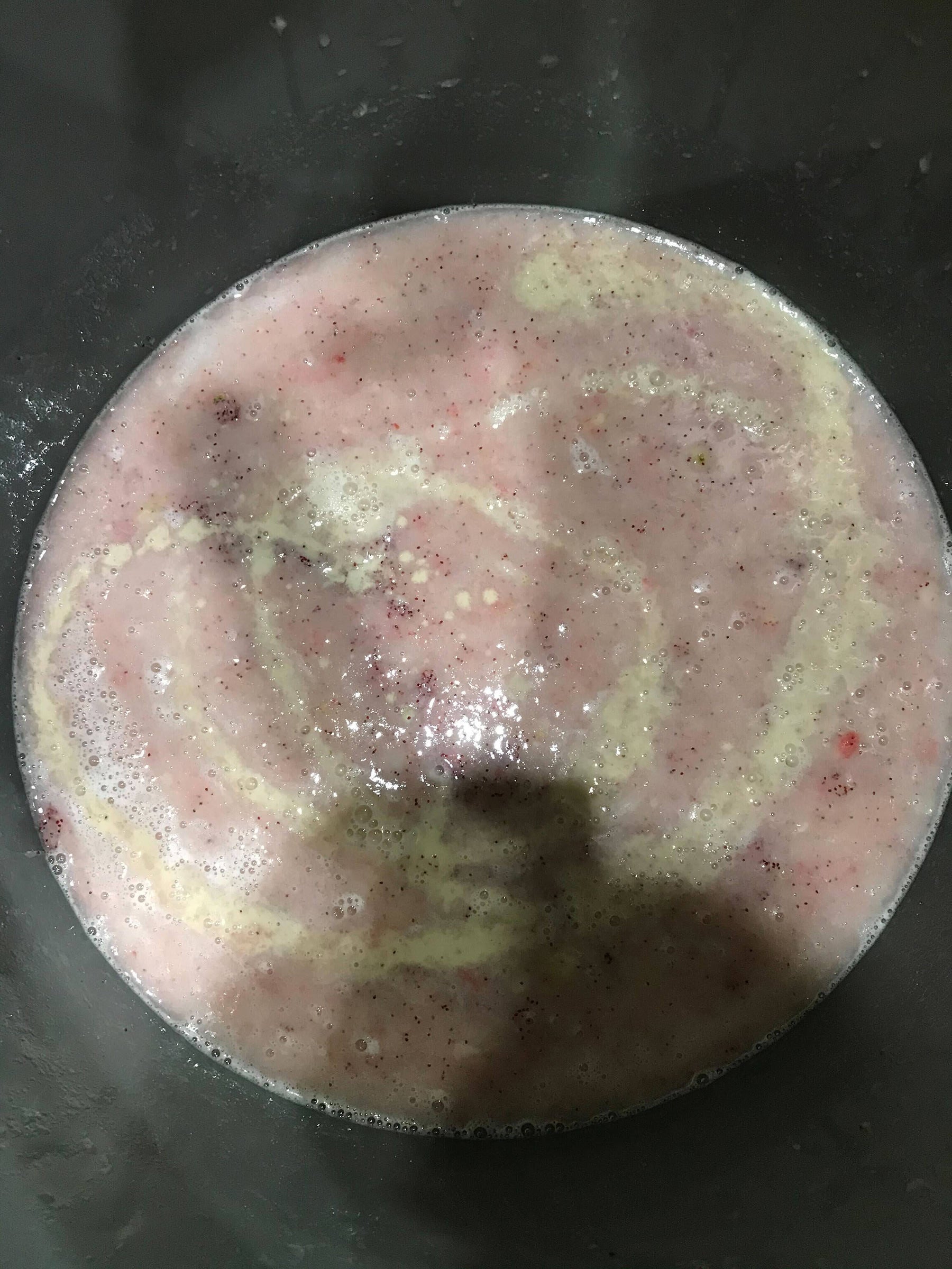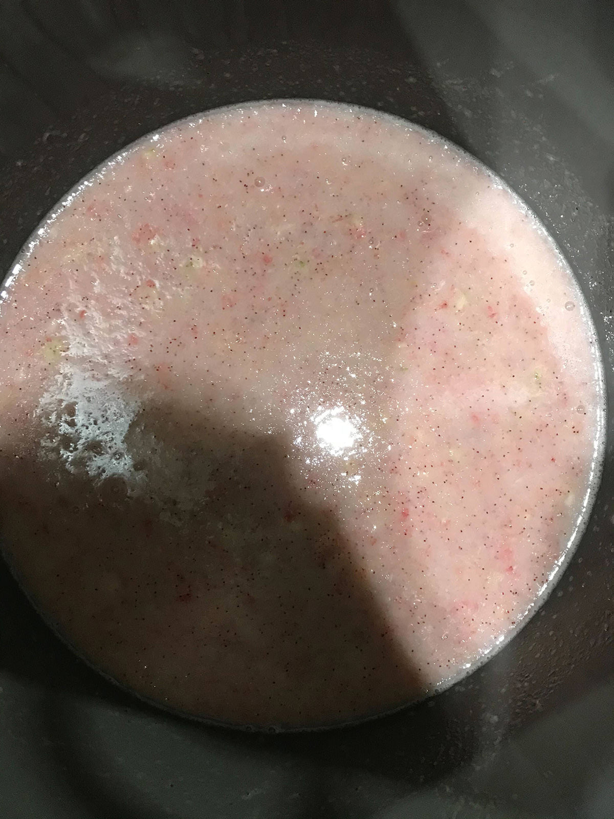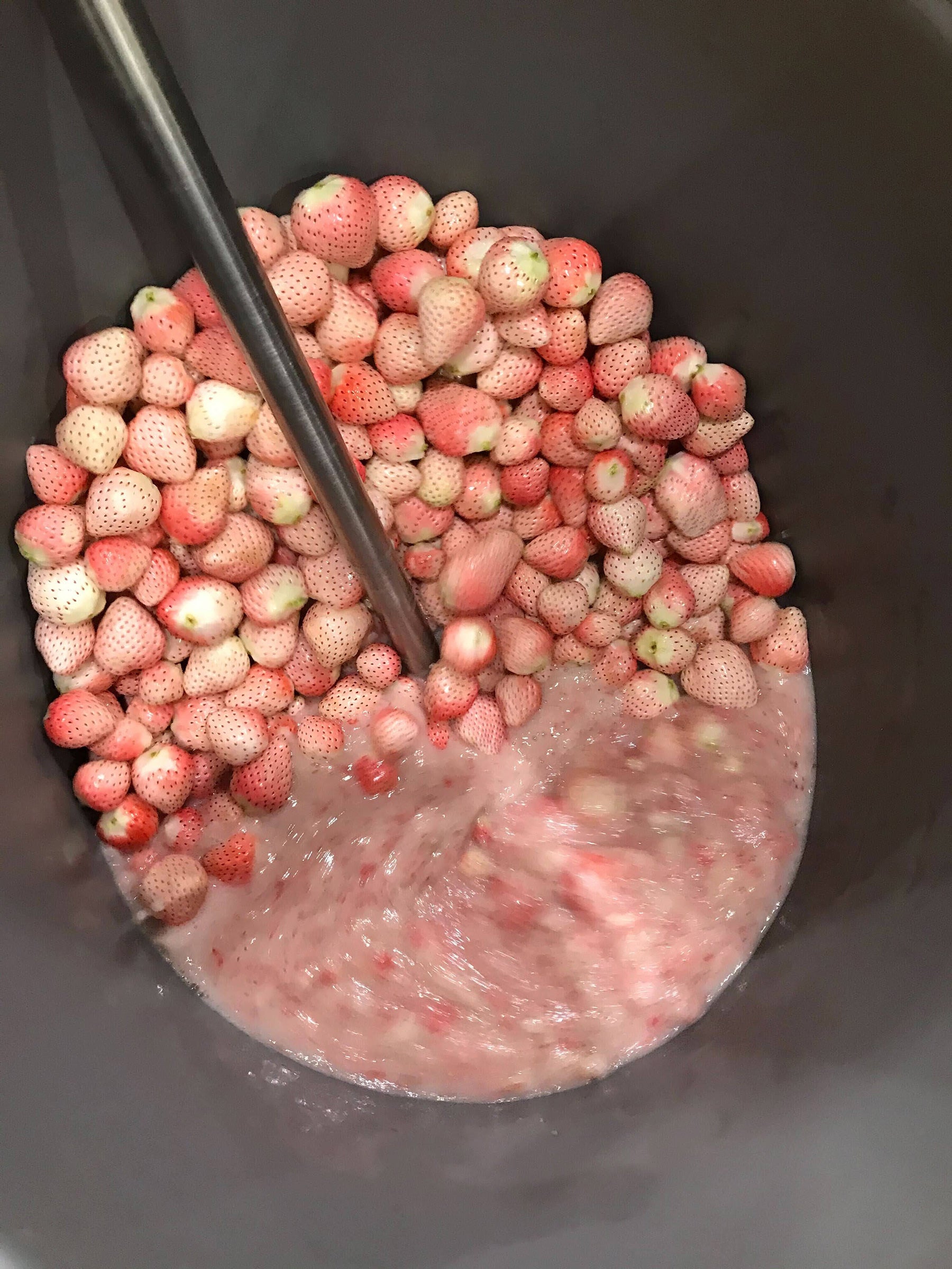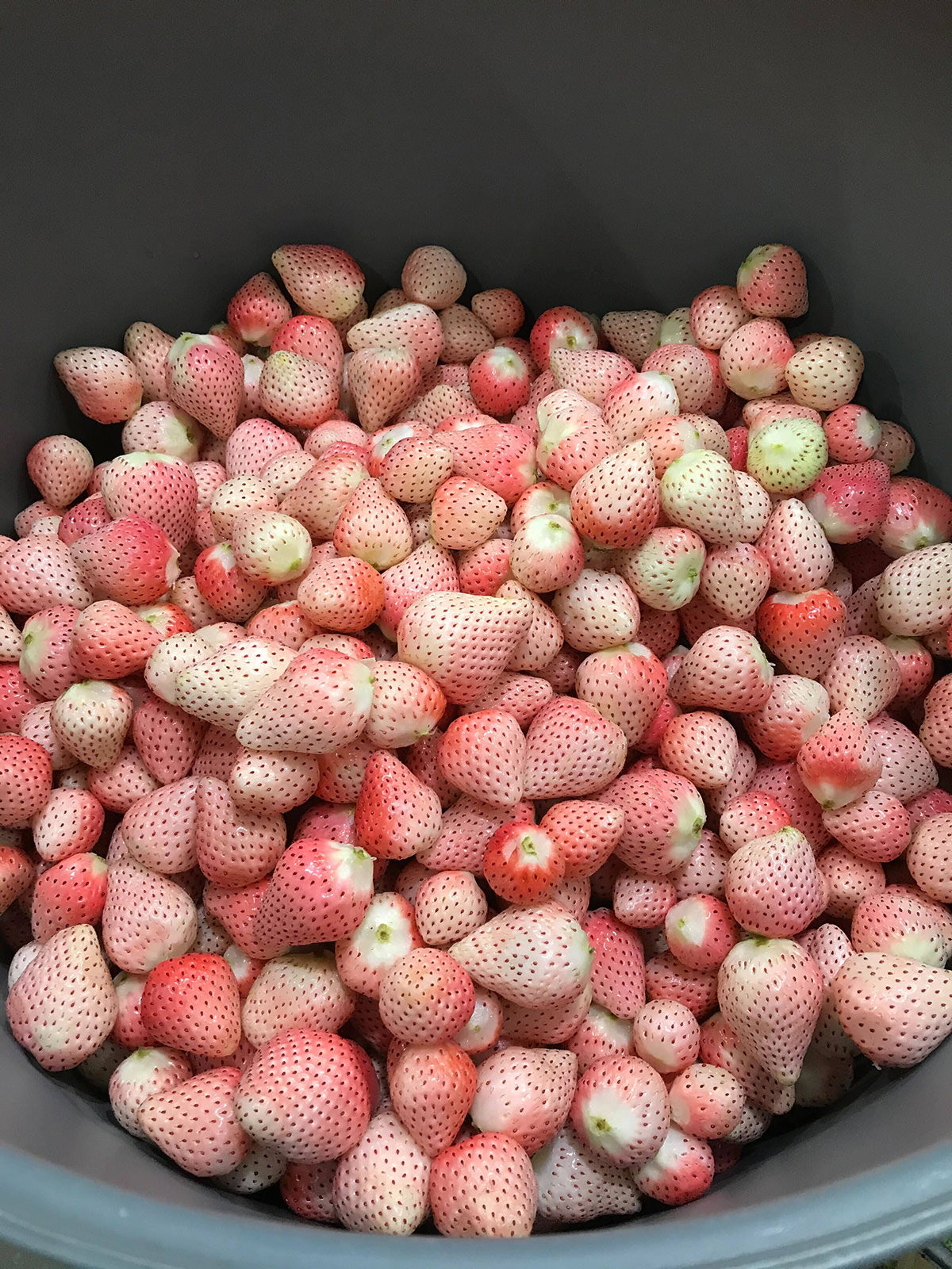 The white strawberries arrived in mid-May. The stems were carefully removed, roughly crushed, and fermented. After two days, high bubbles appeared, indicating that fermentation was proceeding smoothly. Two weeks later, once the fermentation had settled, the strawberries were distilled while retaining their freshness.