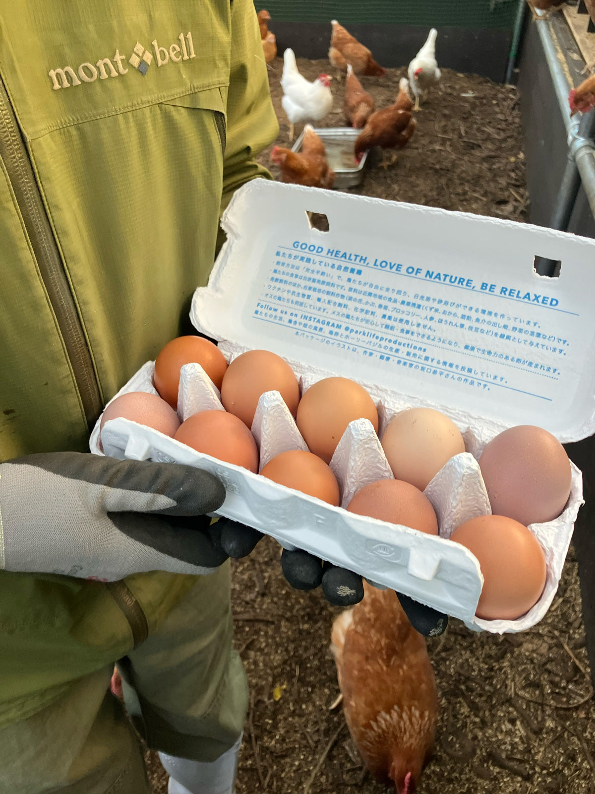 The eggs are from PARKLIFE PRODUCTIONS , a free-range chicken farm in Nishikoiso, Oiso-cho, Kanagawa Prefecture. Seeing the friendly chickens growing freely in a chicken coop they built themselves, and the delicious-looking feed they make themselves using a variety of ingredients, we asked if we could share some on the spot.