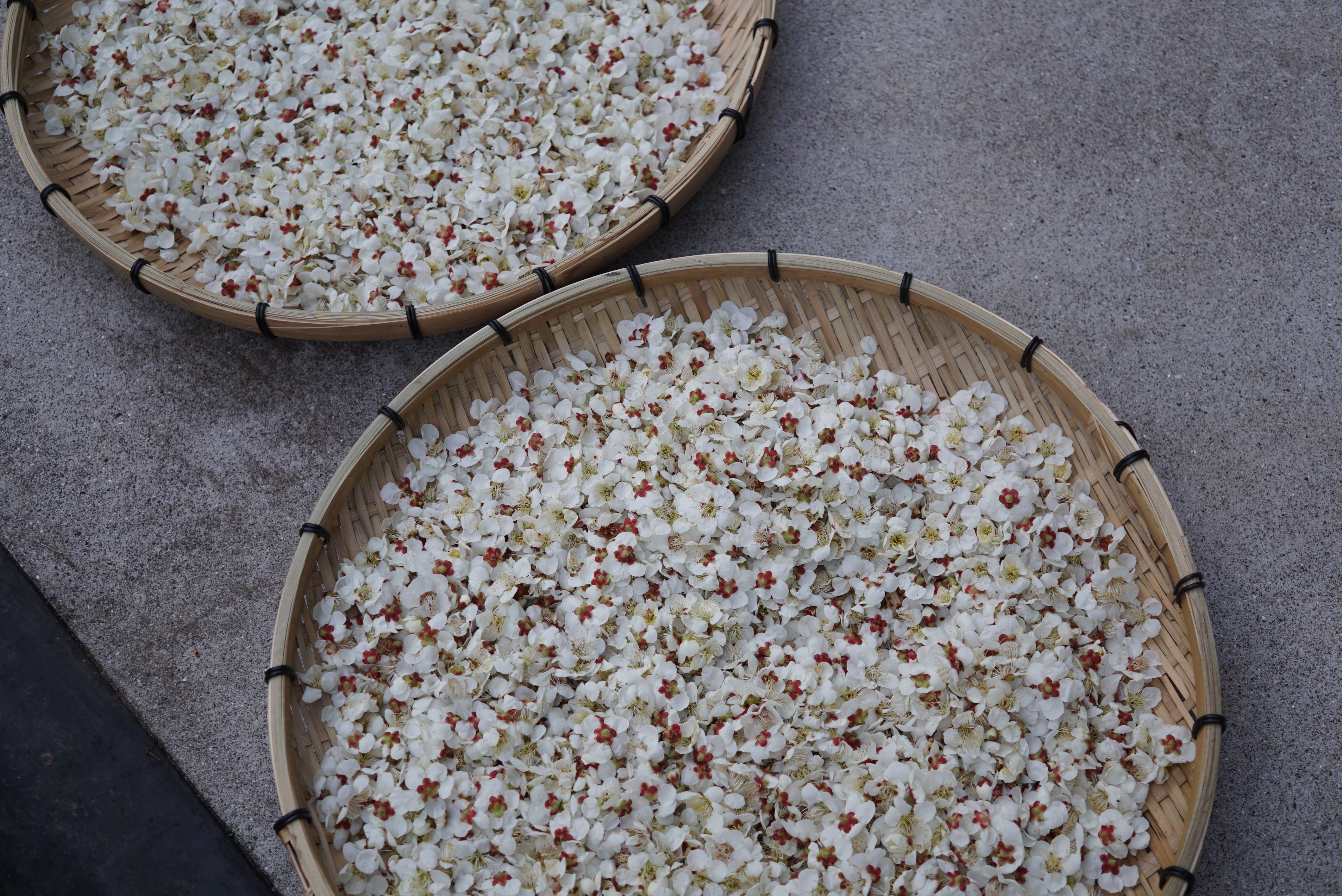 The dilution water used in the blend is aromatic distilled water made by distilling the branches and leaves of the white alder tree, a member of the Lauraceae family , harvested in Kanazawa City, Ishikawa Prefecture, at Korinkyo. Finally, white and red plum blossoms harvested this spring are infused in the water to give it a pale color and an apricot-like fragrance.