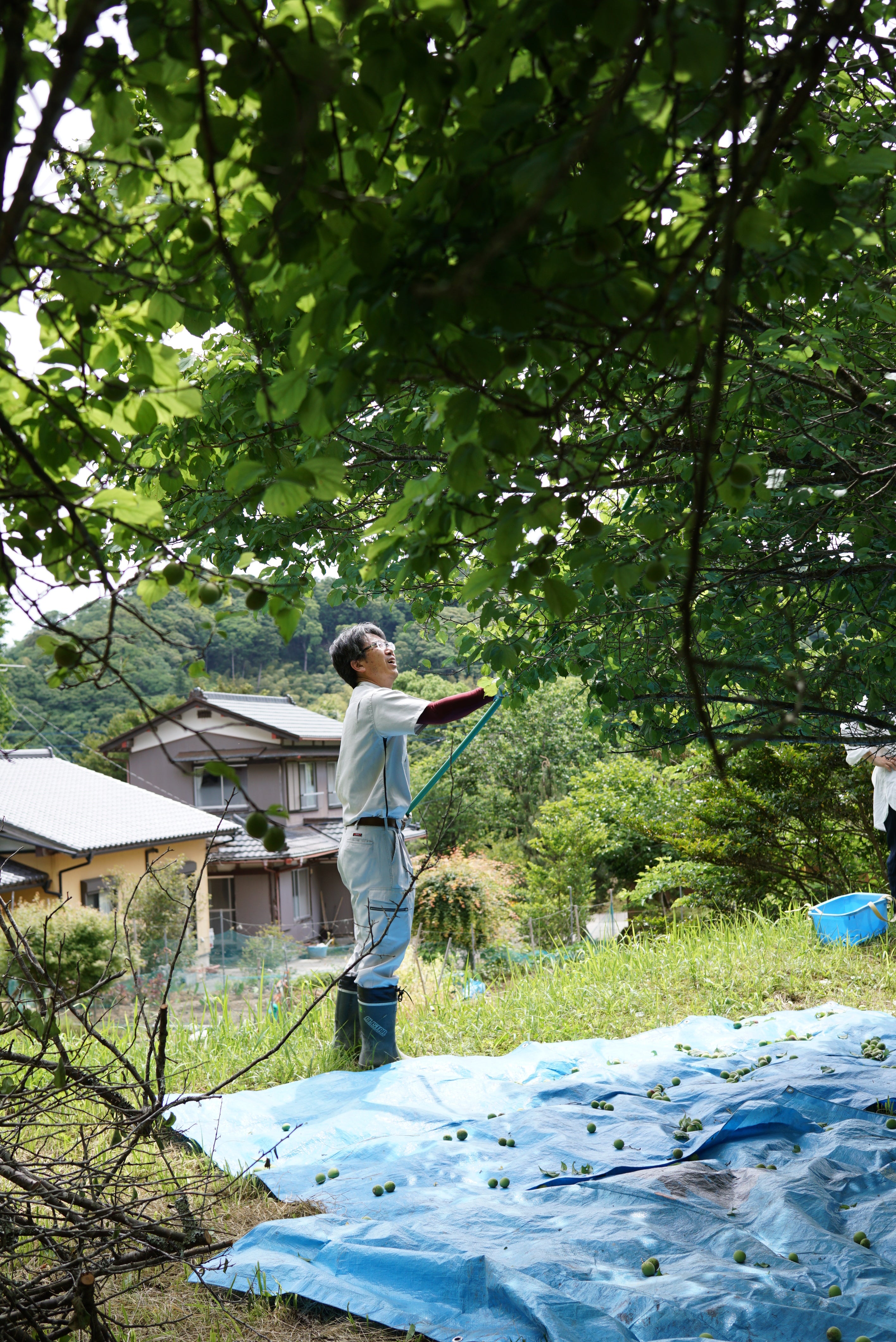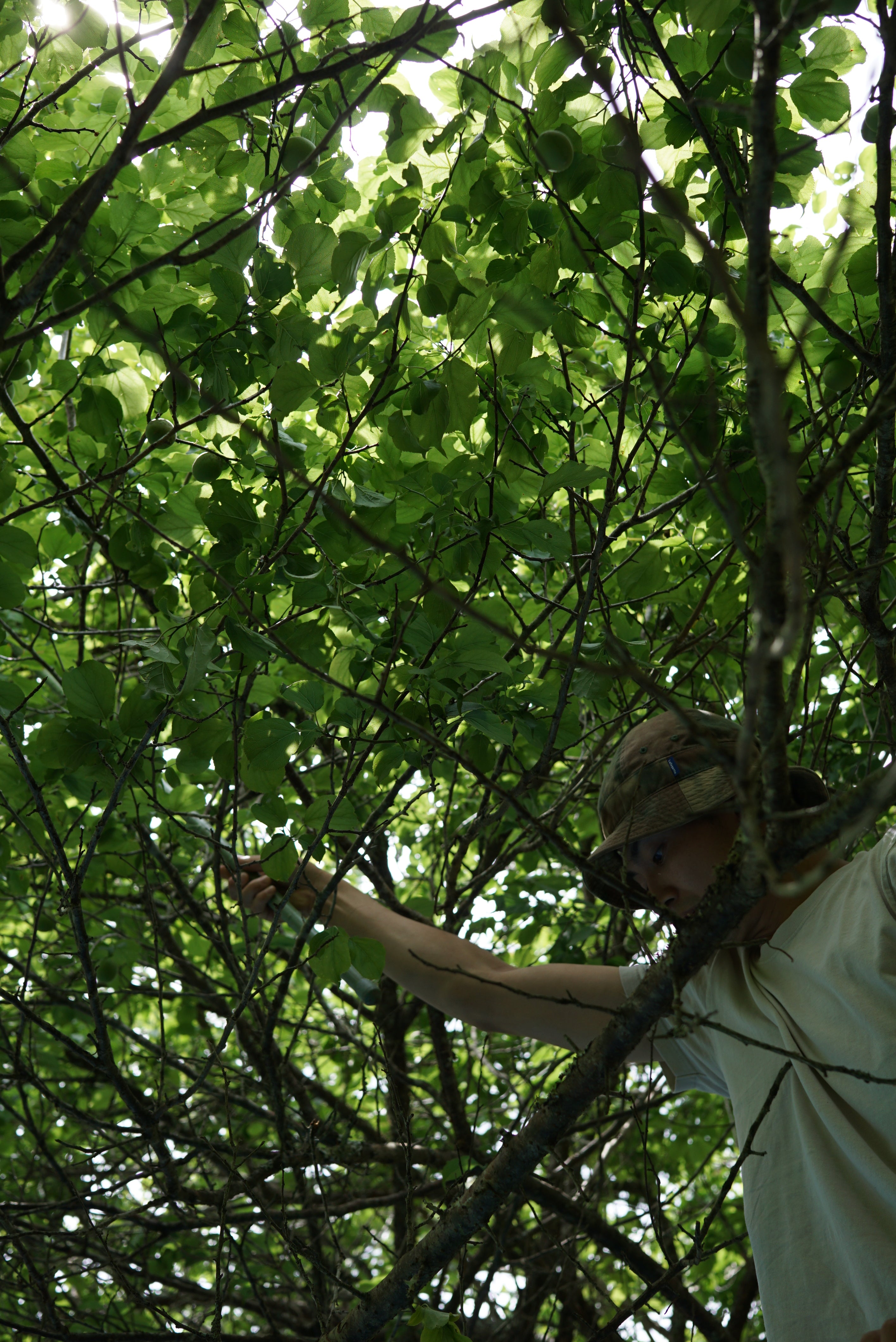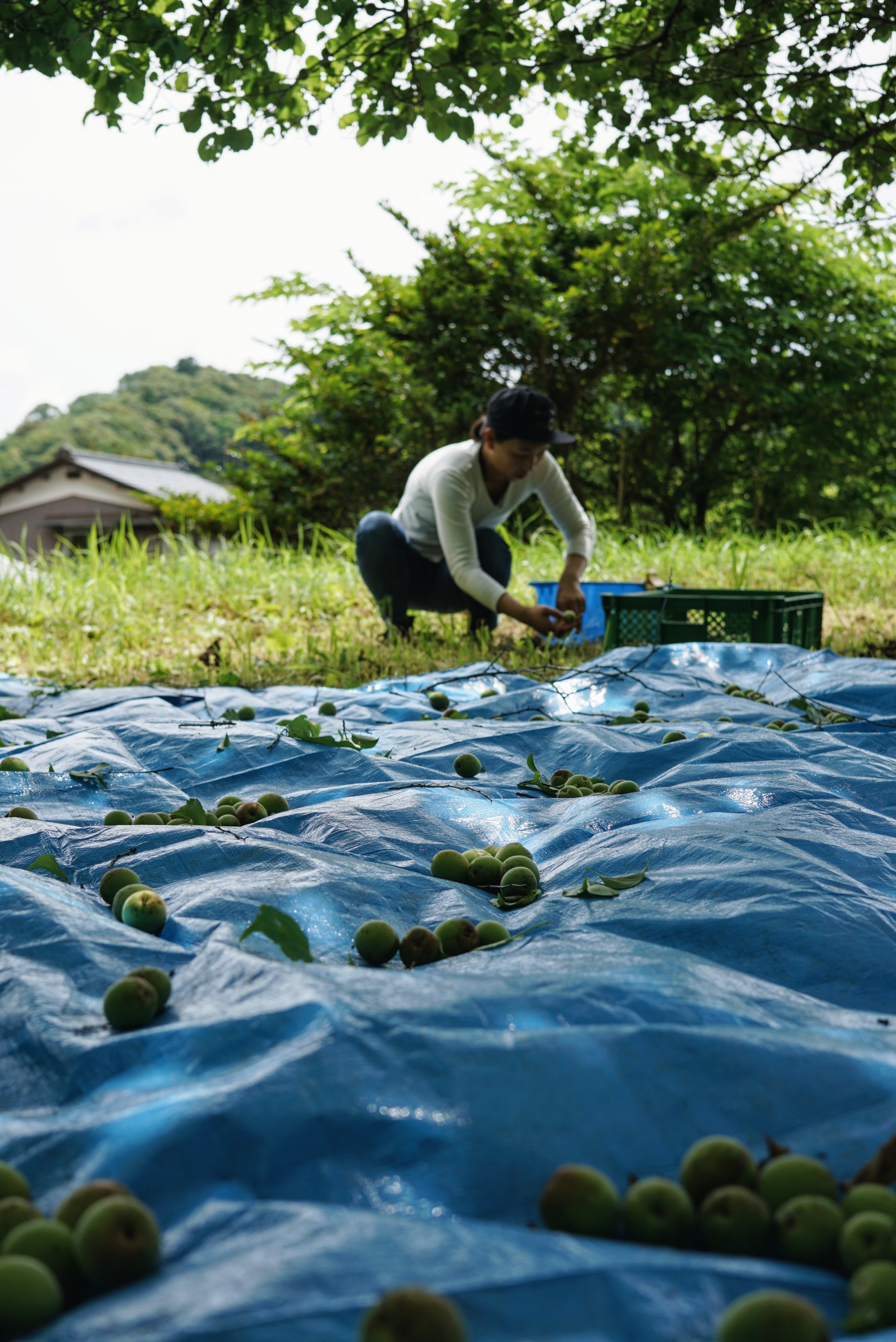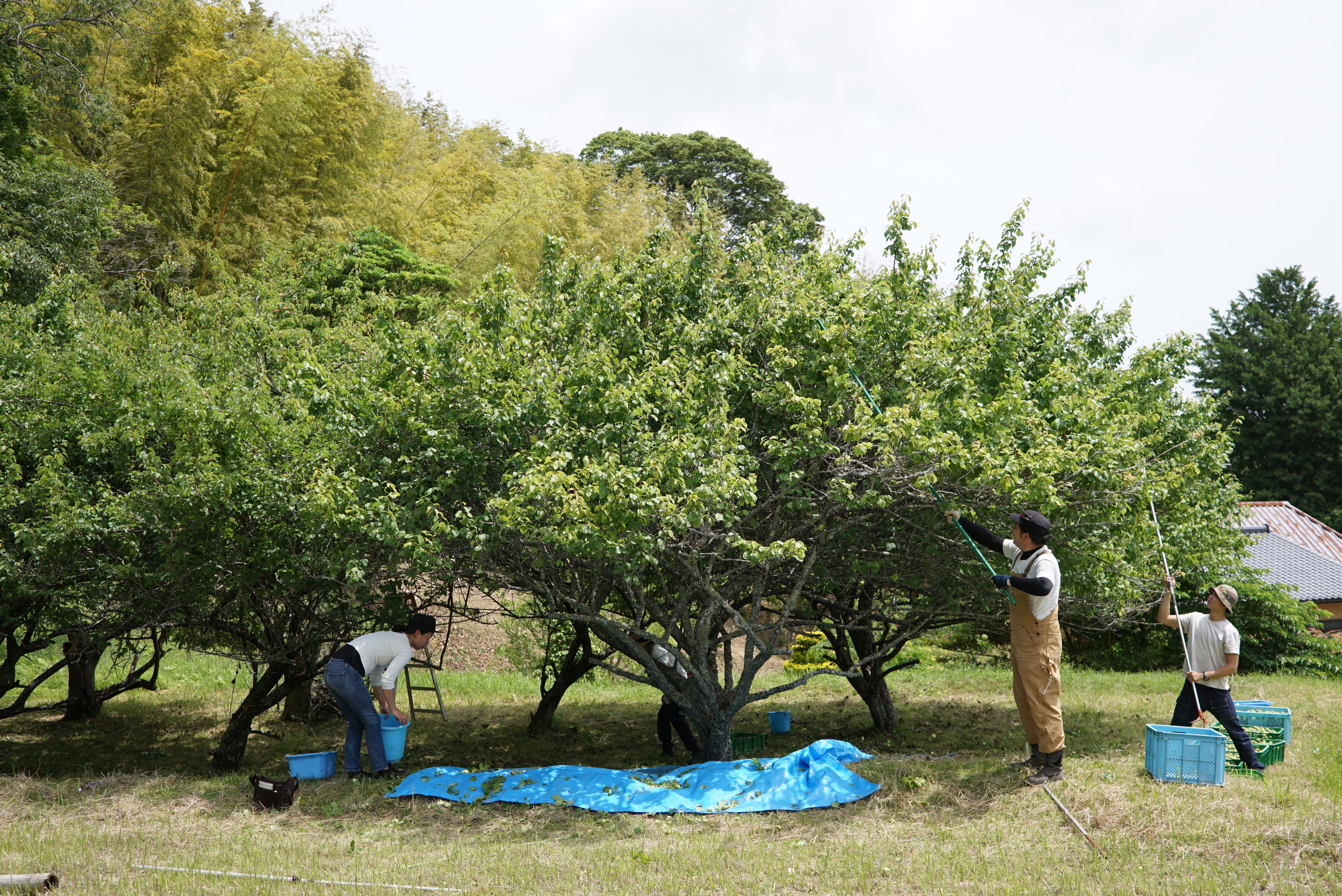 In early June, the green color of the ume plum blossoms gradually turns yellow, and the tops of the blossoms turn pale pink. I harvested the plums from a local ume grove with their fragrance wafting in the air. I would have preferred to wait a little longer, but having had a bitter experience the previous year when I waited until they were fully ripe and monkeys snatched them away, I decided to play it safe this time. After harvesting, we let the grapes ripen for a while, and when they have a peachy aroma and soft flesh, we crush them roughly, add yeast, and ferment them. After one month of fermentation, the yeast is distilled. Some of the plums are steeped in rice spirits to bring out their fresh aroma before distillation.