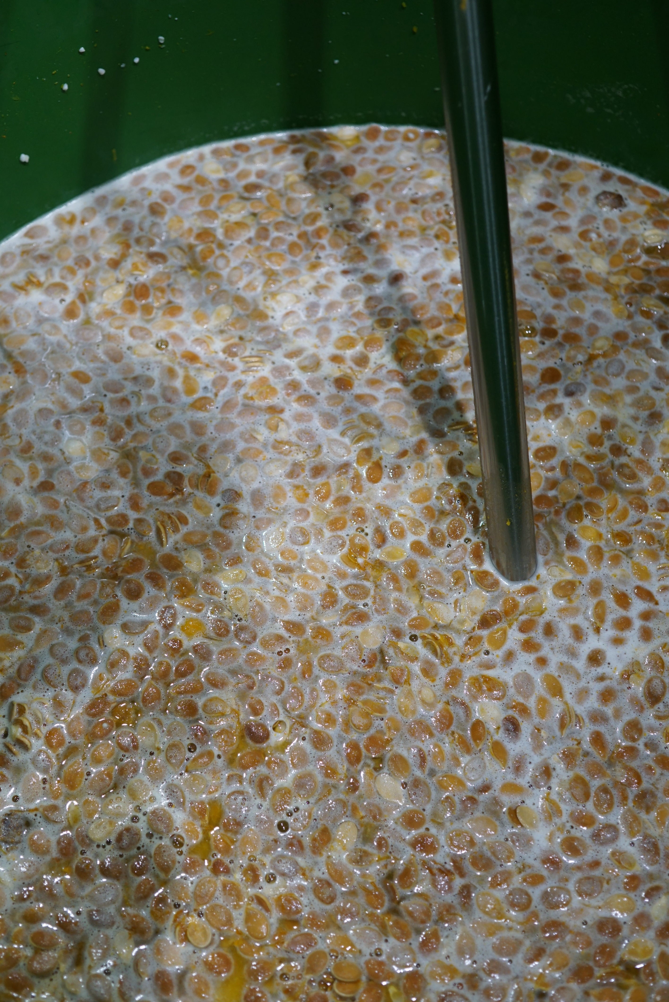 Before the heat cools, the crushed pumpkin is placed in a tank and sake malt, which was given to us by the Iinuma family, is added. At 55 degrees Celsius, the enzymes react with the starch in the pumpkin to promote saccharification.