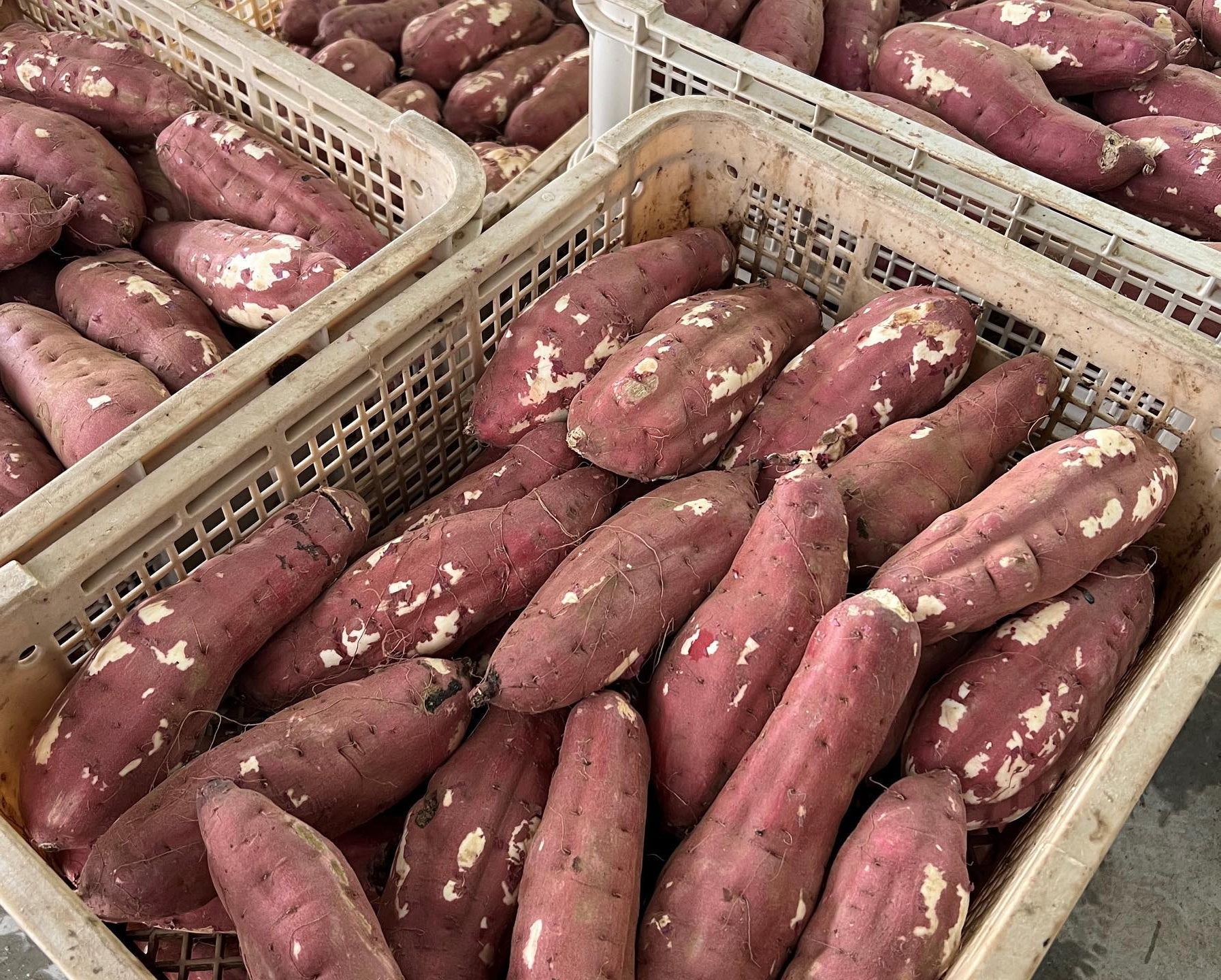 紅はるかは春の終わりから植えられ、約5ヶ月間かけて栽培され秋から冬に収穫されます。収穫時の糖度は約9度。低温度・高湿度の環境の冷蔵保管庫で熟成することで糖度は14度まで上がります。その後、洗浄・選別され、地元の天然ガスを使って蒸されます。蒸したさつまいもの皮をナイフでむき、スライスしてから平置きで乾燥させます。