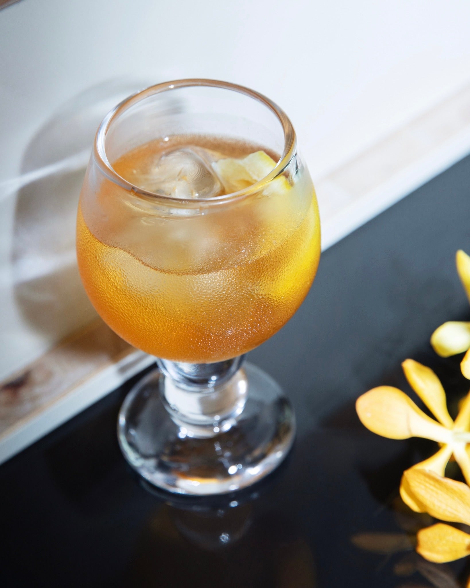 This expression combines barrel-aged Housui pear brandy with smoked longan, cacao nibs, and assorted berries. The longan, gifted by Baher, a friend from Taiwan, is rich in nutrients and smoked with its shell over firewood, yielding a refined natural sweetness and deep smokiness.