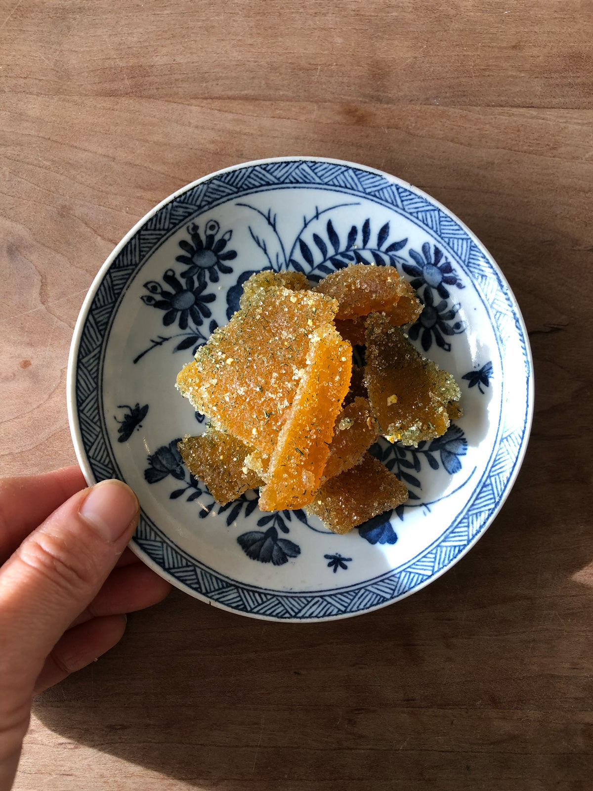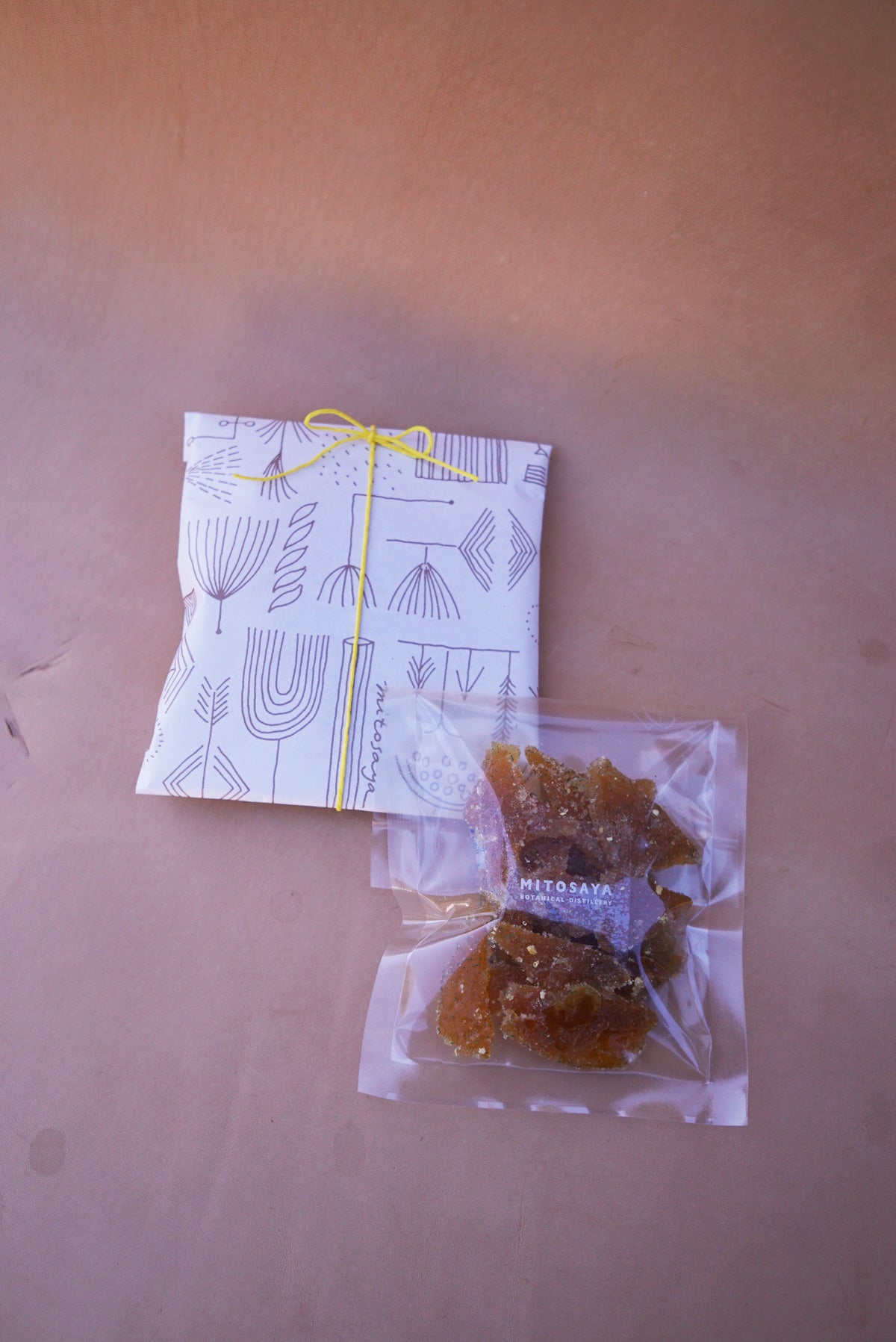 The peels, rich in sugar content, have a translucent quality and a texture reminiscent of firm jelly candies. As you chew, the slightly bitter taste and refreshing acidity of the summer oranges gradually unfold in your mouth. "Herb" is a variant with the granular texture of raw sugar, enveloped in the sweet aroma of fennel. These are perfect to pop in your mouth candy like whenever the mood strikes.