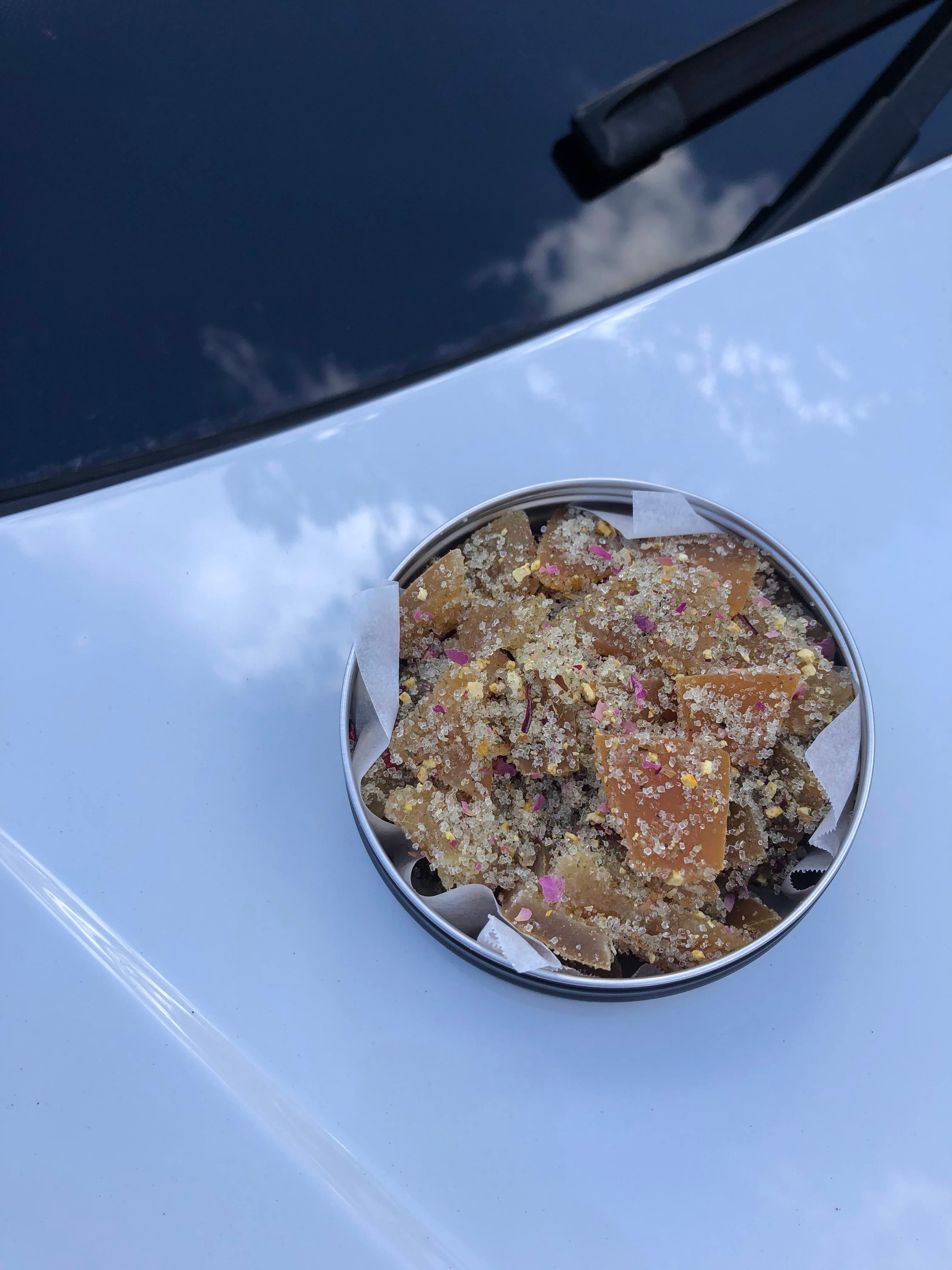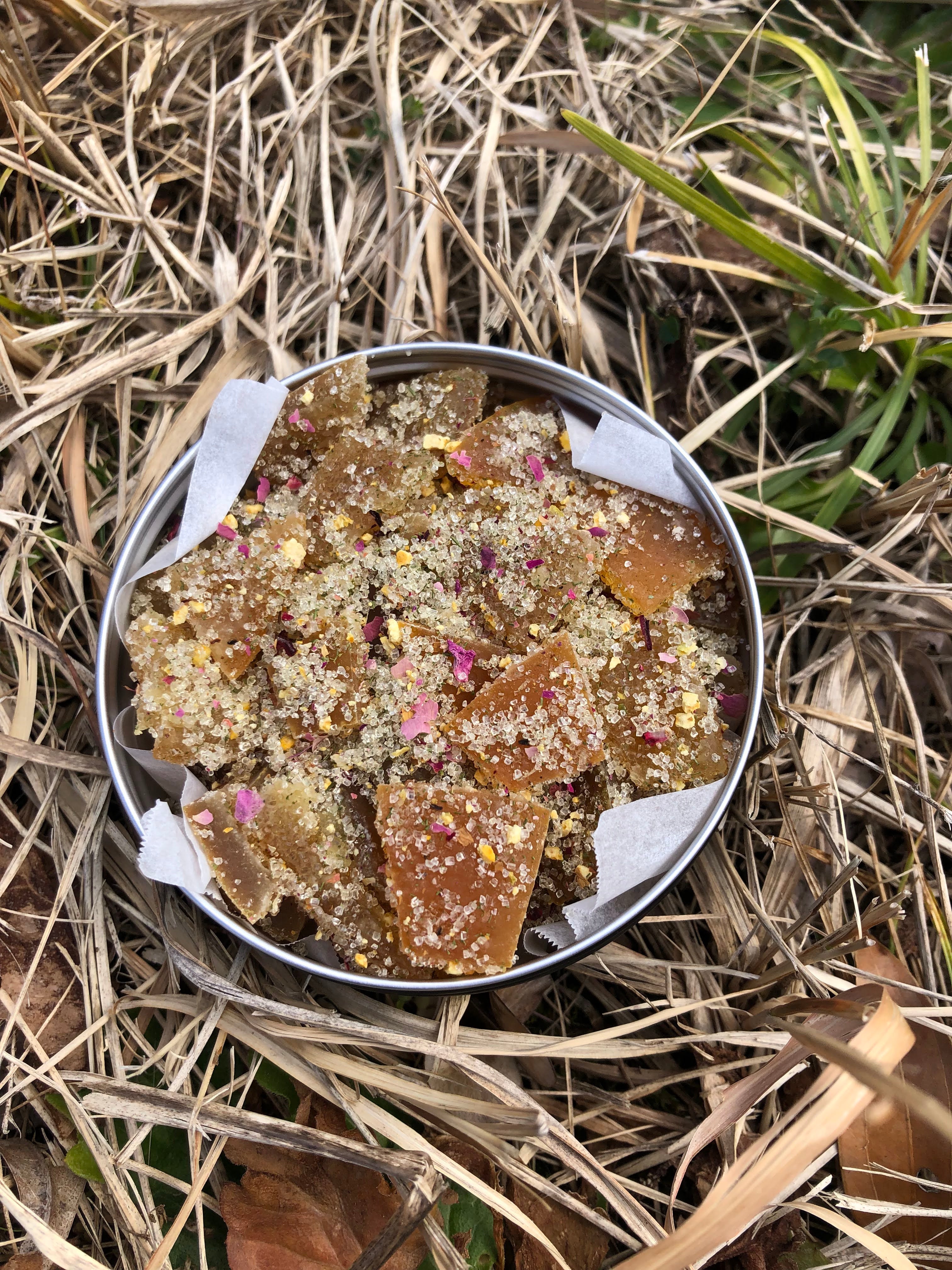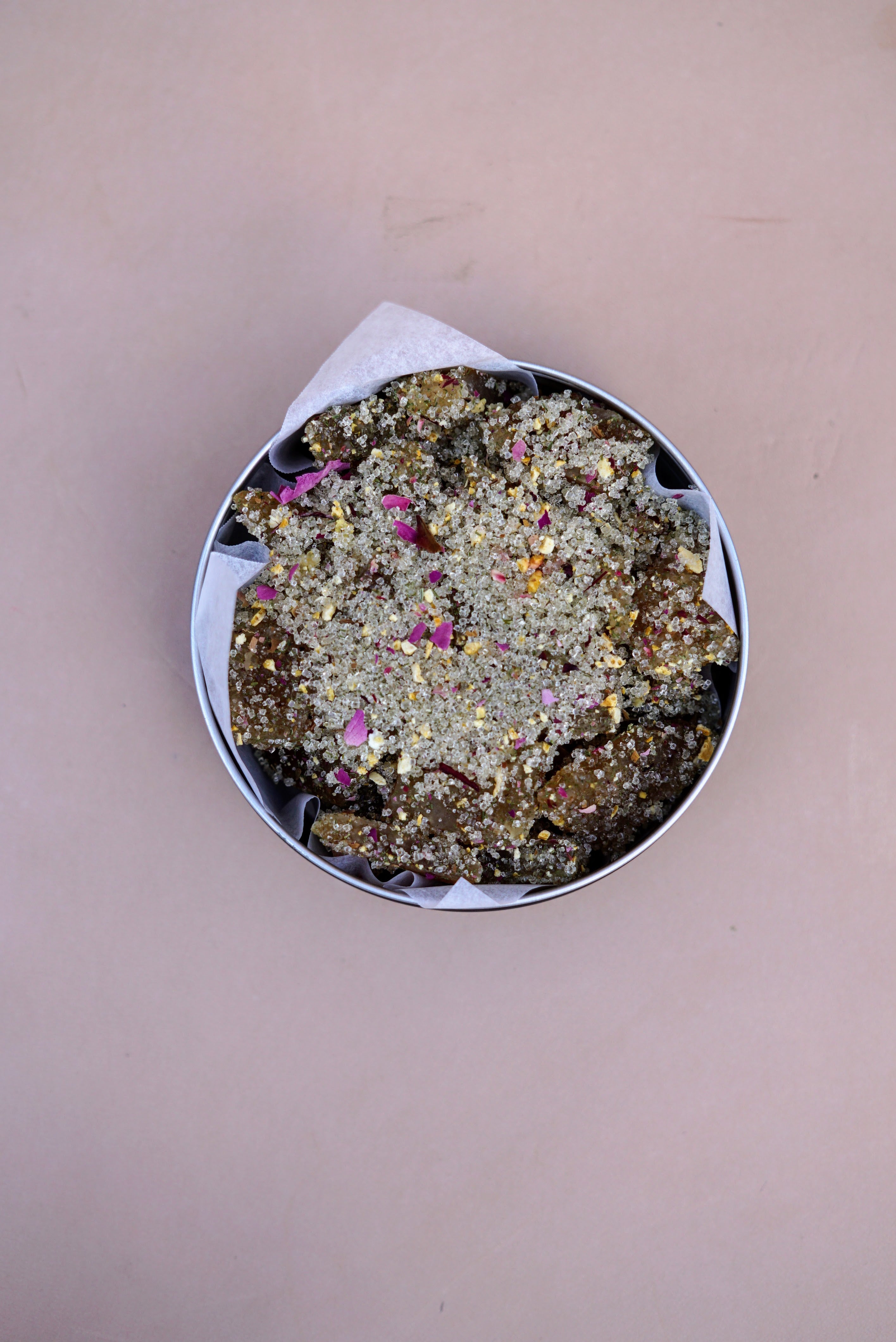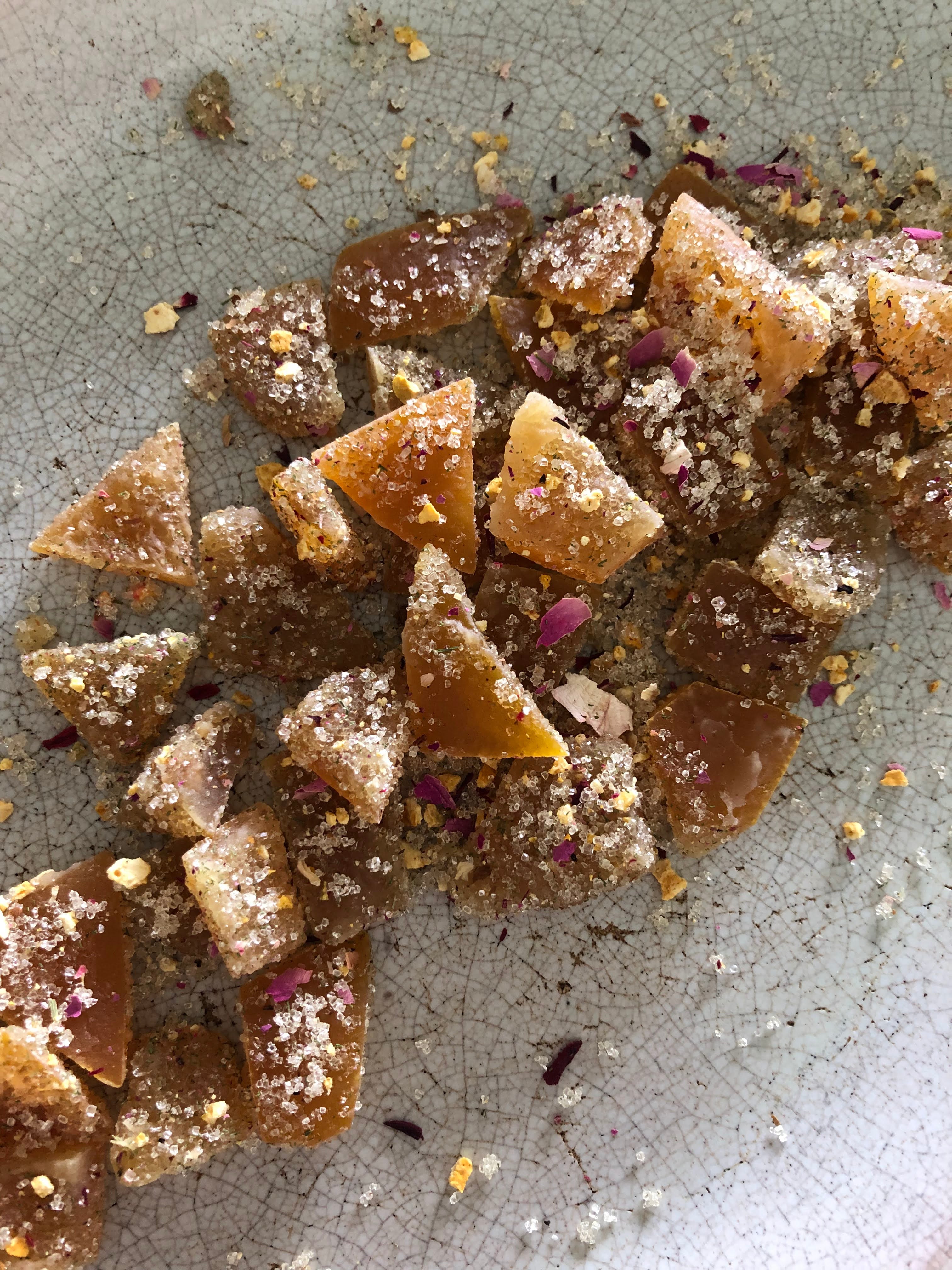 The peel is then cut into small pieces, dried, and dusted with coarse sugar mixed with herb powder.