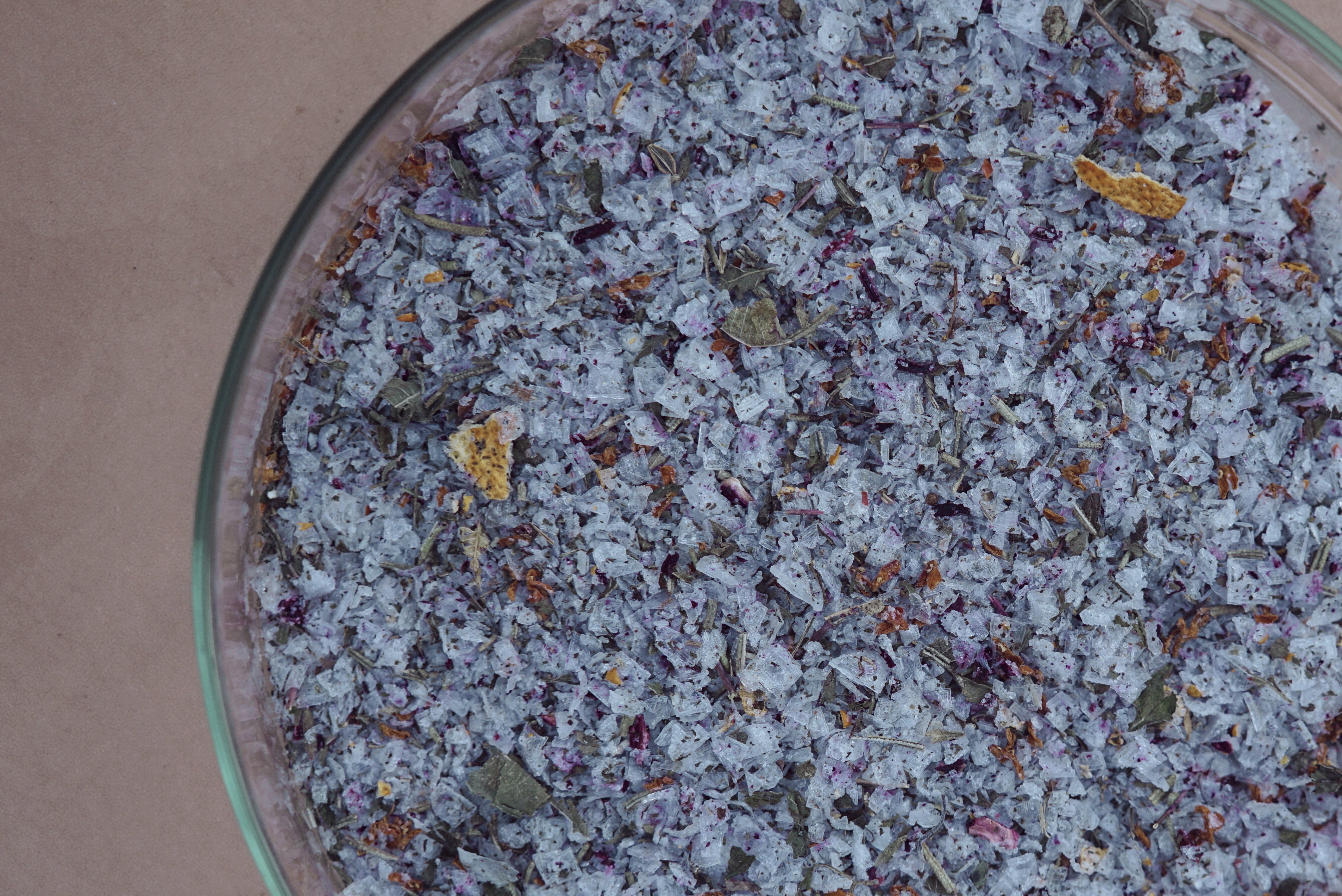 Ingredients: Sea salt (from France), rosemary, mint, oregano, thyme, hibiscus, osmanthus, citrus peel (kabusu), seeds (angelica, shiso, bupleurum)