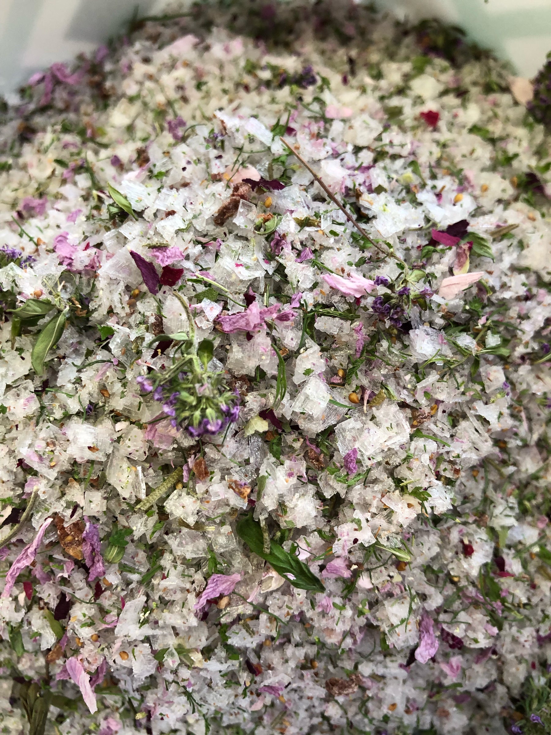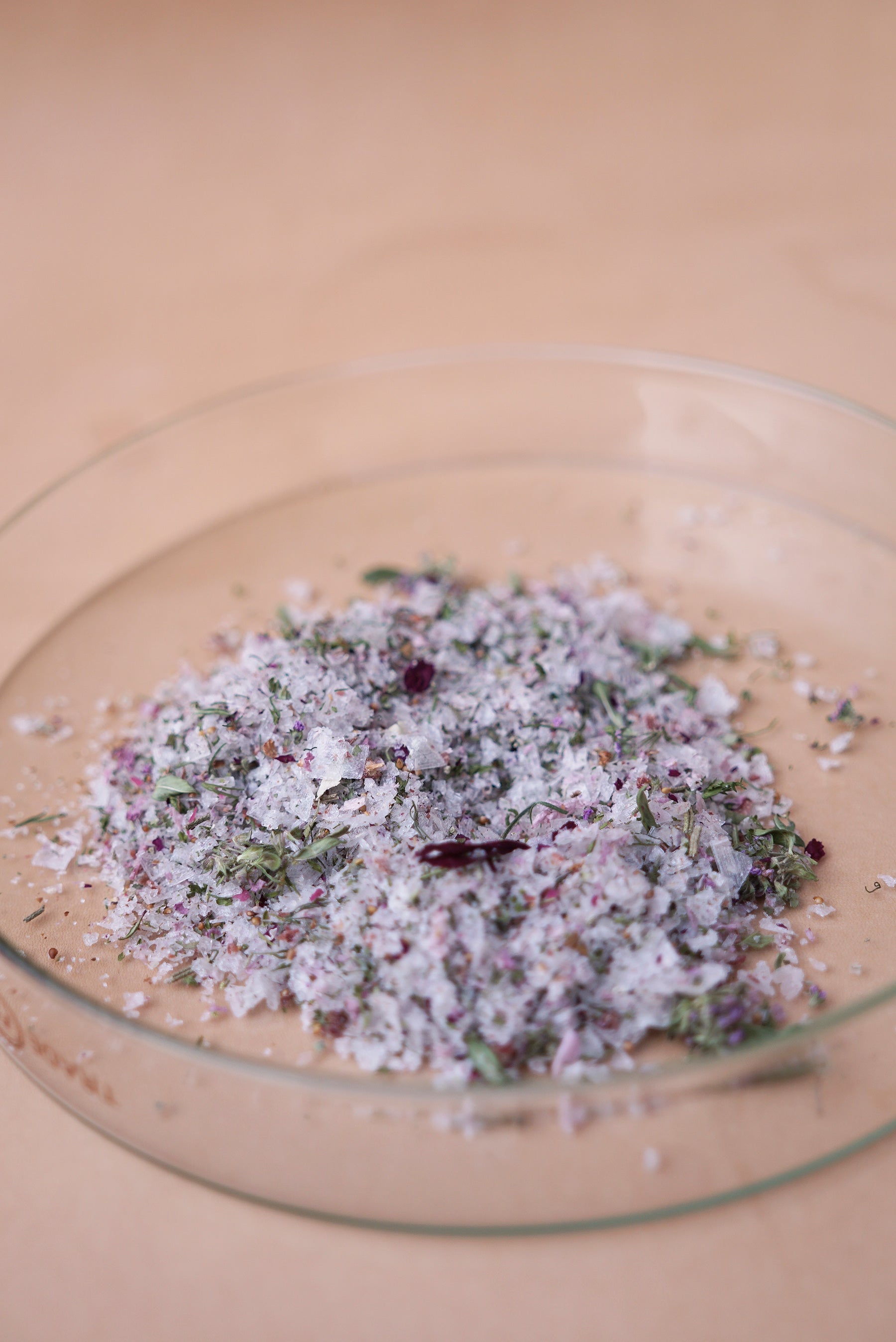 Ingredients: Salt (from France), Thyme, Dill, Oregano, Rosemary, Chervil, Marjoram, Double Cherry Blossom, Peony, Distilled Strawberry Pulp