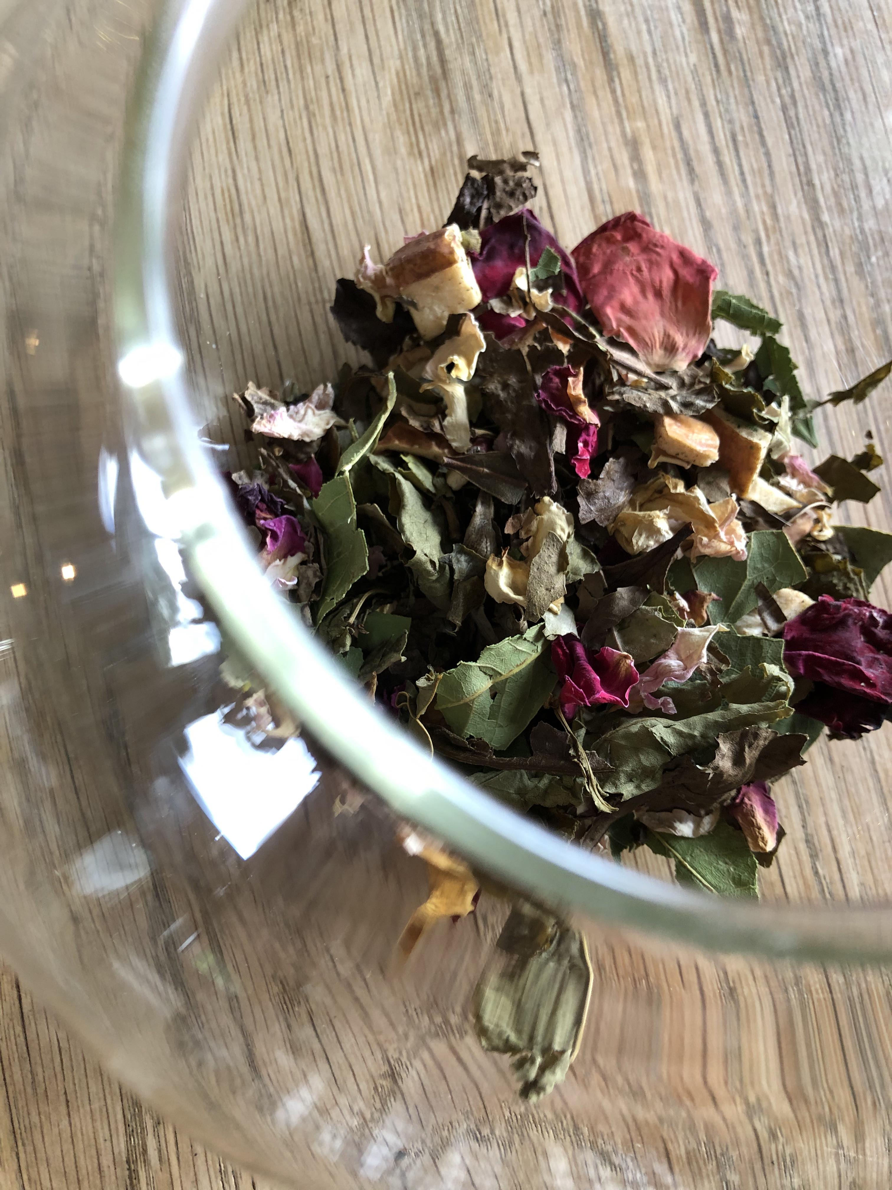 Ingredients: Tea leaves, peach leaves, rose flowers, laurel, apples