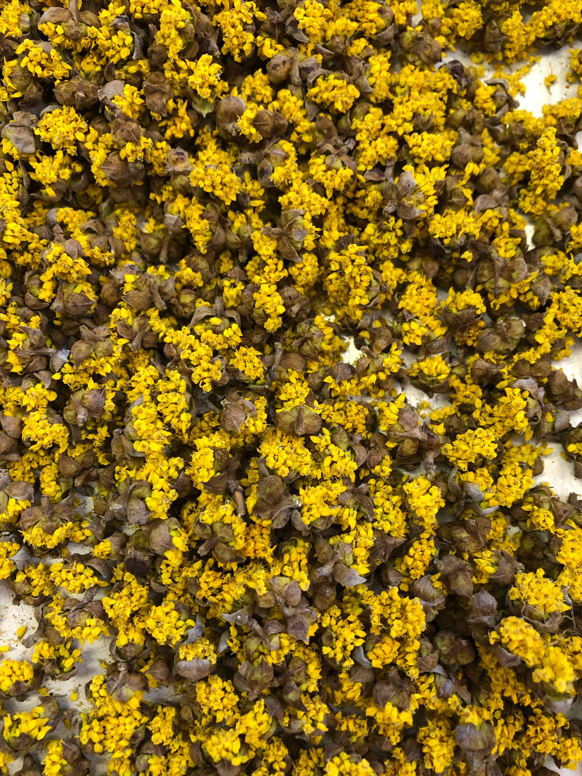 Yellow is the first color that heralds the arrival of spring in the garden. The flowers of sanshuyu (Japanese elm) begin to bloom like a fire in the shade of a dark tree, and yellow plum blossoms adorn the pathway. I notice buds sprouting here and there, newborn shoots of dogtooth vines and branches of cherry trees that I picked up last year. I gathered these lovely plants of this season and made a tea of this fleeting season.