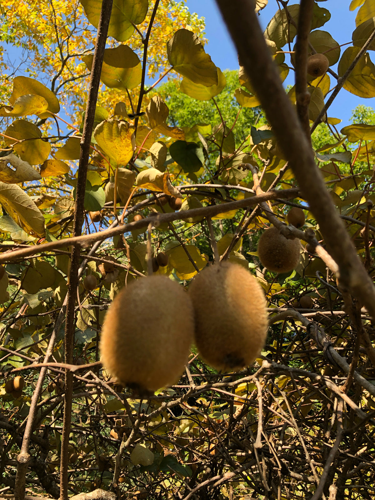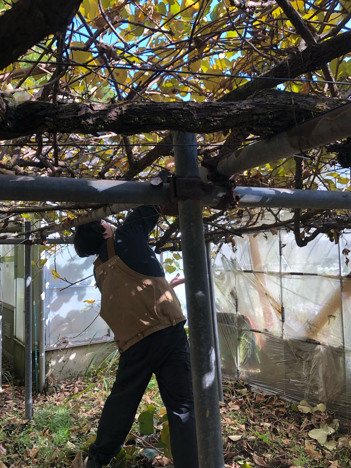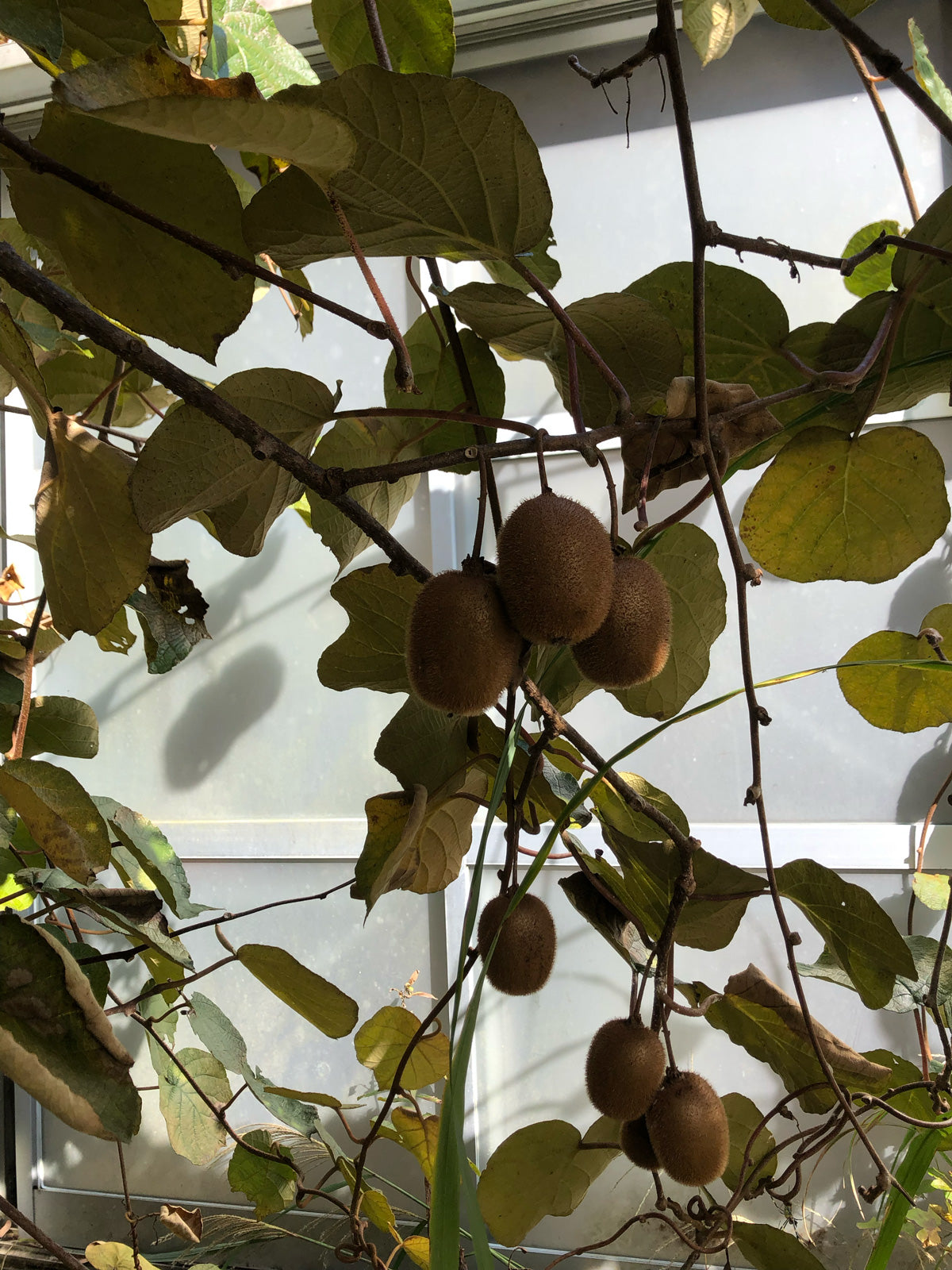 mitosayaの庭の温室の裏には、のびのびと枝を広げるキウイの棚があります。この冬、たくさんのキウイの実をつけ収穫しました。