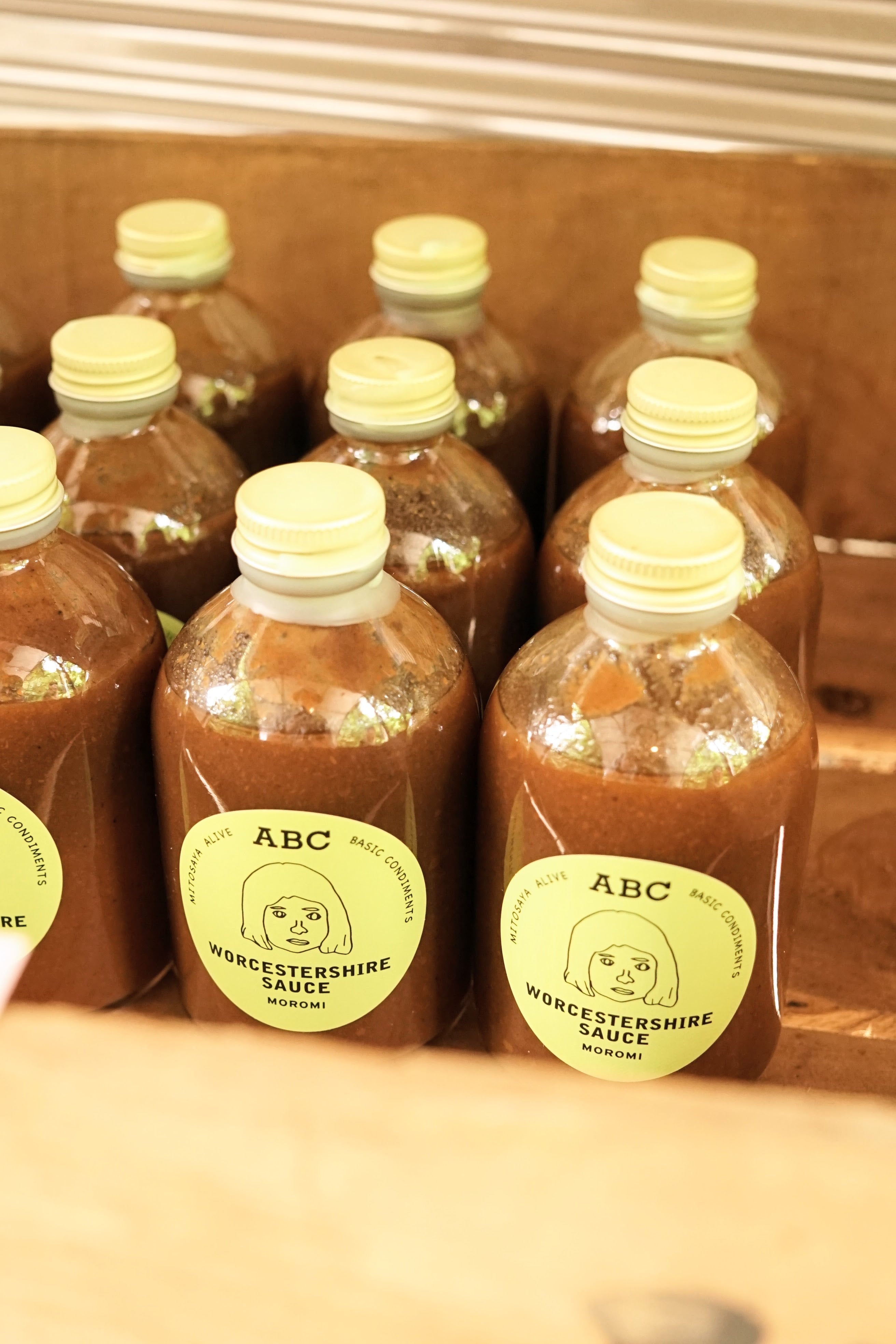 The first product in mitosaya's "ABC" lineup is a spicy Worcestershire sauce made from the mash of alcohol after distillation. Two types are available: Le Lectier's Moromi and Navel's Moromi.