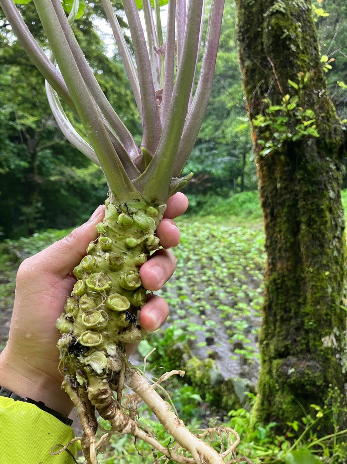 根と茎・葉で10キロ、根の部分はていねいにすりおろし、ライススピリッツに漬け込みます。3ヶ月間浸漬した後に蒸留。