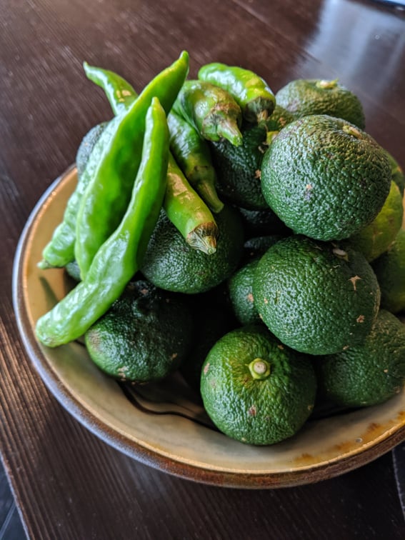 The peak season for green yuzu is the two weeks before and after the autumnal equinox, before the ripe yellow yuzu is harvested. Sadae Kamiya, aka "Madam Yuzu," taught me how to grow them. By delaying the thinning of the fruit until the very last minute, she is able to produce fresh green yuzu that is ideal for yuzu kosho. When you run your fingernail over the skin, the juice comes out in a mist and is just so fresh.