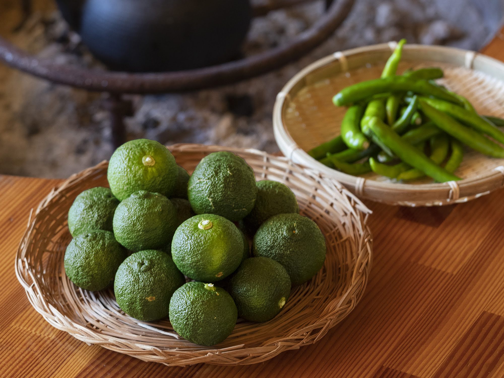 熟した黄色いゆずが収穫のピークを迎える前、秋分の日の前後二週間が青ゆずのピーク。教えてくれたのは「マダムゆず」こと神谷禎恵さん。本来は摘果のために実を間引くタイミングをギリギリまで遅らせることで、柚子胡椒に最適の青くて瑞々しいゆずが採れる。皮に爪を立てると果汁が霧状に弾けとにかくフレッシュ。
