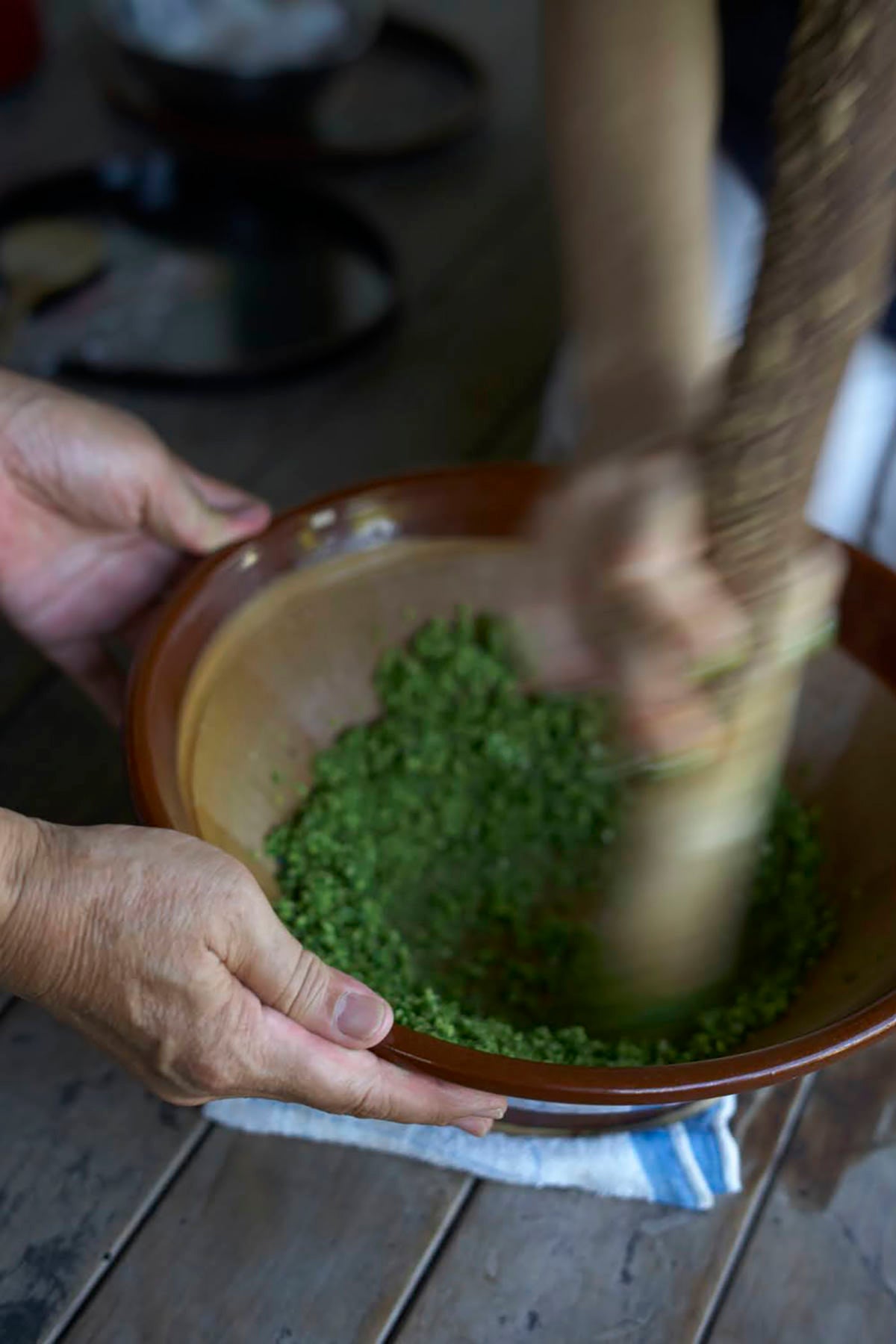 一方の柚子胡椒のこしょうは青唐辛子。地元の青い唐辛子と青ゆずの収穫期が重なるのがポイントで、一年のその二週間を選び、神谷さんは柚子胡椒を作ります。塩を加えて、フードプロセッサーをかけ、さらにすり鉢で潰していく。全体が馴染んで少し粘りがでてきたら完成。