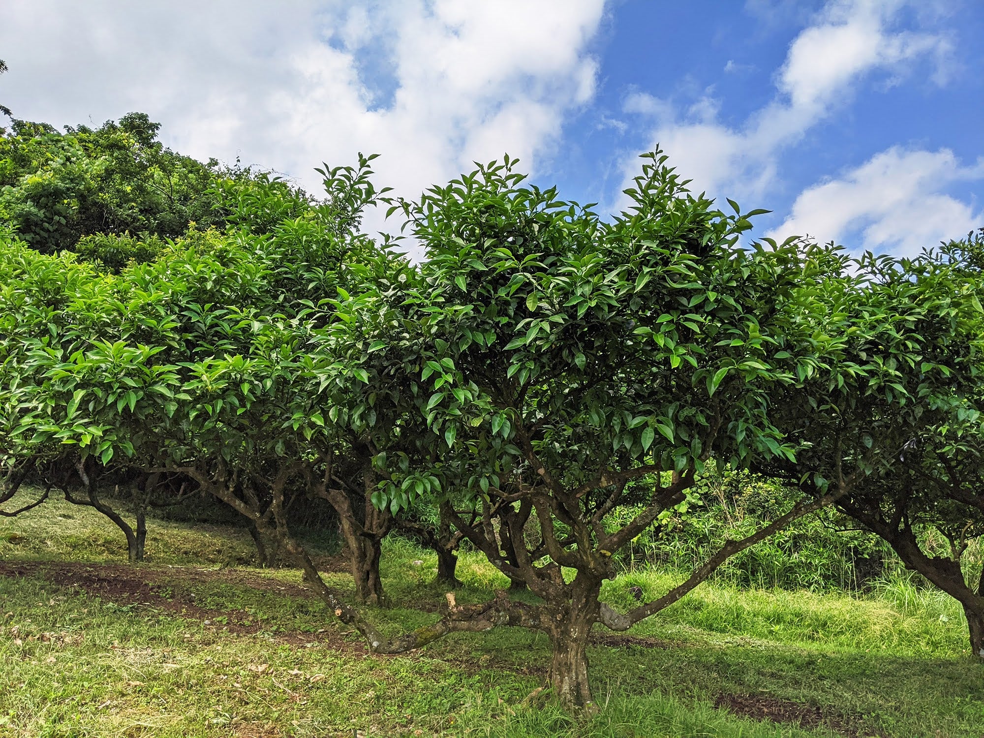 In the northern part of Oita Prefecture, there is a town called Inai, Usa City. The yuzu that was planted decades ago in what used to be terraced rice paddies has now become a major production area. Standing on a mountainside with a great view, the yuzu field that looks like a green staircase is the field of Mr. Sato, who grows Hanzaki citron. The word "hanzaki" is a dialect word referring to the Japanese giant salamander, a protected species, and because he does not use pesticides, he does not pollute the rivers where the salamanders live. Instead, Mr. Sato's fields are filled with insects. A widow spider has built a nest, and there are cicada shells on the trunk. The long thorns of the yuzu tree are also a source of irritation.