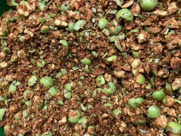 りんごの生育中に間引く摘果は、一つのりんごのために全体の約半分のりんごを間引かなければならず、その活用法を相談されていたのです。 小ぶりで色も鮮やかな黄緑色。食べてみるとまだまだ酸っぱく硬いものですが、糖度を計ると10度程度はあり、酸味の奥に甘さと果実味があることがわかります。 細かく砕いた後、はじめての材料ということもあり糖や酵素を加え、酵母にワイン酵母と日本酒用の酵母を使用しタンクを分け、発酵具合を比較することにします。