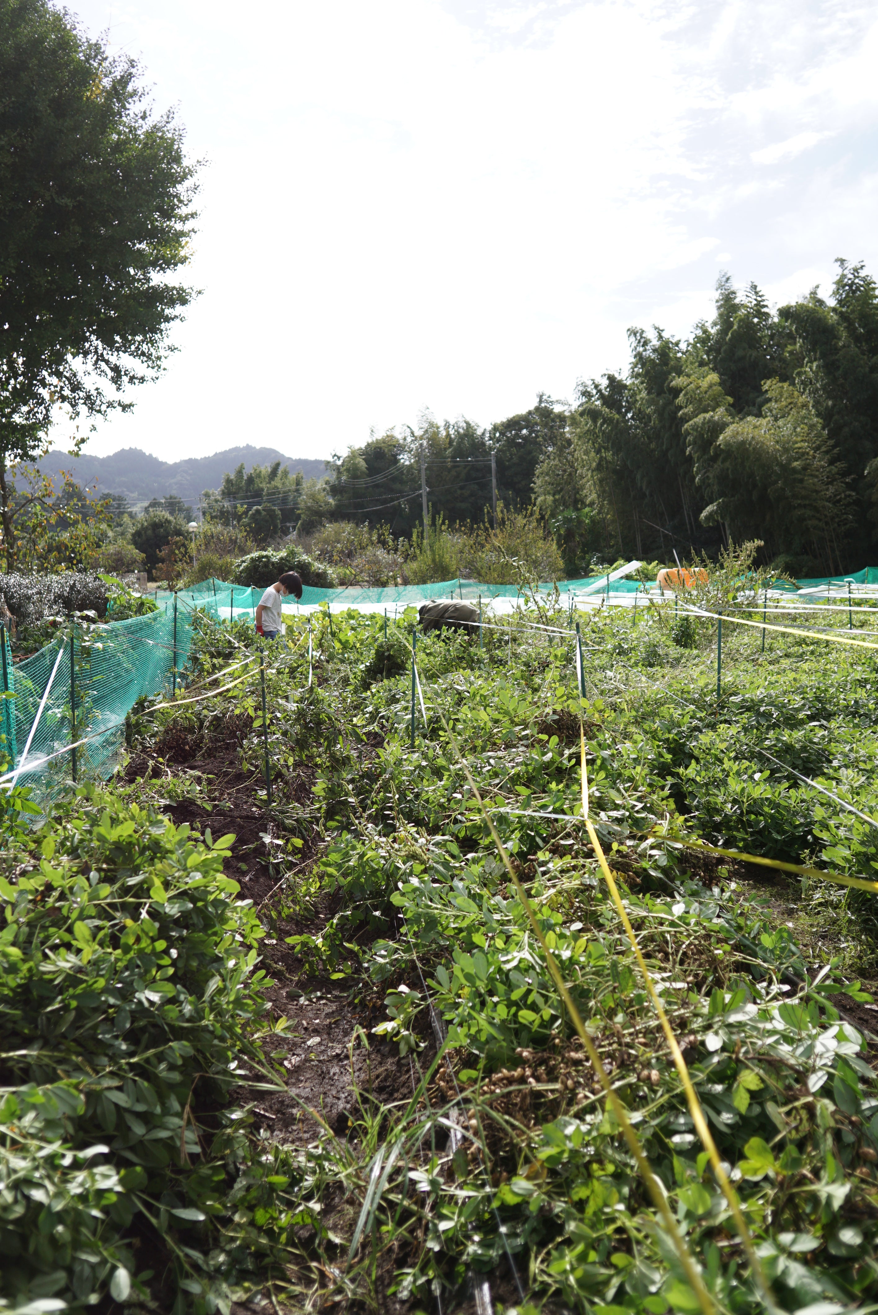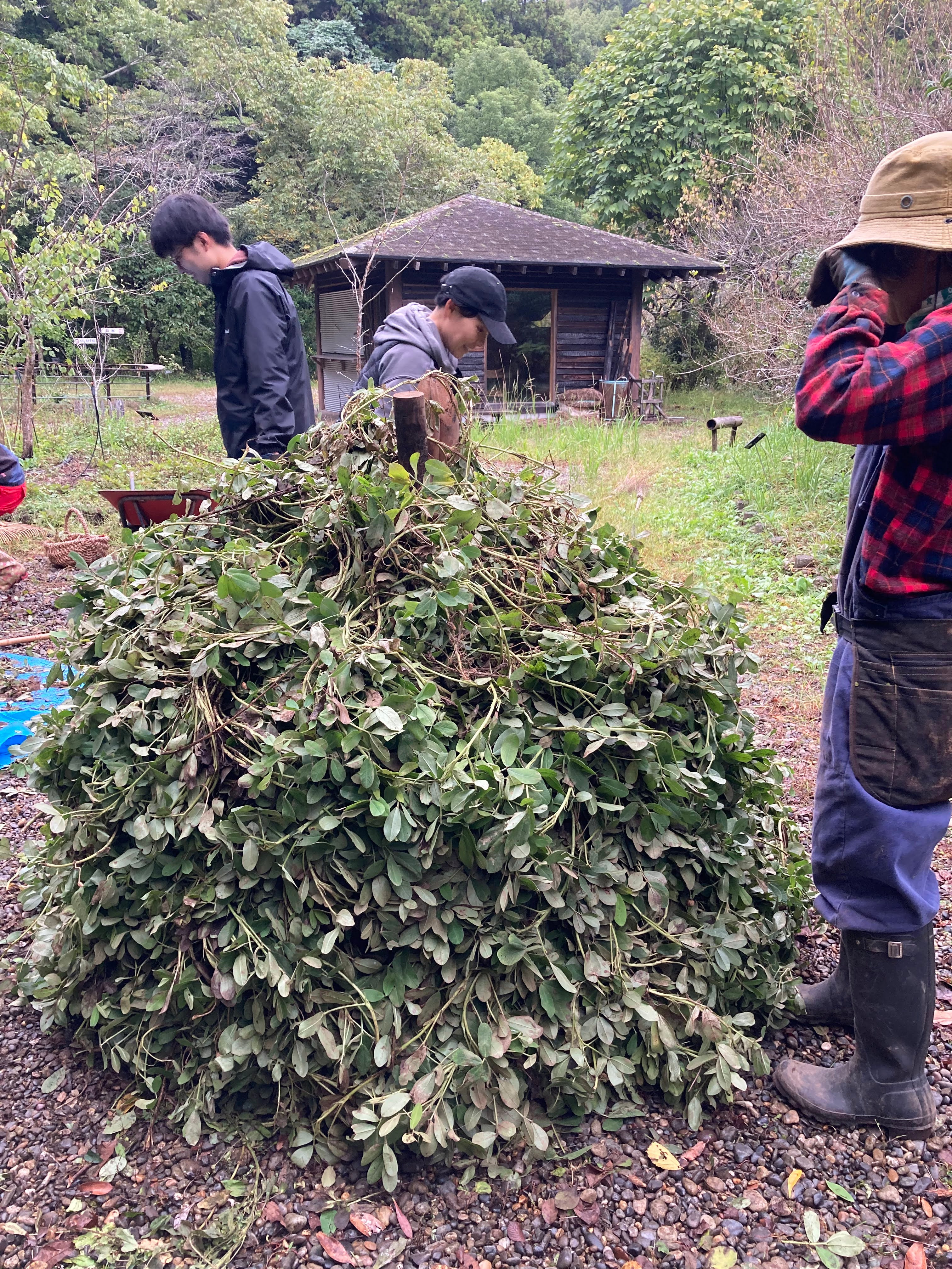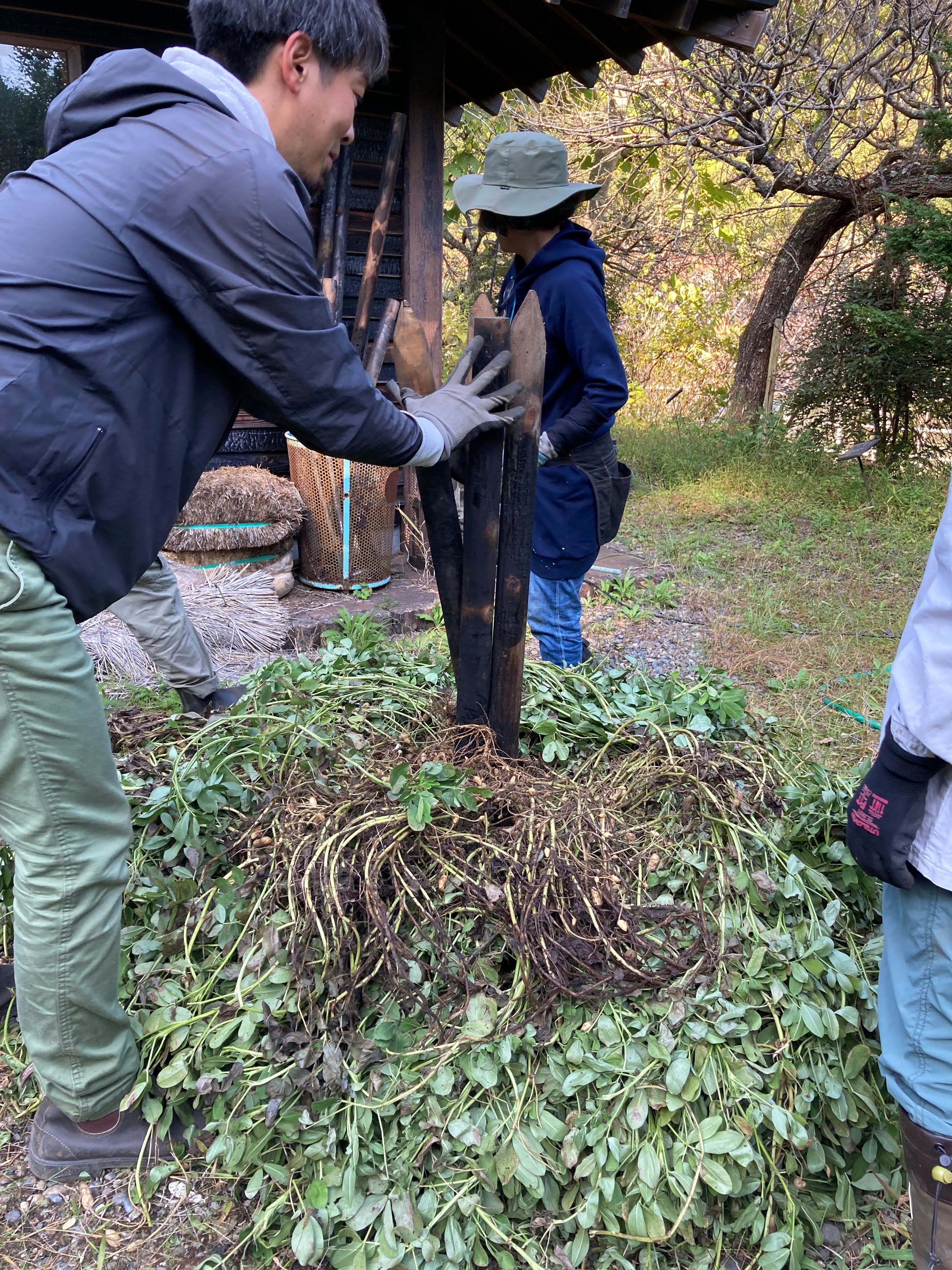 This is a distilled spirit made from Chiba's famous peanuts. The variety chosen is Chiba Hantaka, which, despite its small size, has rich flavor and sweetness, and is known as the king of peanuts. Chiba Hantaka grown in Otaki is harvested and sun-dried. A few days later, together with participants of FARMING FRIDAY, we made "bocchi." Bocchi is a method of piling up peanuts for drying and aging. Stems and leaves are placed on the outside, pods on the inside, creating gaps for ventilation as they are stacked into cylindrical shapes. After about a month, the height of the bocchi is reduced to about two-thirds, bitterness is removed as the nuts dry, and starch turns into sugar, increasing sweetness. After selecting only the nuts, shelling them, and extracting the kernels, they are roasted over an open flame. The kernels are then soaked in spirits and distilled, followed by a two-year aging period in oak barrels. Although the harvested peanuts originally filled the truck bed, after drying, aging, and distillation, only a small amount of product remains, but it is packed with the condensed deliciousness of peanuts. Enjoy the light, toasty aroma and deep flavor of this unique local distilled spirit.