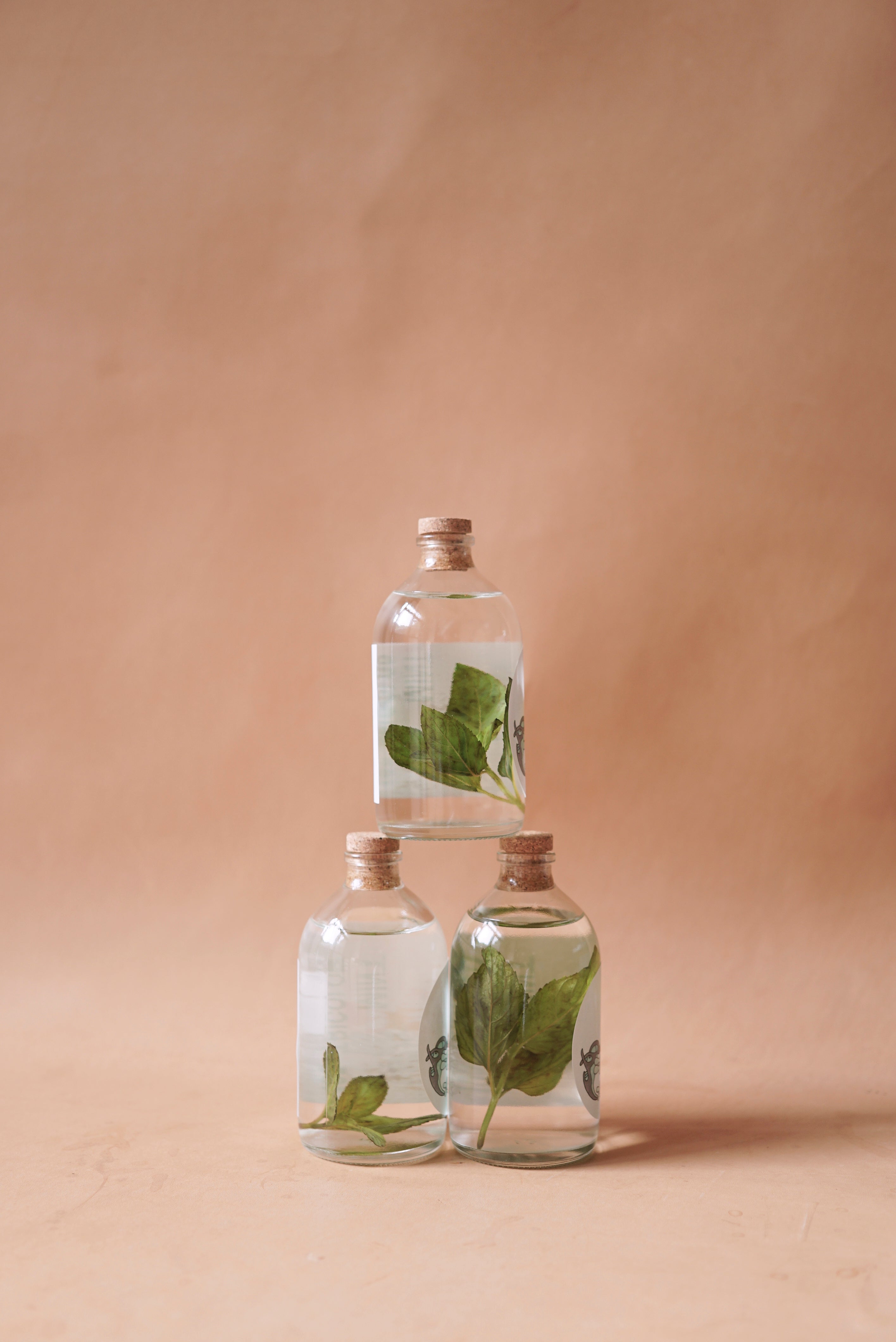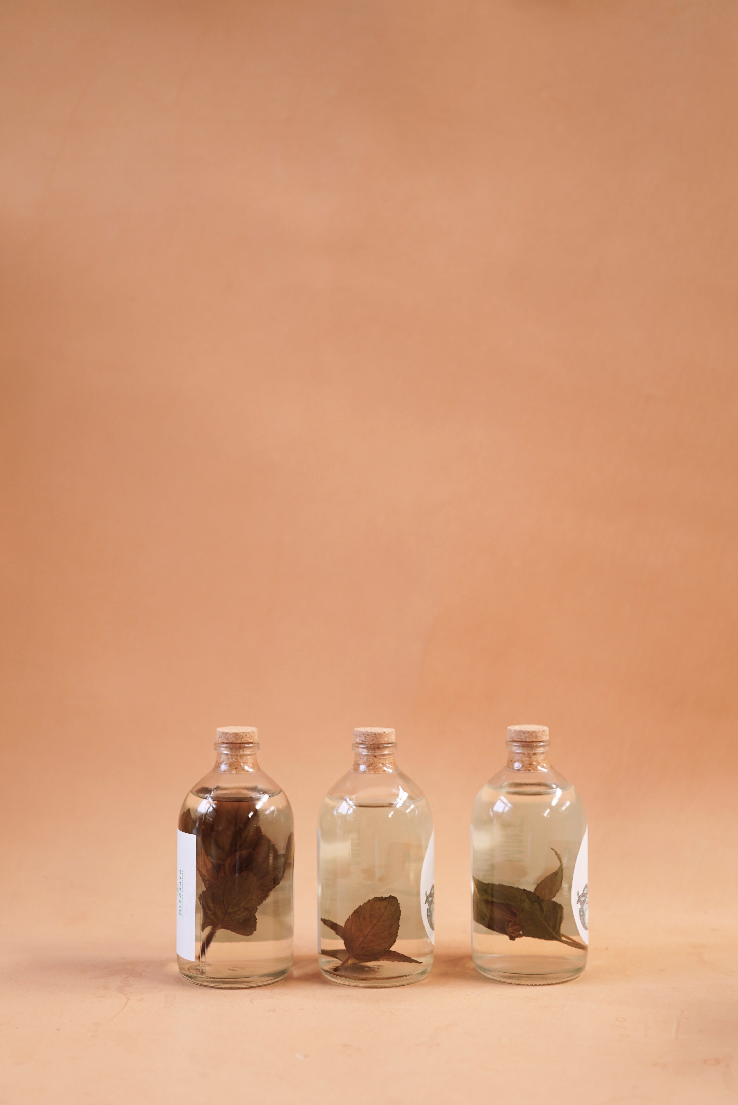 ミニボトルは3種のミント単独のスピリッツをボトリングしました。。同じミントの香りと味わいのバリエーションを楽しんでいただける3本セットです。フレッシュなそれぞれれの葉がボトルに沈みます。