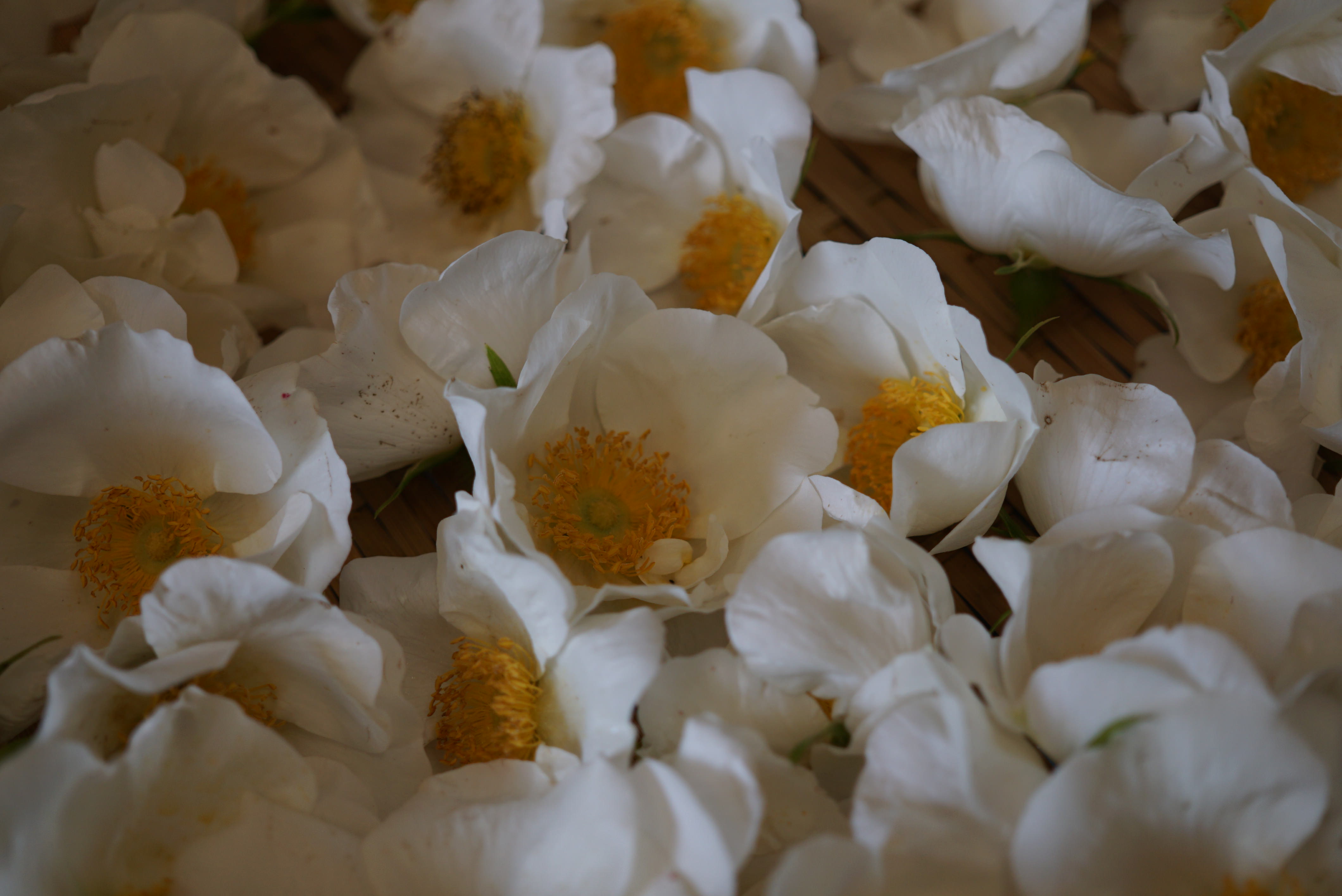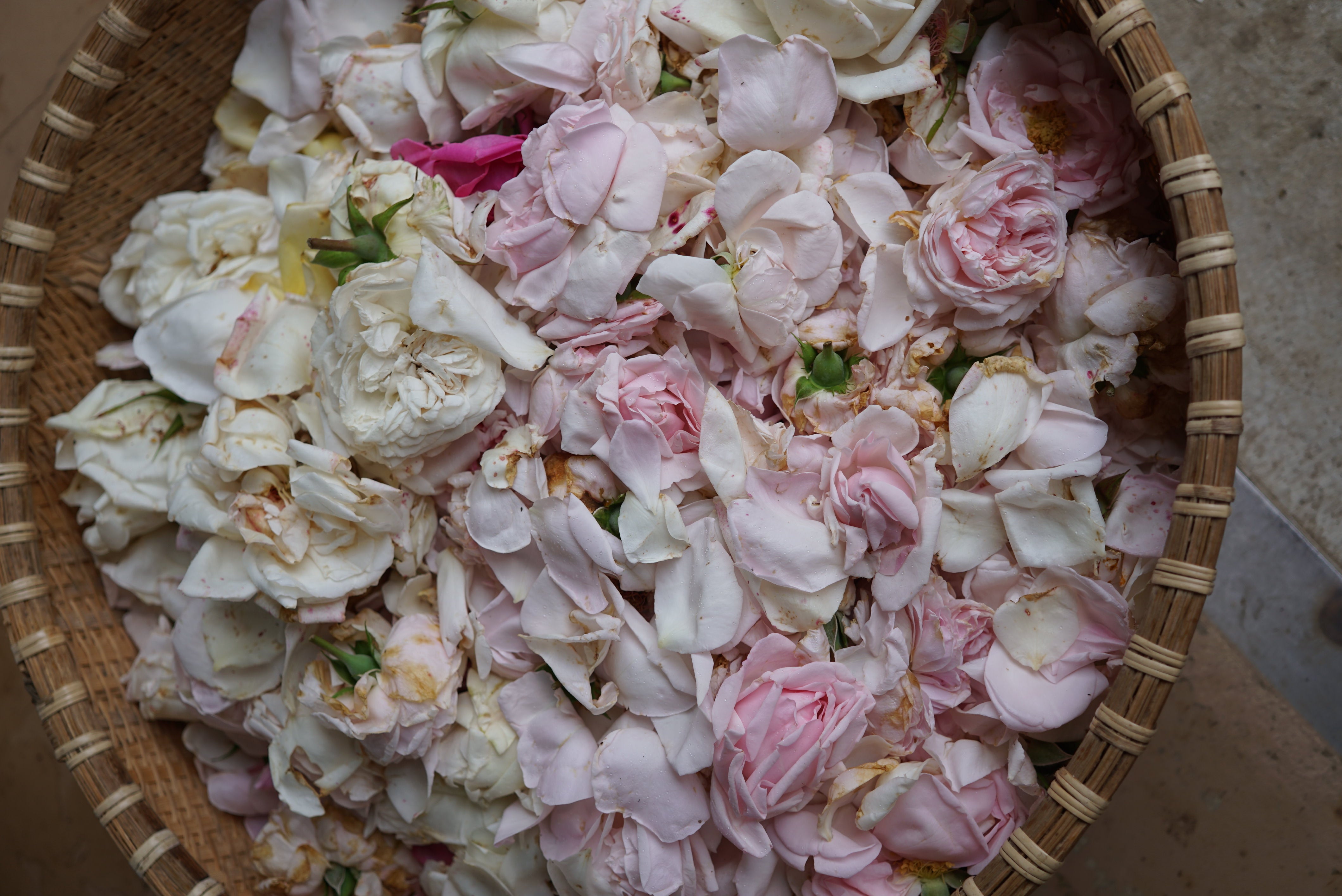 Half of the roses were soaked in fine white sugar or icing sugar, and half in lightly barrel-aged brandy and rice spirits to extract the ingredients by osmosis alone, with no heat applied.