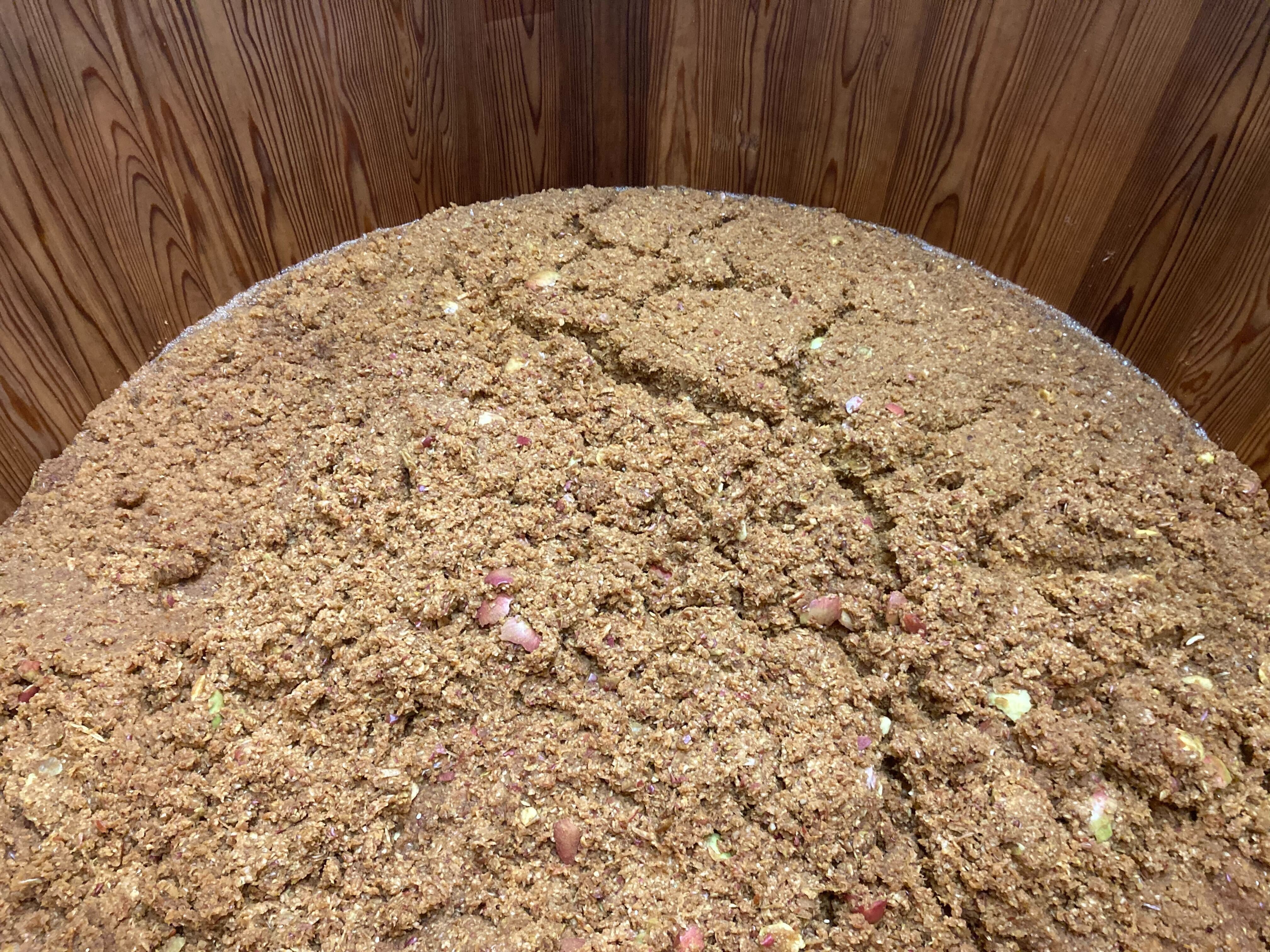 From the beginning of December until the beginning of the new year, 1600 kg of apples are slowly fermented in wooden vats, turning the sugar into alcohol, before being distilled in 10 parts.