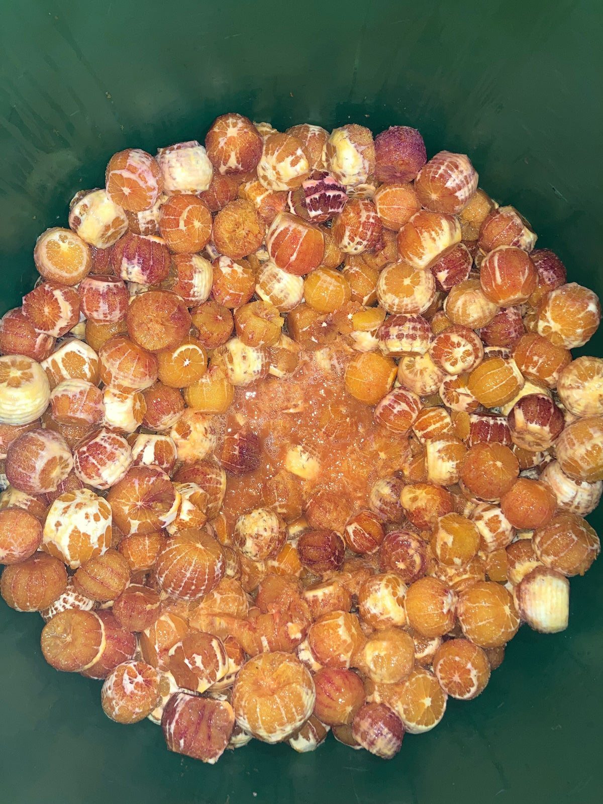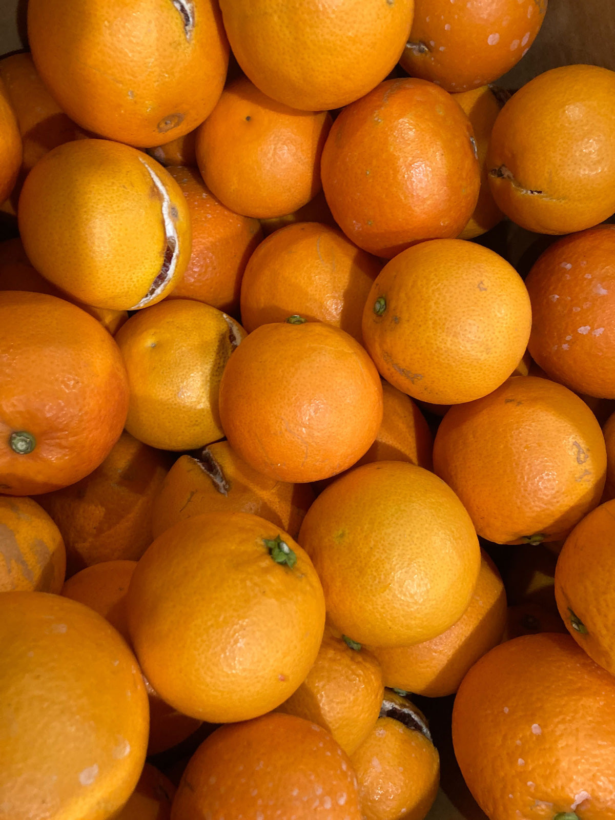 We peeled the fruit and combined the whole oranges with freshly pressed juice in a tank, allowing carbonic maceration to coax out bright, fruity aromas. After about a week, we gently crushed about 70% of the fruit and stirred the mixture to start vigorous fermentation. With no added sugar, we let it ferment naturally for about a month before distilling.
