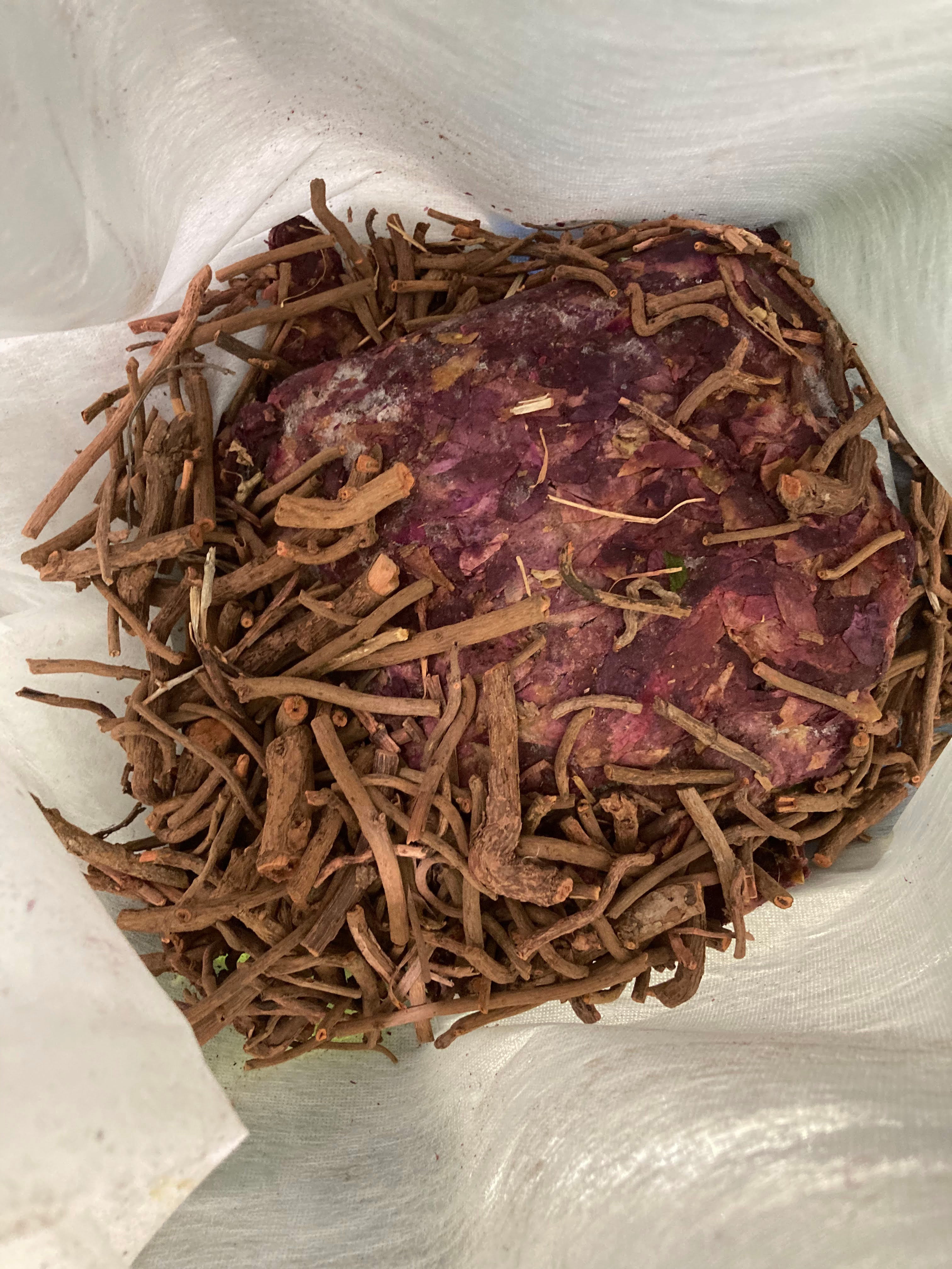 The characteristic ruby-red color is a hint to explore the ingredients, but it is better to think that the red color was used for a reason rather than for the sake of the red color. The ingredients used were root of Akane, which has medicinal properties, Hamanasu flowers, which have the fragrance of rose flowers, and cochineal.