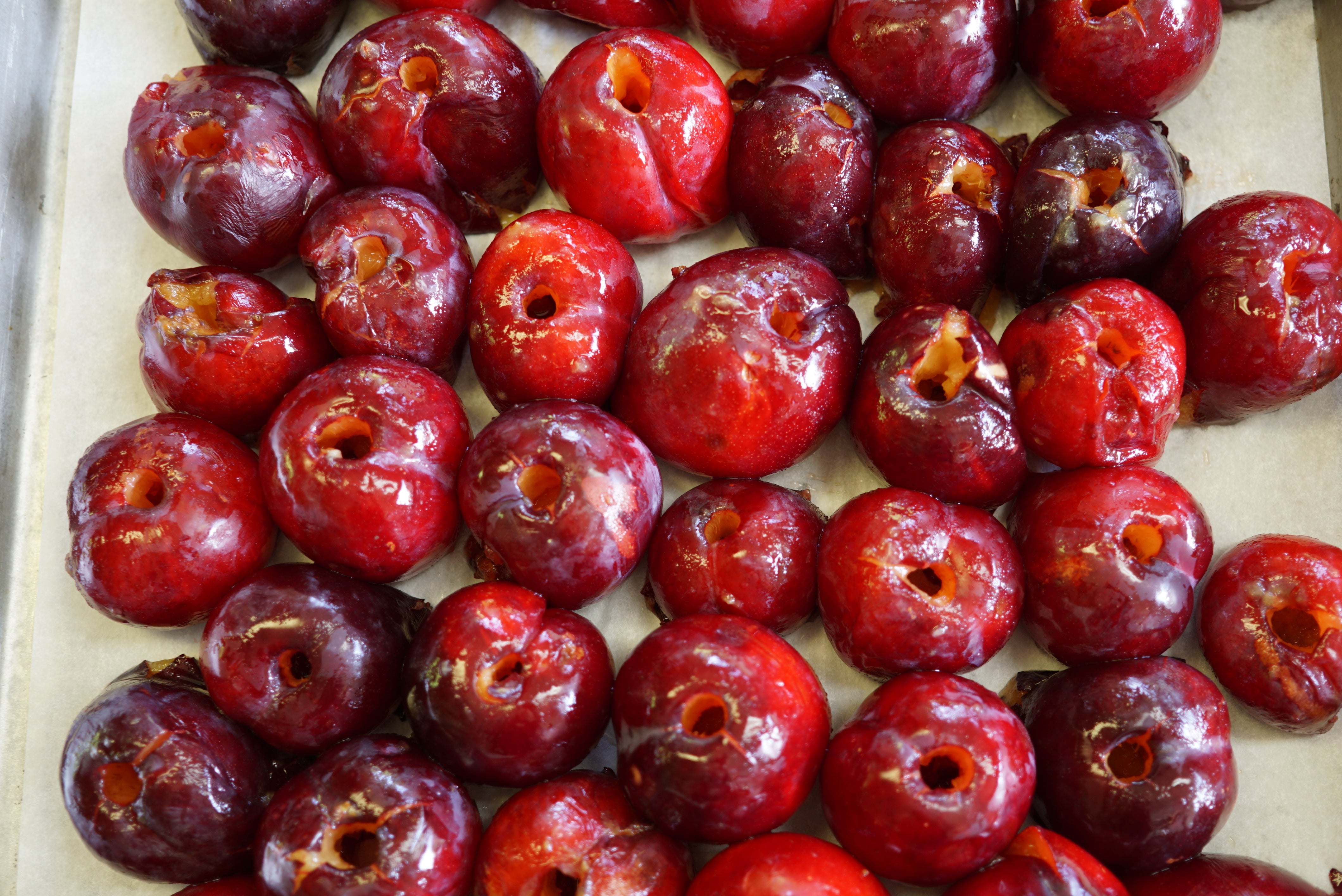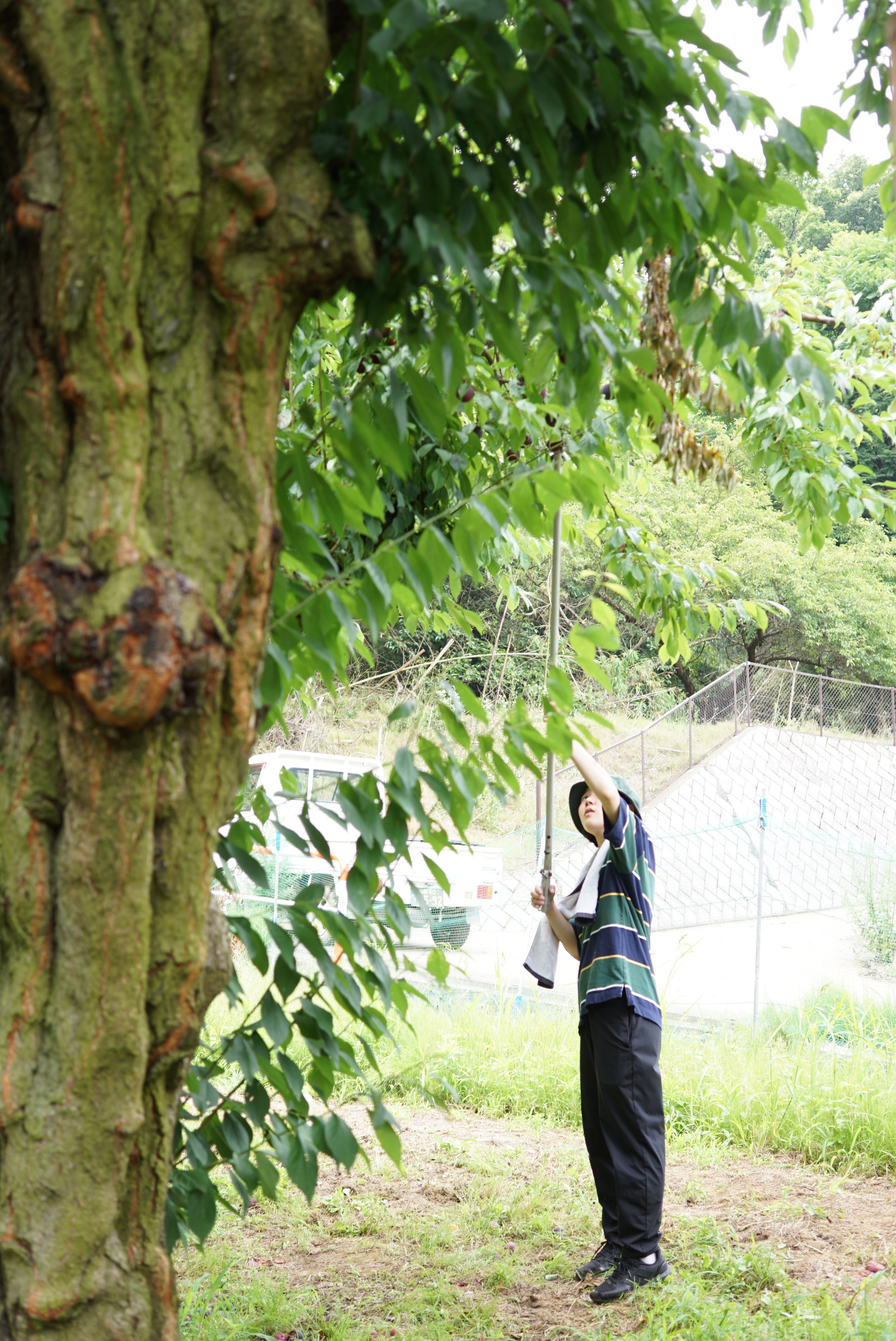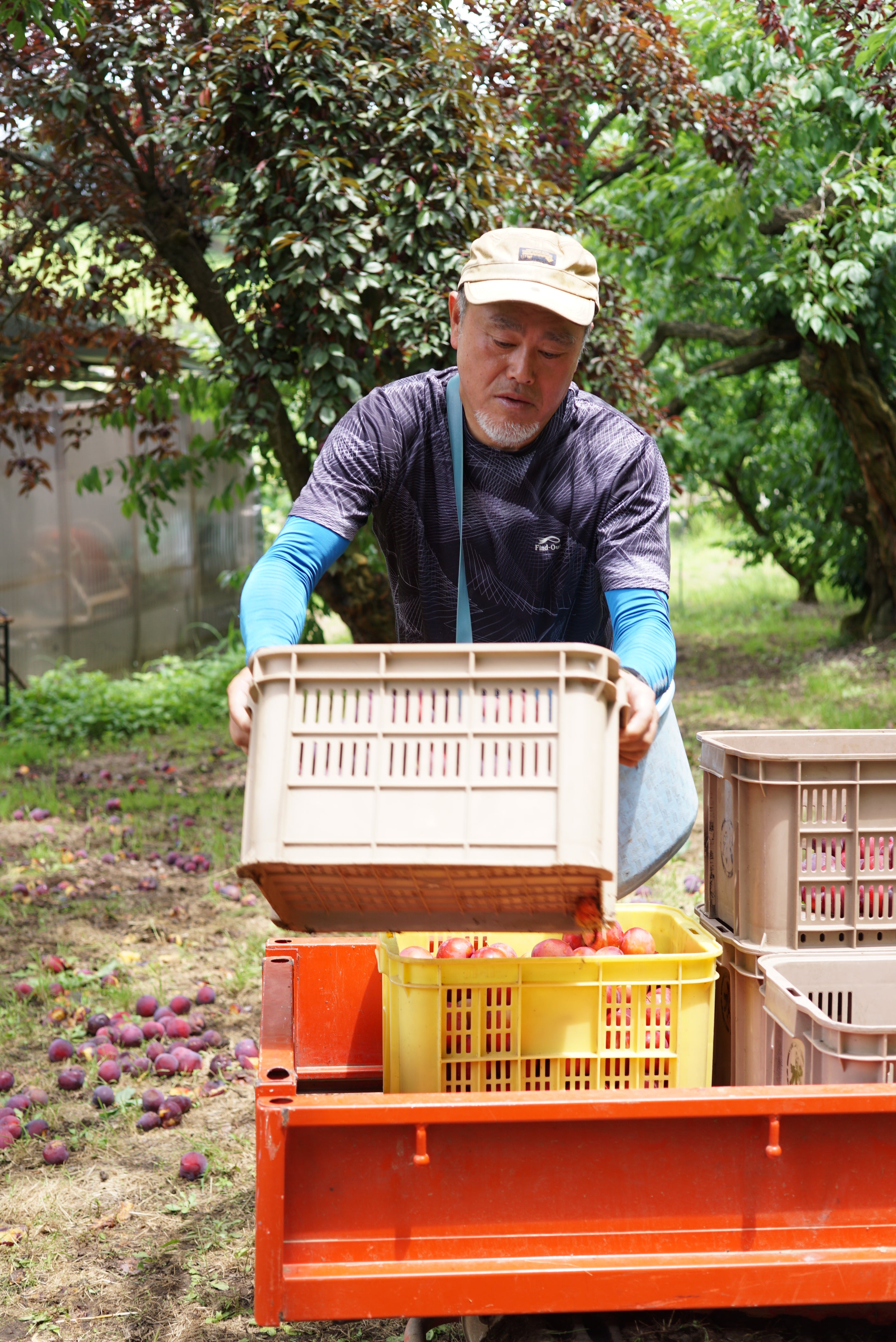 The large, ripe, and almost ripe fruits left over after the regular shipment are harvested are hand-pulled one by one on a stepladder. About 500 kg of plums are harvested. The hairy epidermis is covered with yeast, which is gently crushed and then brewed with natural yeast.