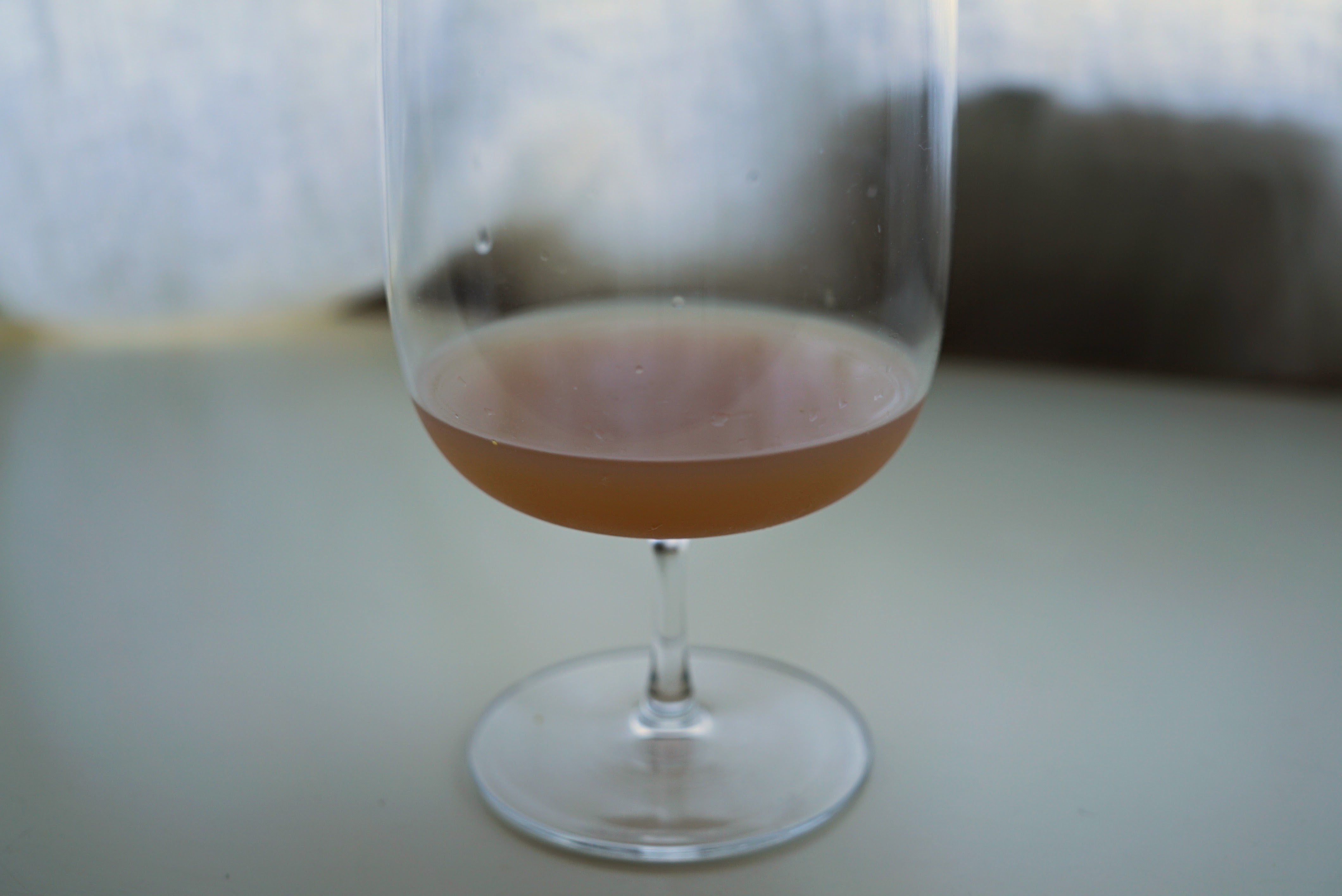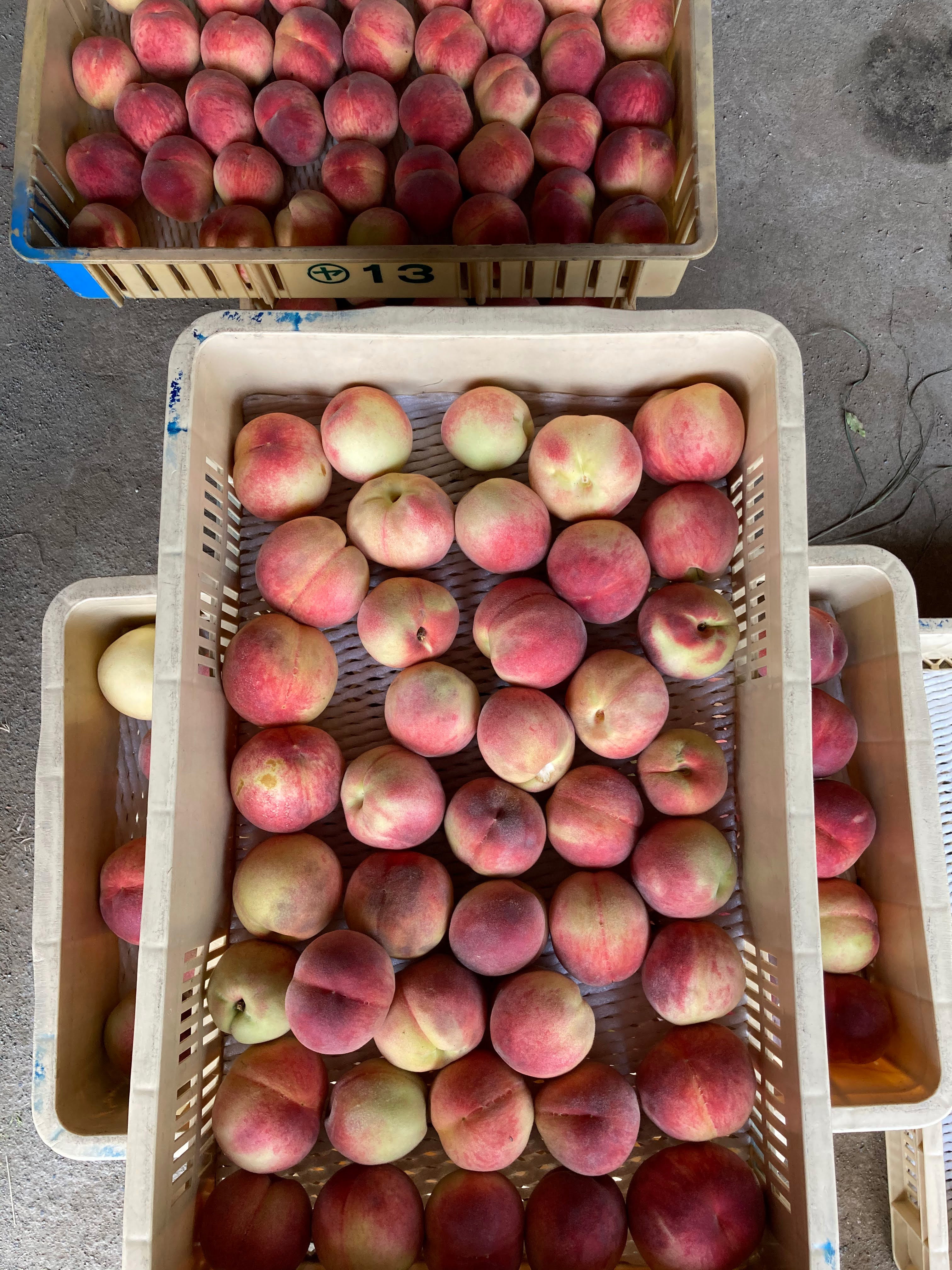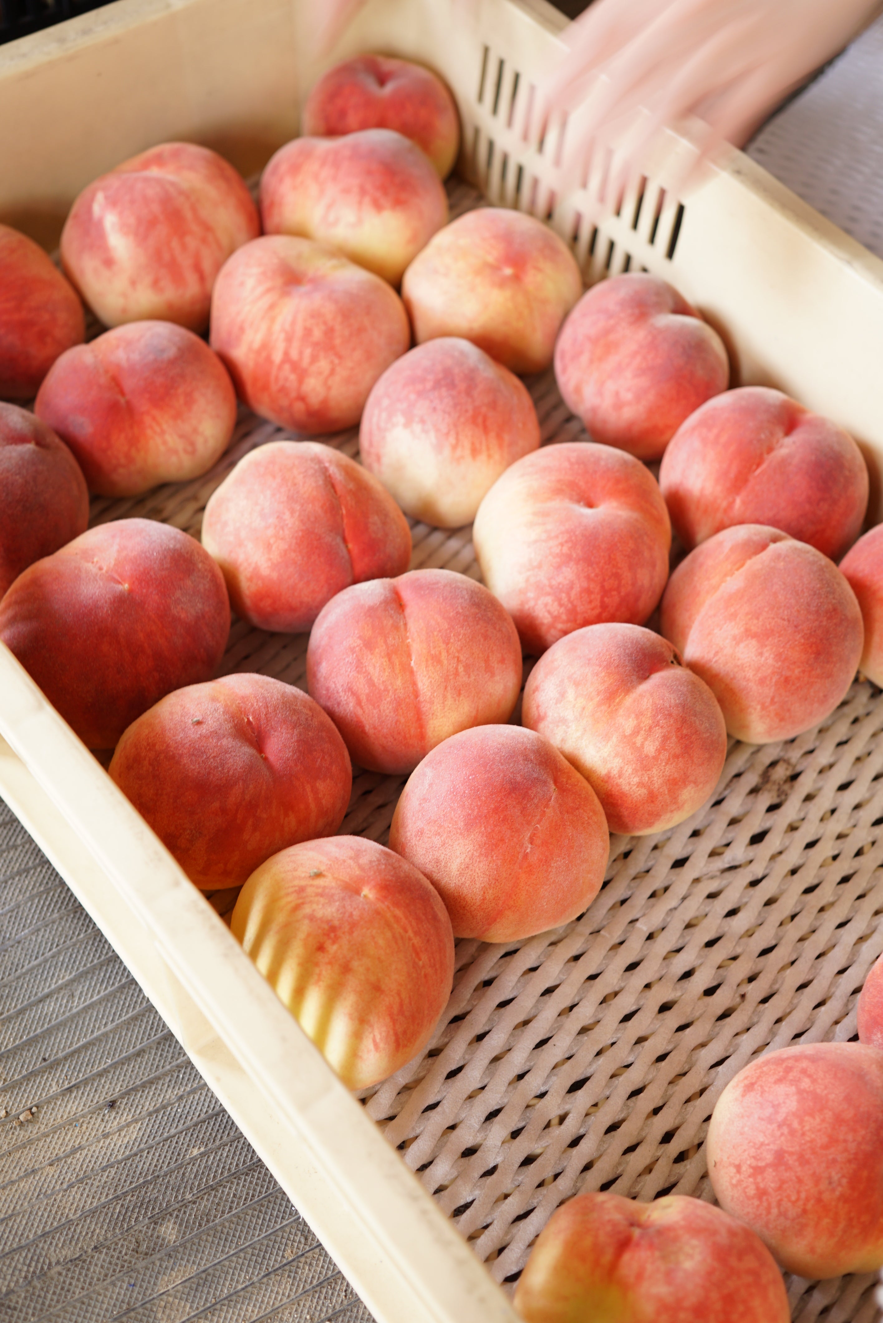 用いた桃は、山梨県笛吹市一宮町にある岩間農園の日川白鳳(ひかわはくほう)。フルーツ王国山梨県の中でも、扇状地にあるこの地域は日当たりとともに排水も良好で、桃の生産の最適地として知られています。昨年6月、岩間農園にお邪魔して、100キロの桃を引き取らせてもらいました。日差しをたっぷり受けた果実を天然酵母で2週間の醸造の後蒸留。一年間ガラスフラスコで10ヶ月間熟成したオードヴィーは香りの密度高く、透明感のある味わいが特徴。