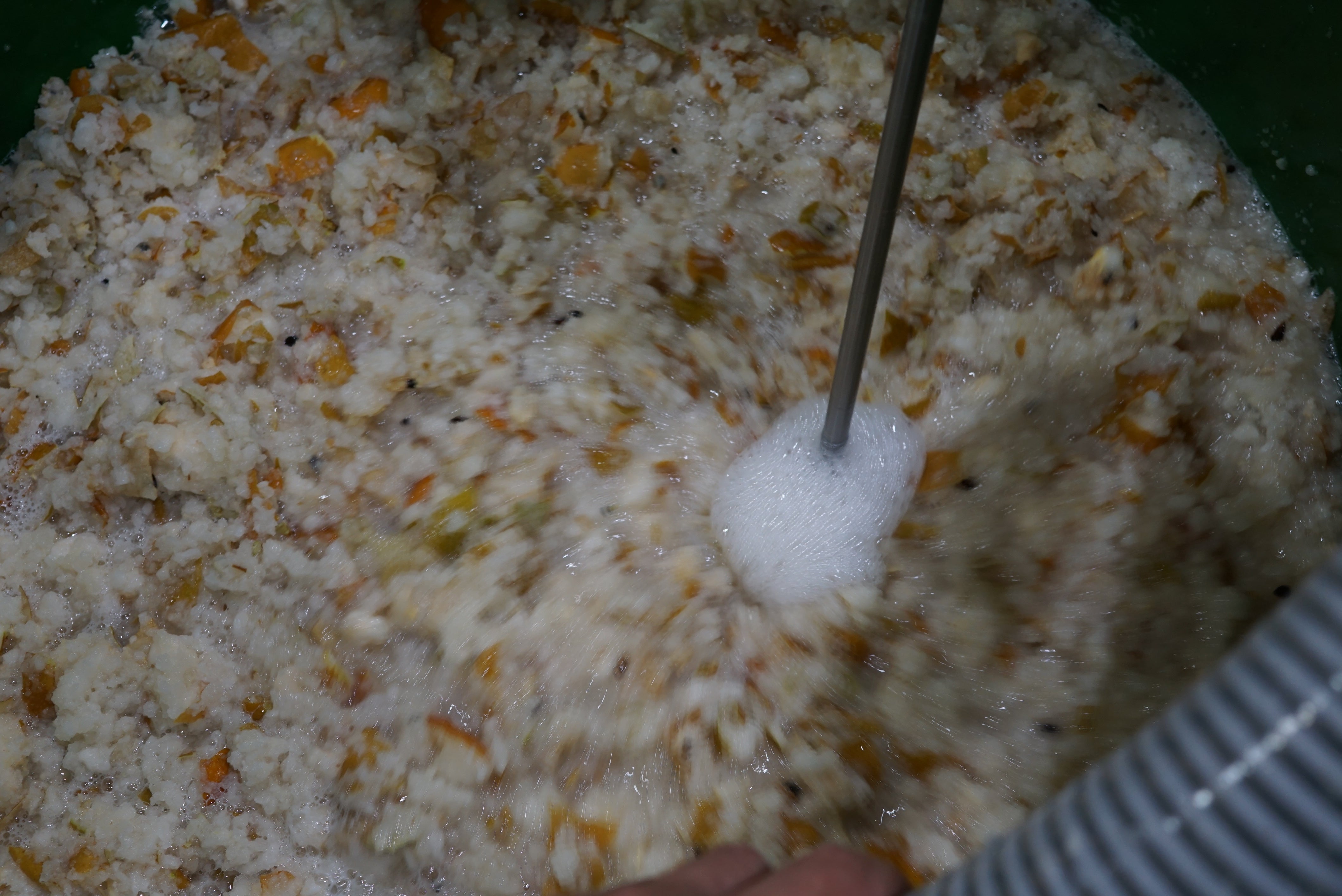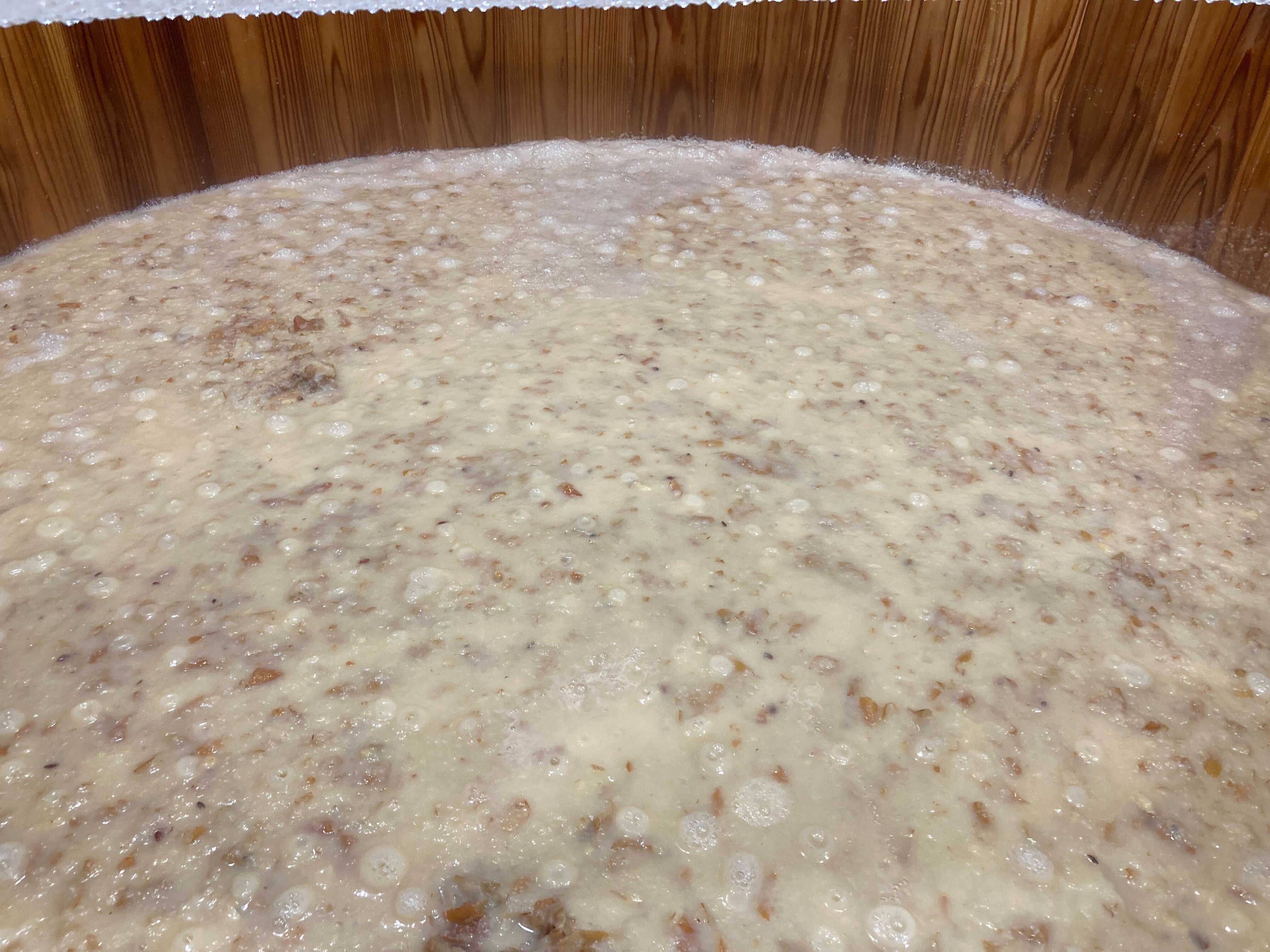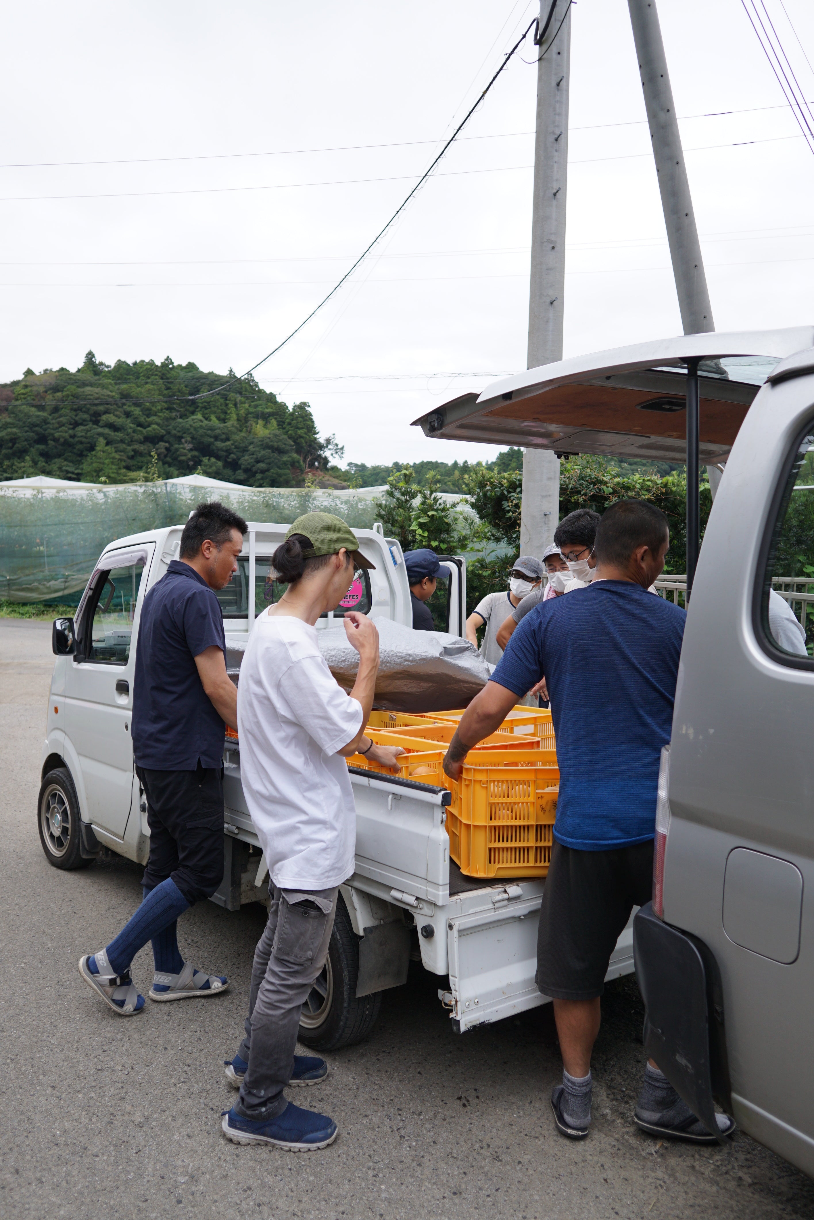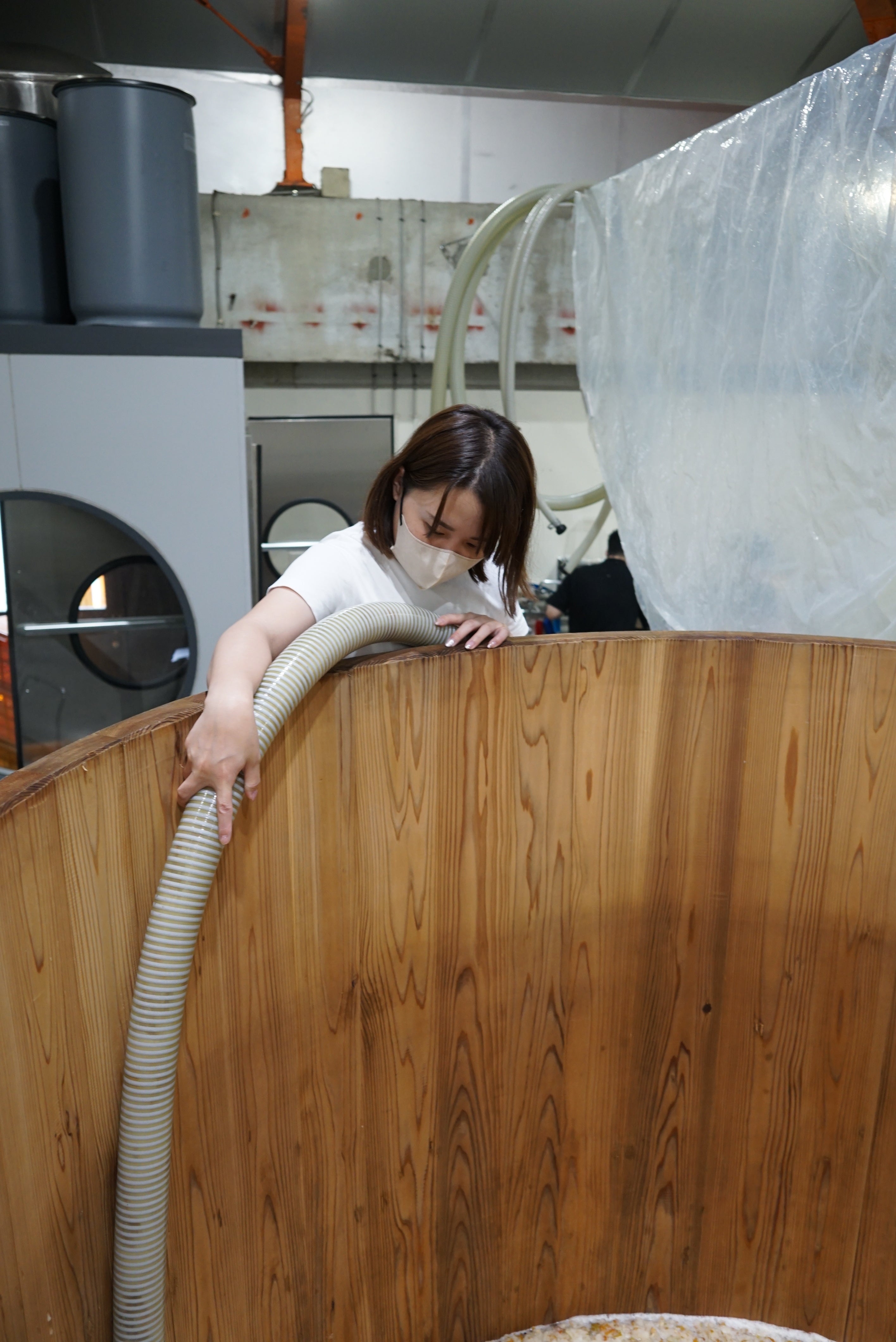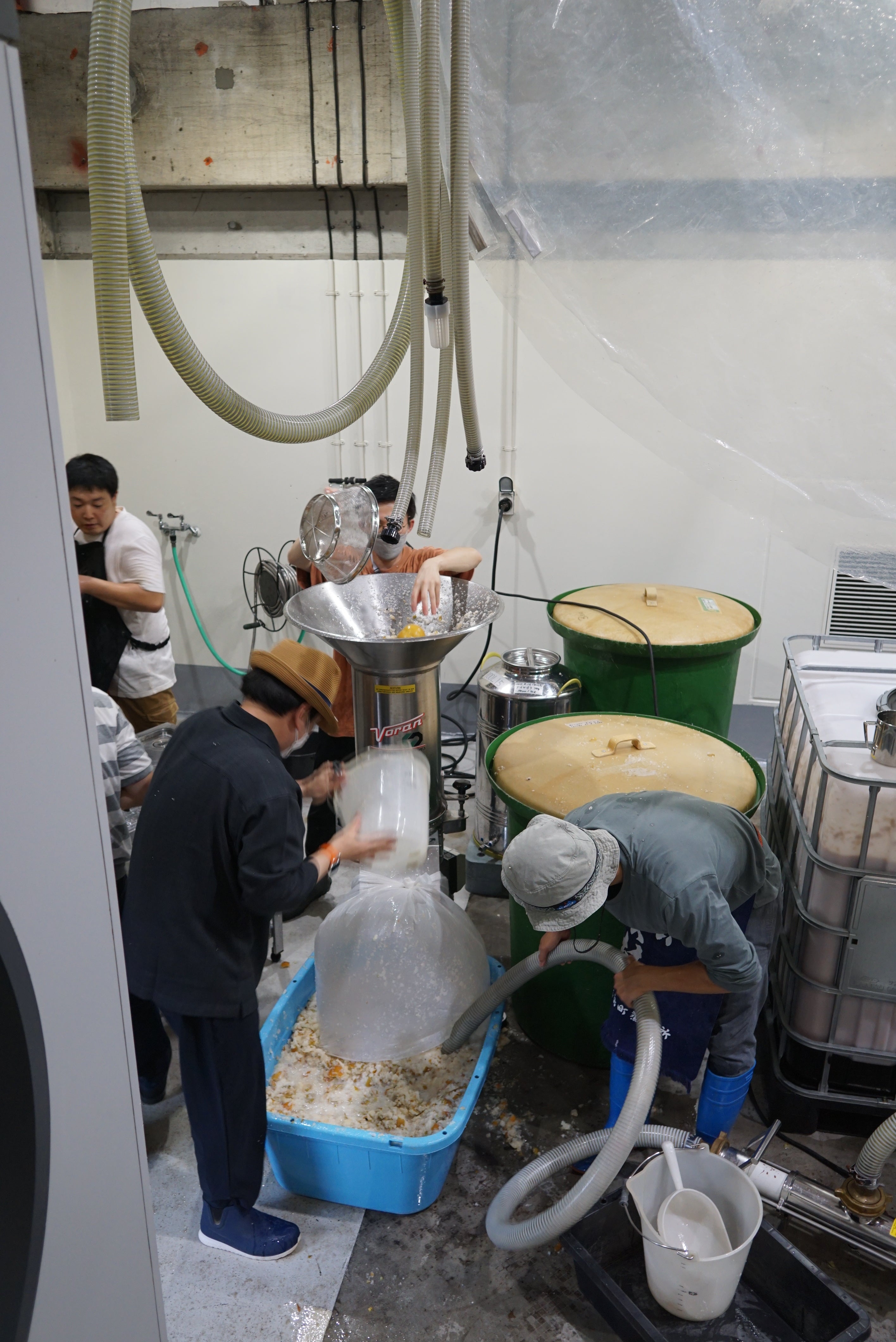 若手農家が集まり、朝に収穫したものをコンテナに集め、夕方に運びこむ。その量2.2トン。木桶に入れると爽やかな杉香と共に旺盛な発酵が始まります。3週間の発酵の後、回数を分けてていねいに蒸留しました。