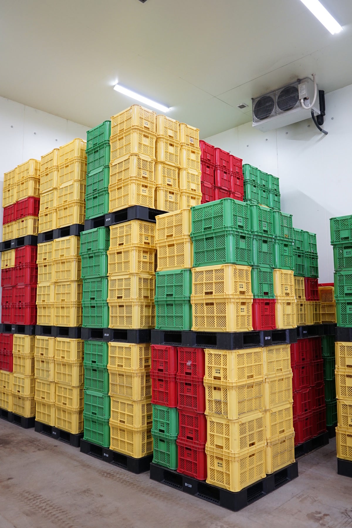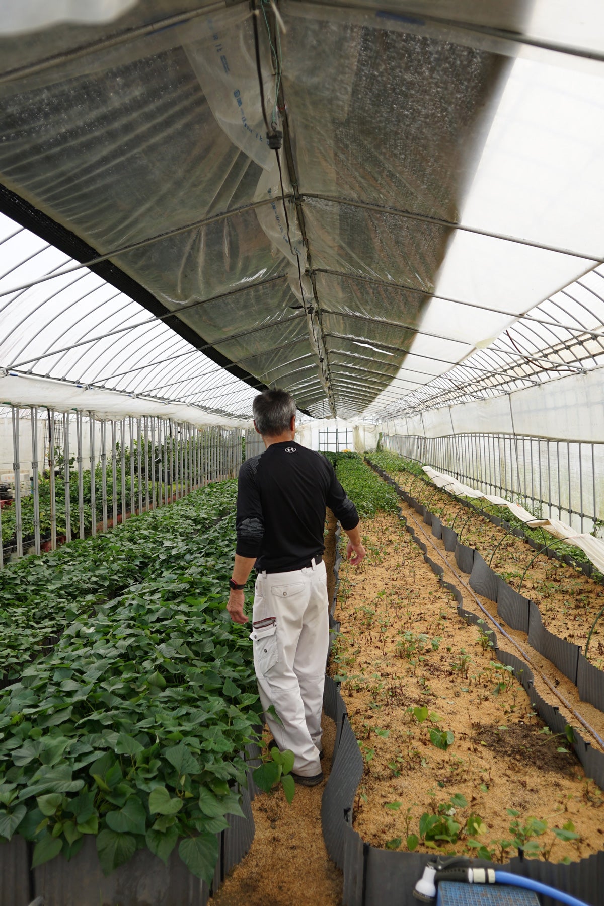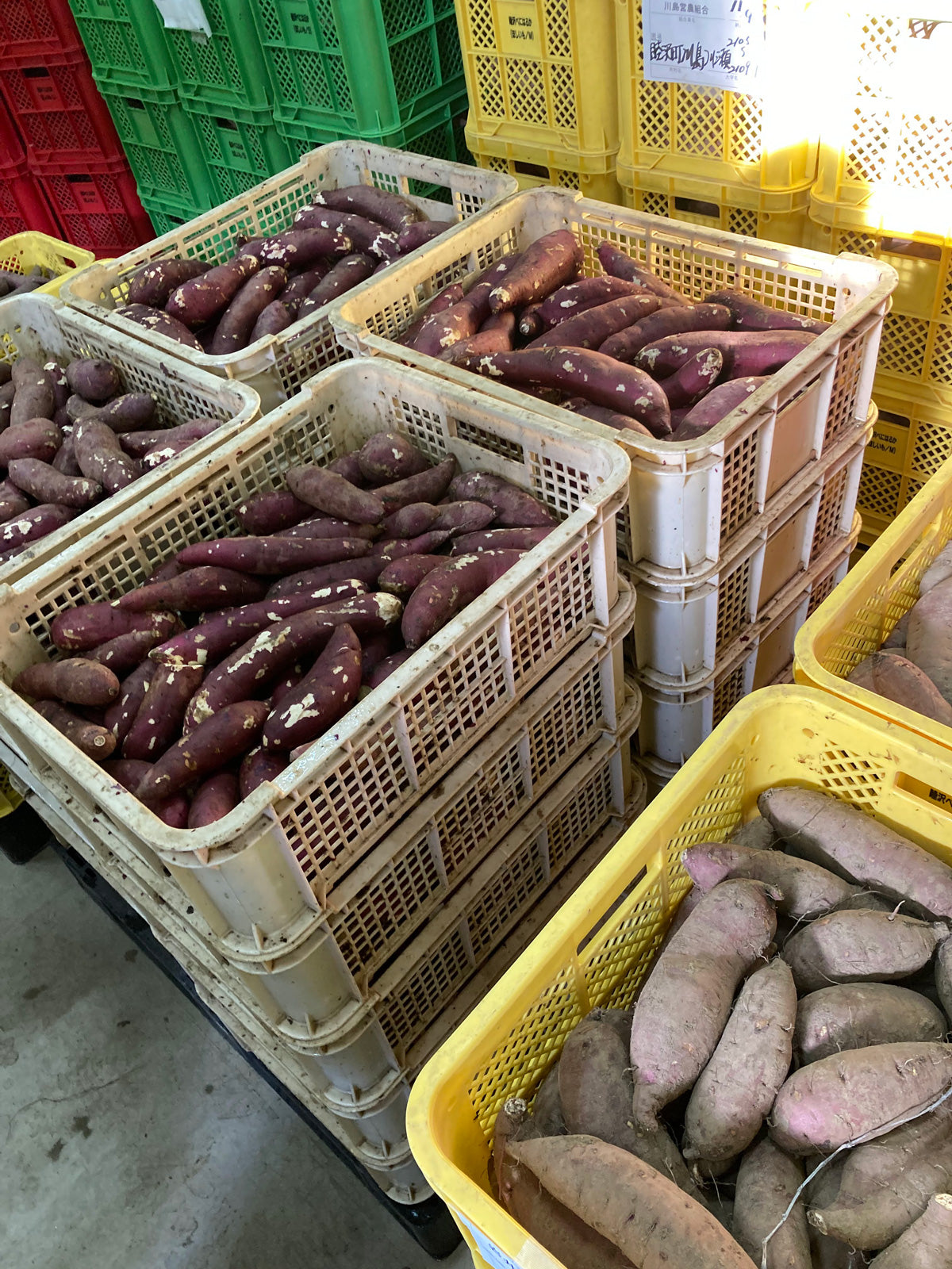 紅はるかは春の終わりから植えられ、約5ヶ月間かけて栽培され秋から冬に収穫されます。収穫時の糖度は約9度。低温度・高湿度の環境の冷蔵保管庫で熟成することで糖度は14度まで上がります。その後、洗浄・選別され、地元の天然ガスを使って蒸されます。蒸したさつまいもの皮をナイフでむき、スライスしてから平置きで乾燥させます。