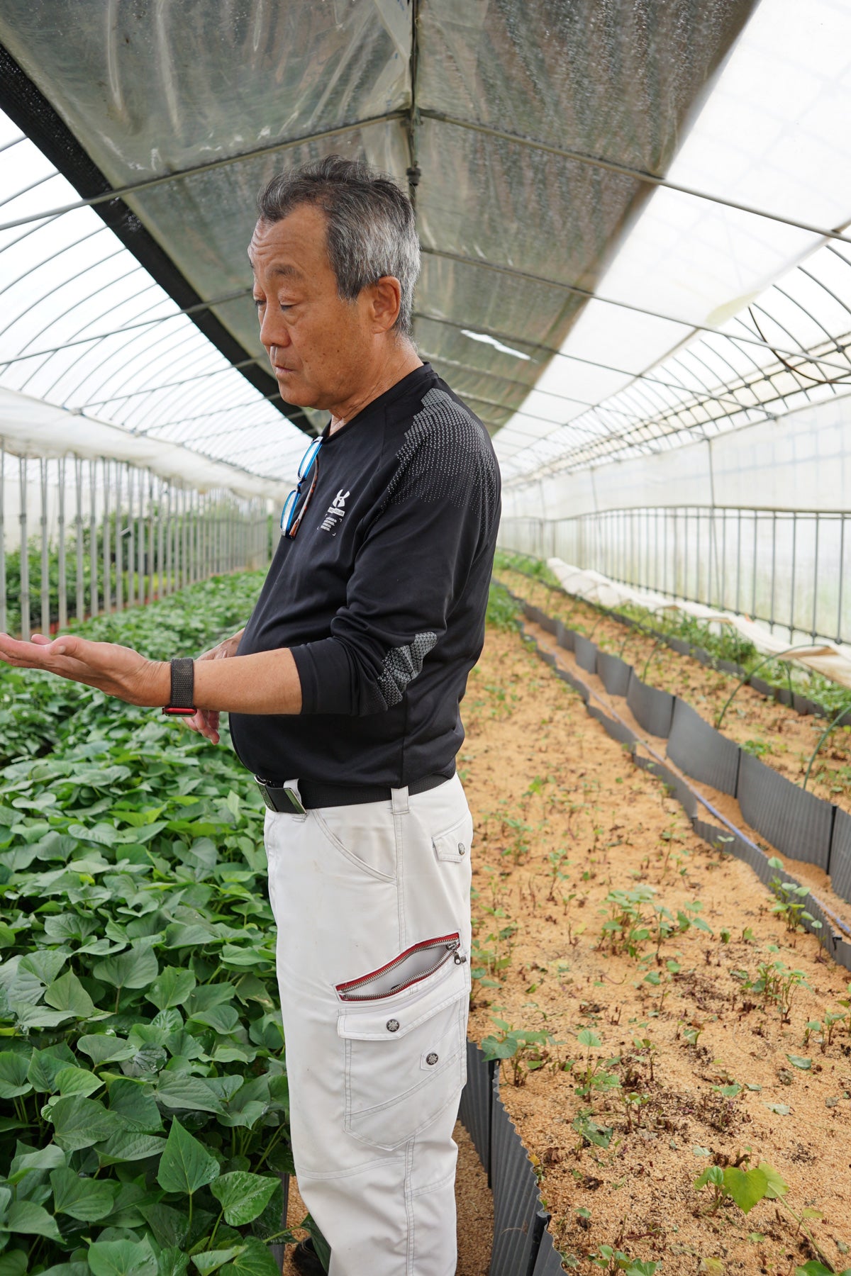 紅はるかは春の終わりから植えられ、約5ヶ月間かけて栽培され、秋から冬に収穫されます。収穫時の糖度は約9度。低温度・高湿度の環境の冷蔵保管庫で熟成することで糖度は14度まで上がります。