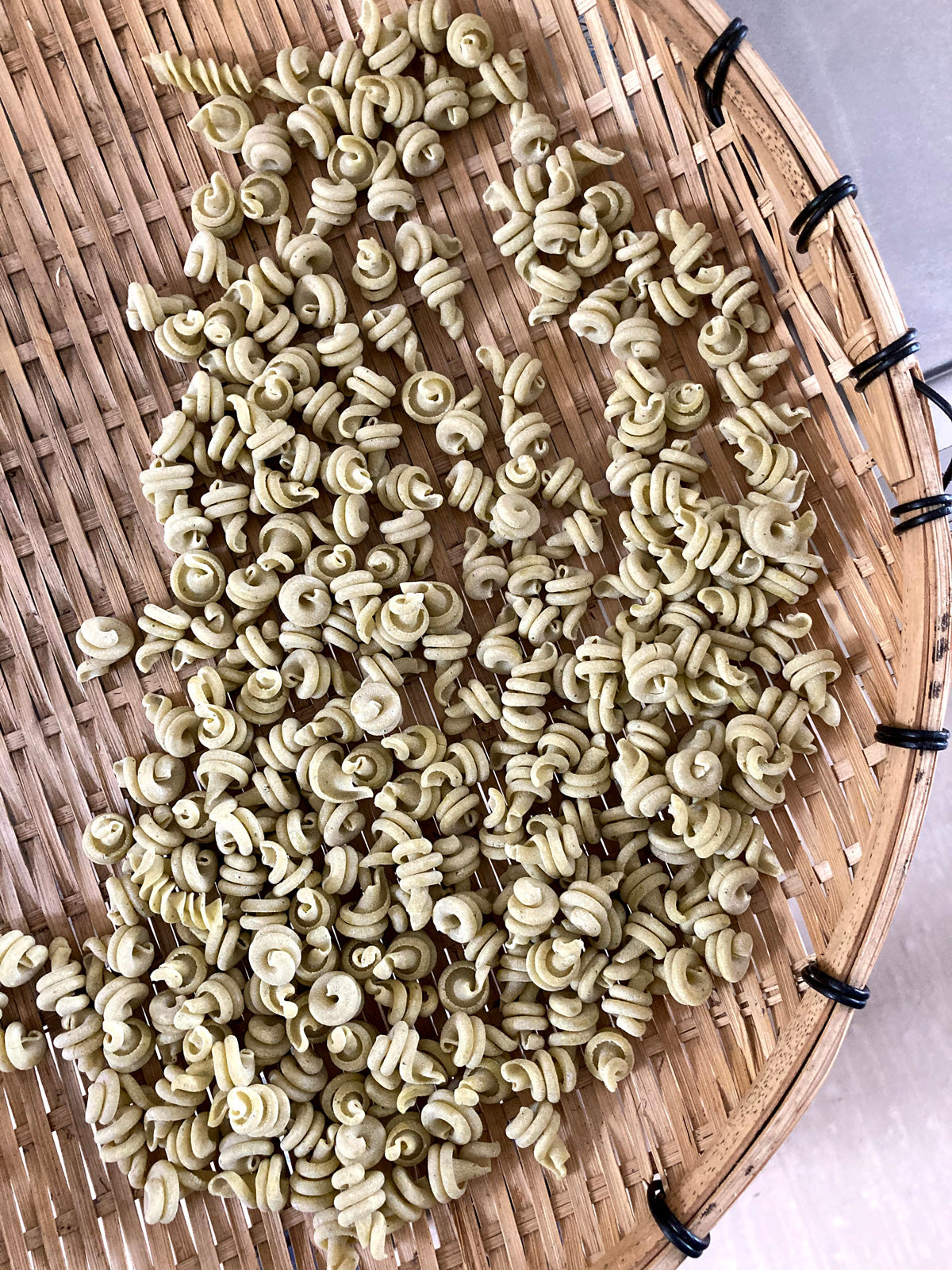 Pastificio Suginoに、mitosayaで採れたフレッシュなハーブを練り込んだパスタを作ってもらいました。せっかくならば長く楽しめるものにしようと、パスタセッカ(乾燥麺)にしました。配合や乾燥時間・温度などを試行錯誤した結果できたのが、ローリエのリガトーニ、ローズマリーのカンパネッレ、フェンネルのマファルディーネの3種のショートパスタです。
