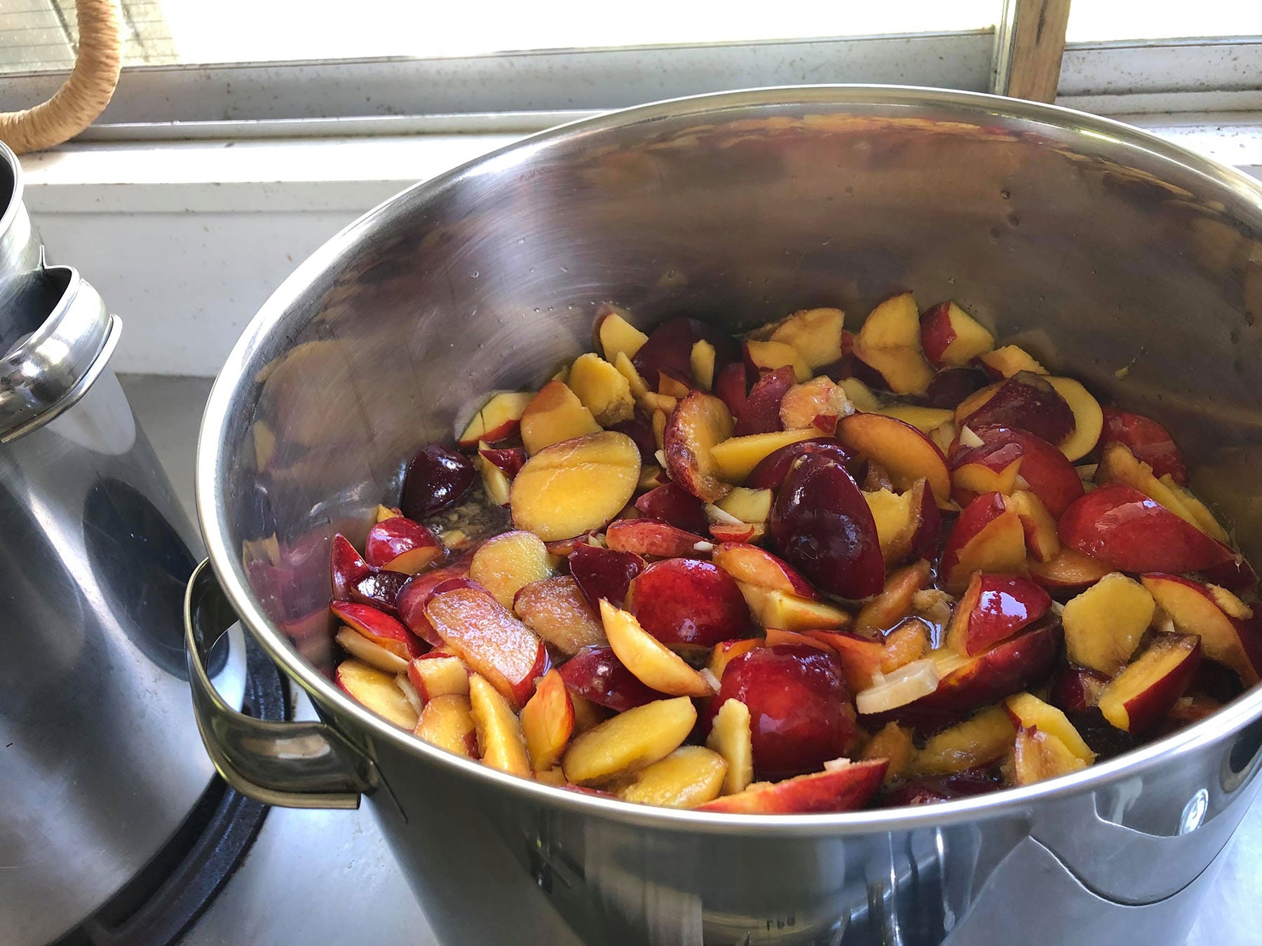The nectarines that came in early summer were made into nectar with both the fruit and the rind, but now they are ready to be combined with the figs that came later to make jam.