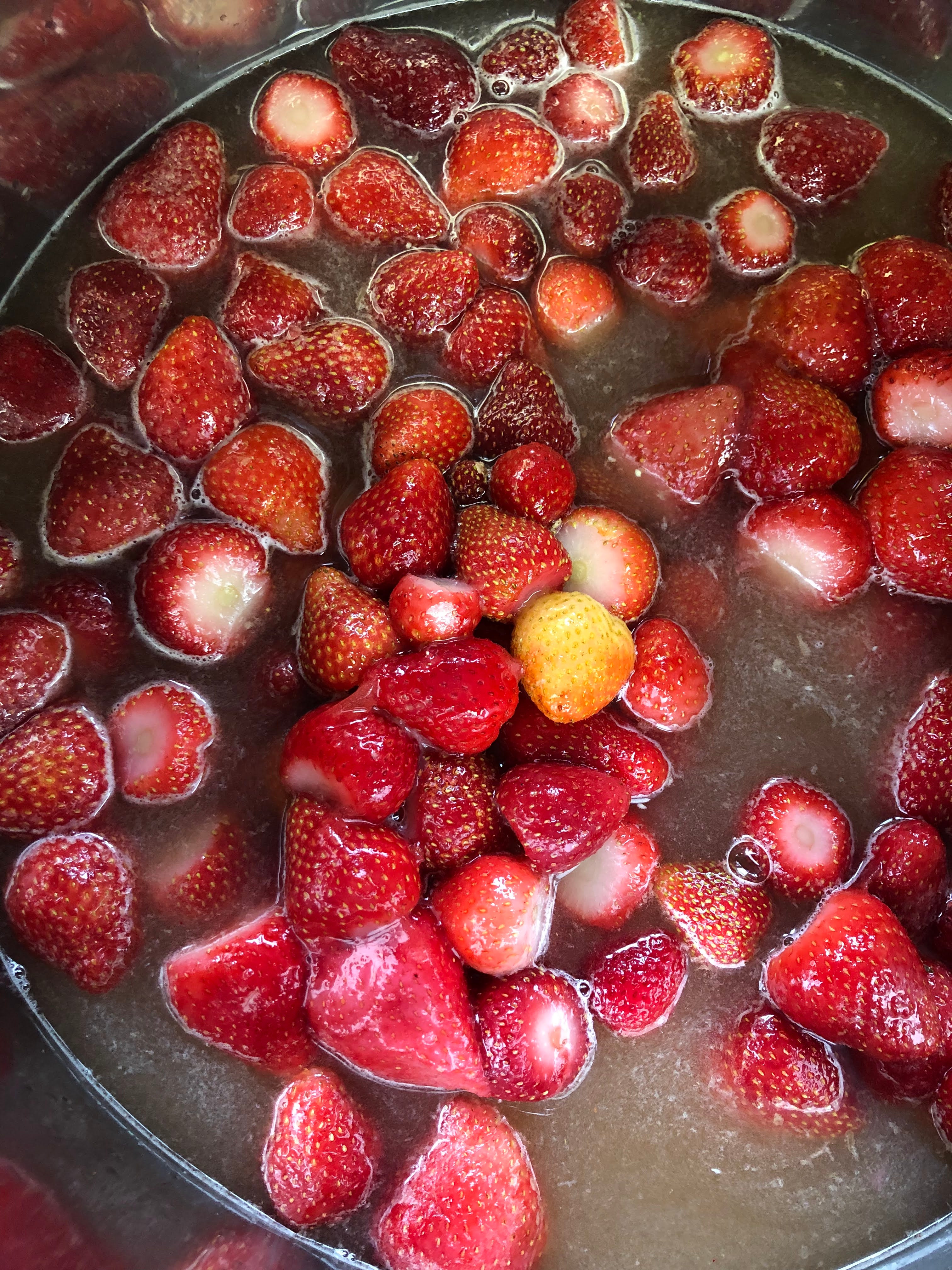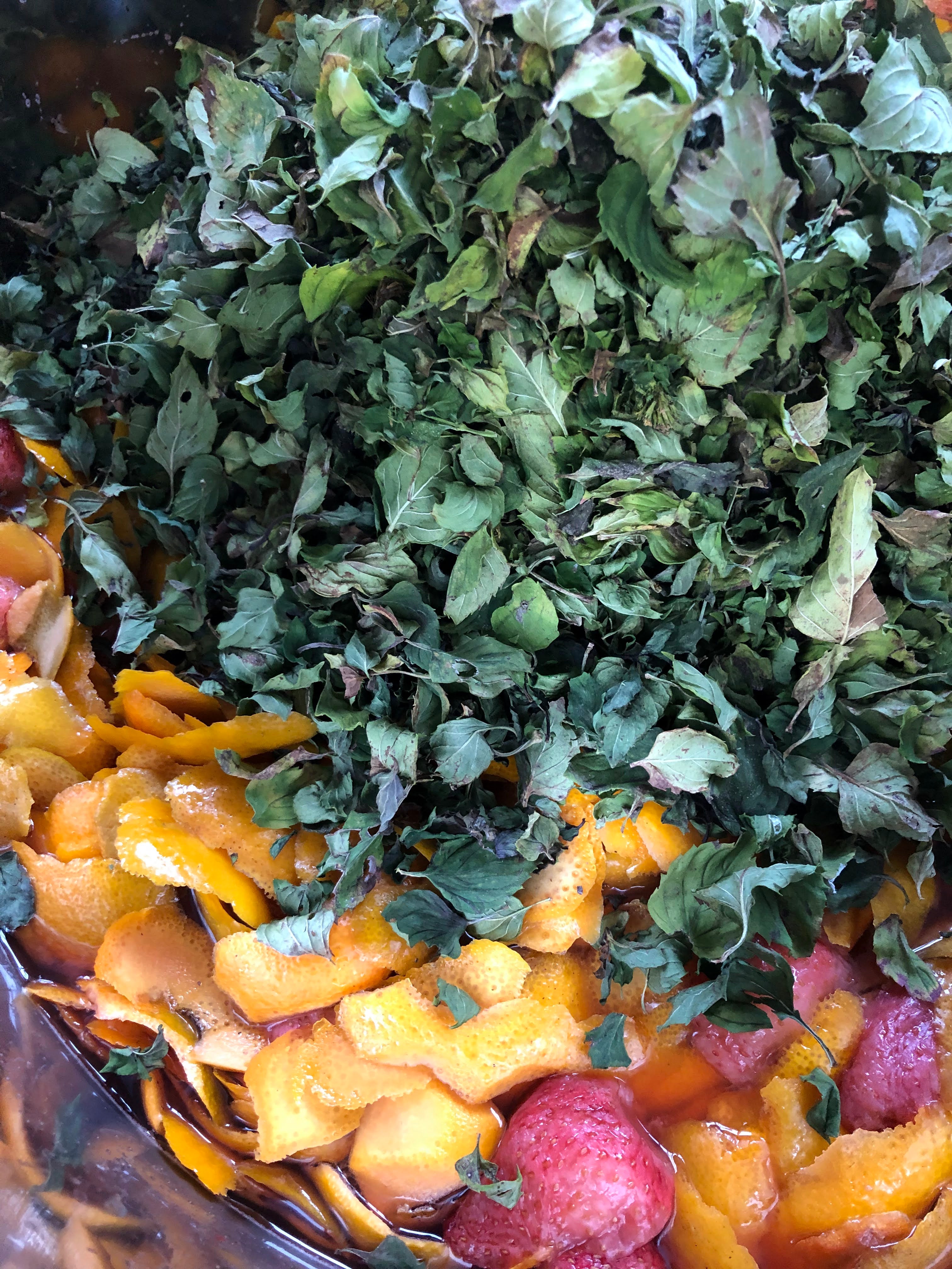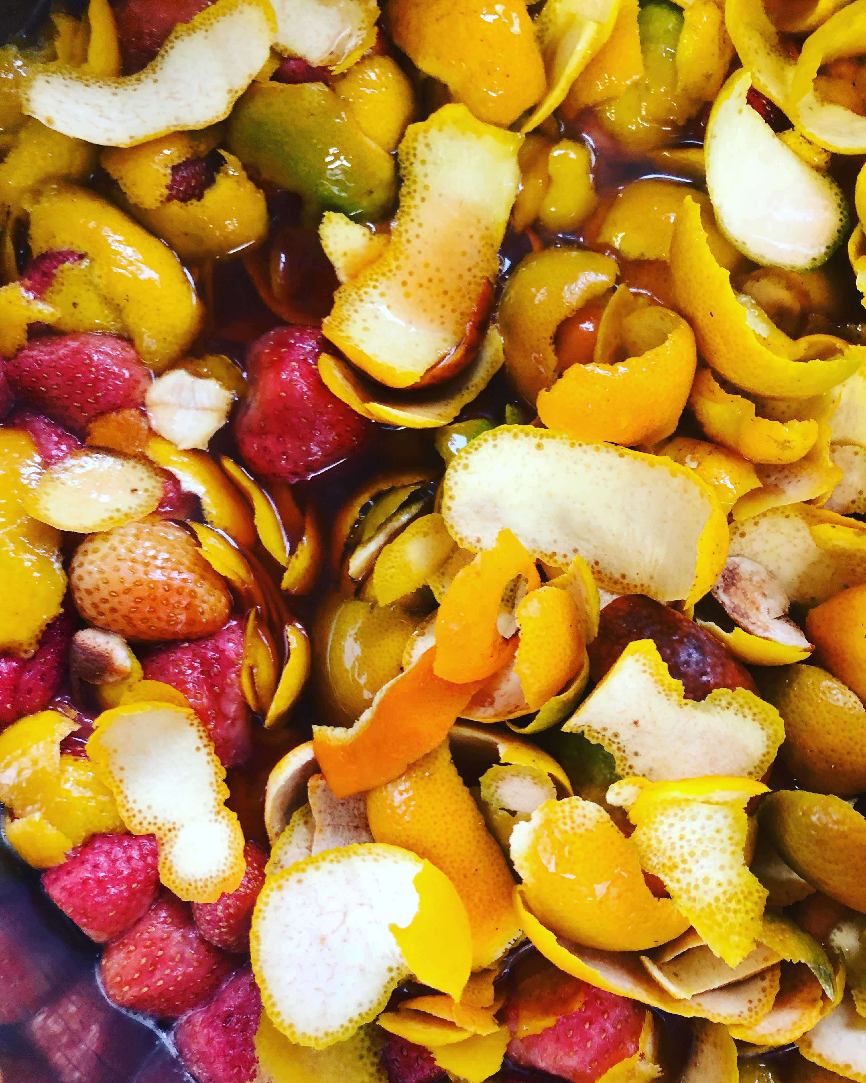mitosayaの庭でたくさん採れた柑橘の果汁を絞り、皮と一緒にシロップに。今回は御宿町の大地農園さんのいちごをわけていただいたので、柑橘キュベのシロップにいちごの鮮やかな色と薫りをまとわせました。