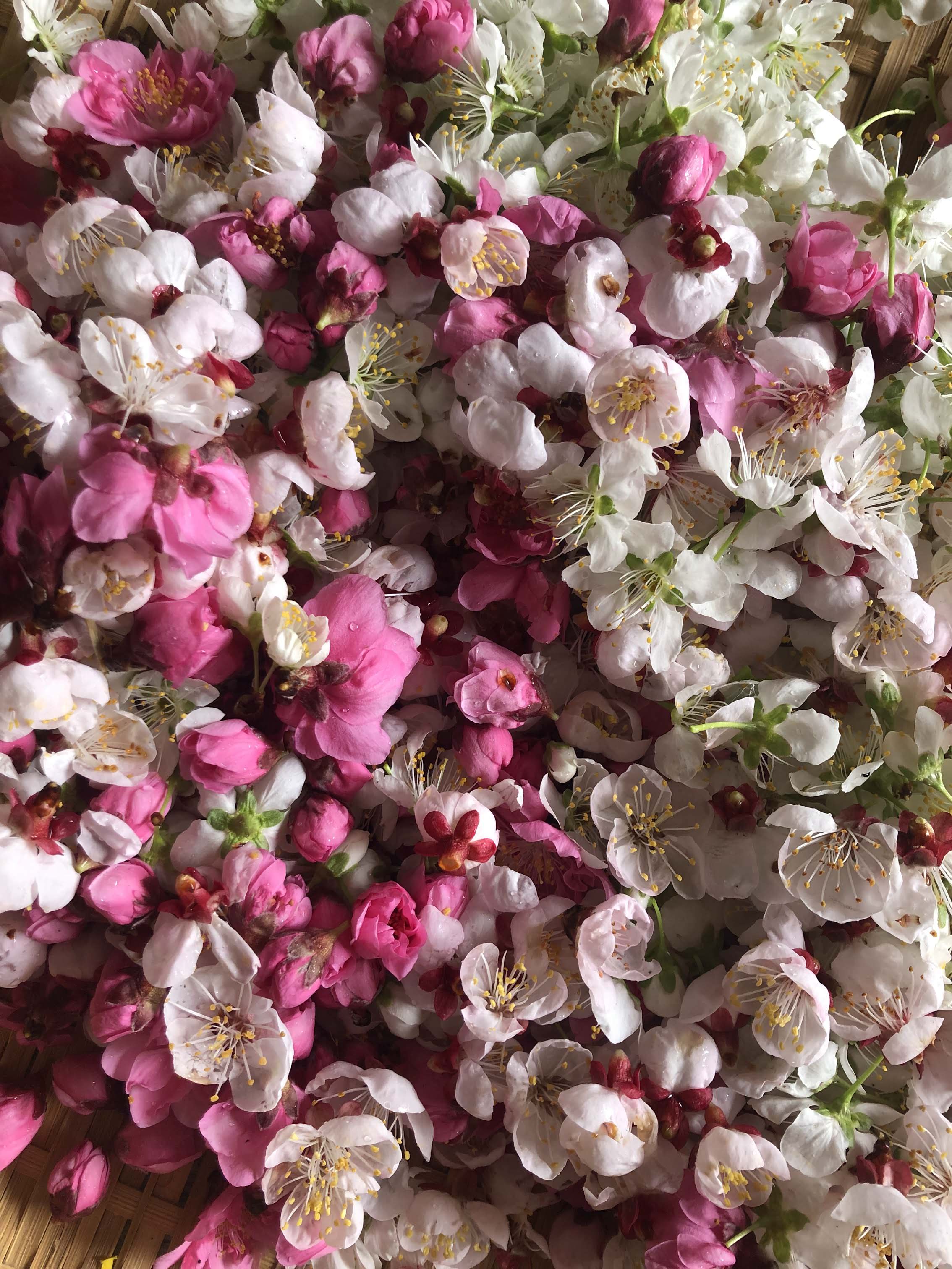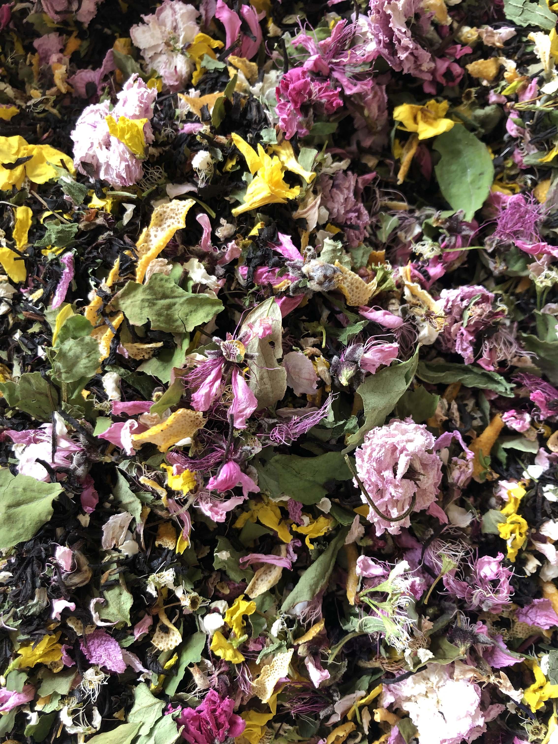 原材料:紅茶(アールグレー/TEHANDEL)、ミント、ブルーベリーの若葉、レモンの皮、春の花(スモモ、桃、桜、八重桜、梅、黄梅、レンギョウ、黒文字)