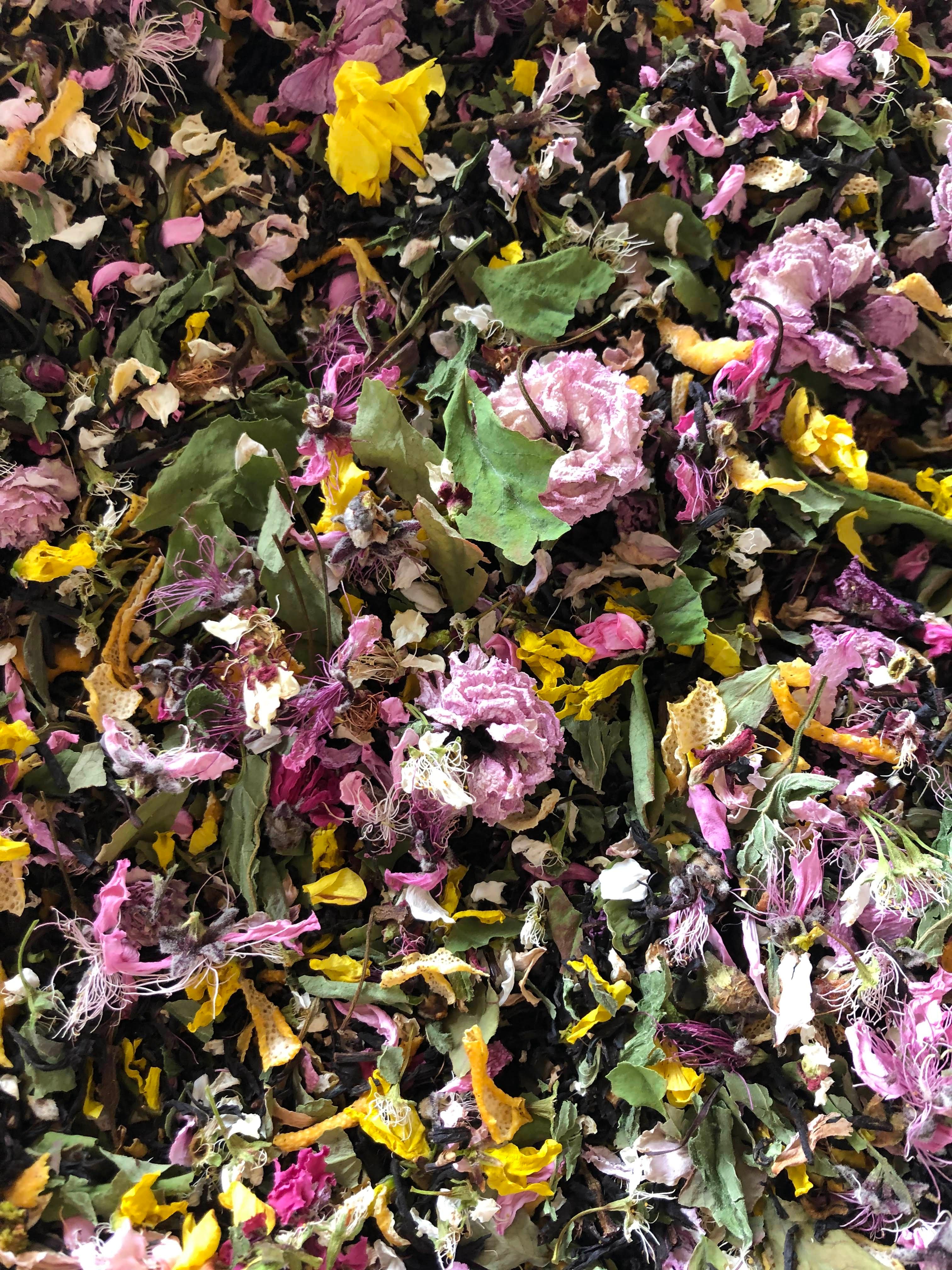 三種のさくらんぼは「ジャボレー」「紅さやか」「正光錦」色も味わいもそれぞれ特徴がちがいます。その三種をミックス仕立てたジャムに合わせたのは、これもまた複雑な味わいのお茶。アールグレーをベースに春の花をたっぷりくわえたブレンドティーを、お茶にして加え、さらに茶葉も加えています。