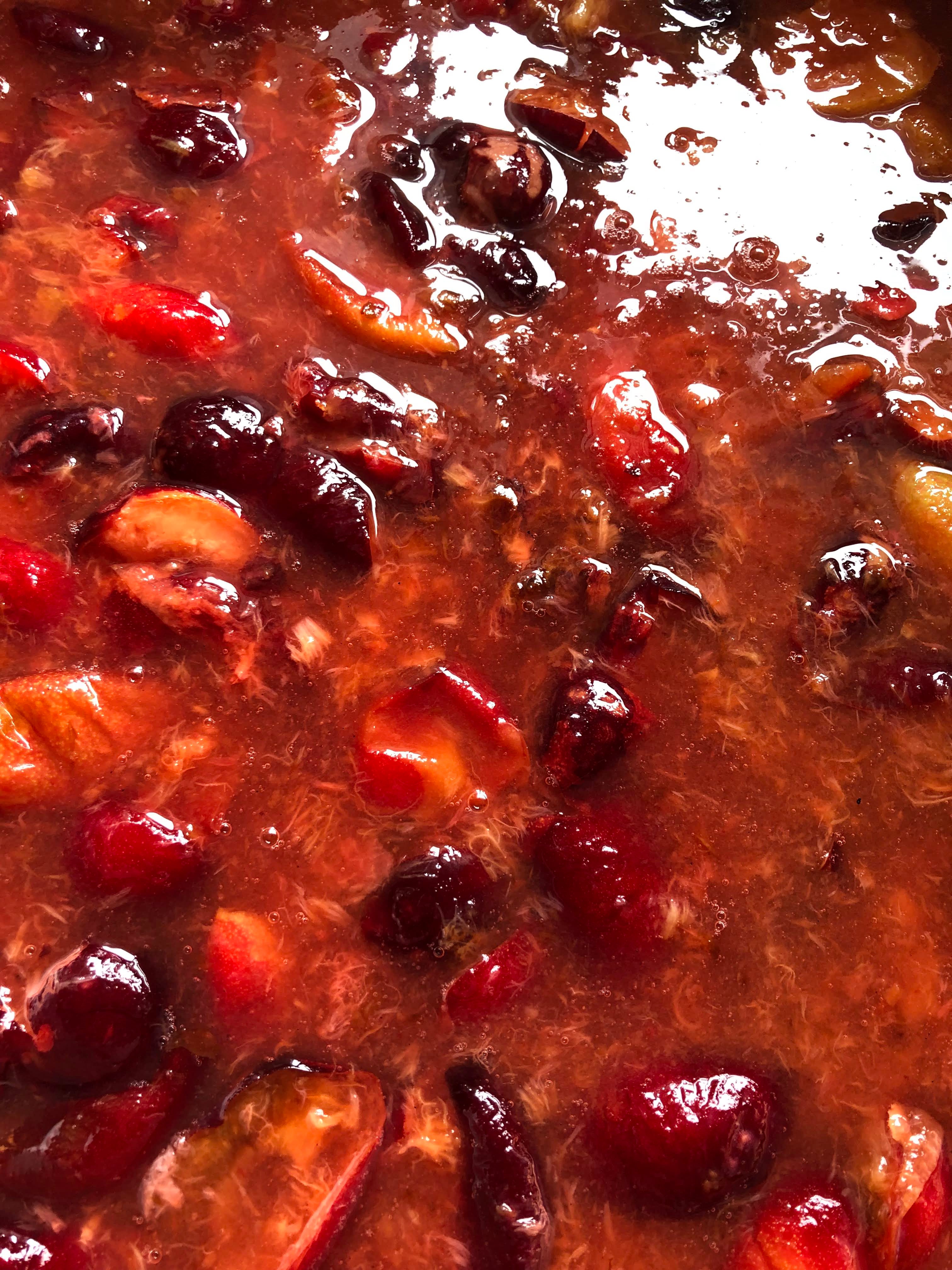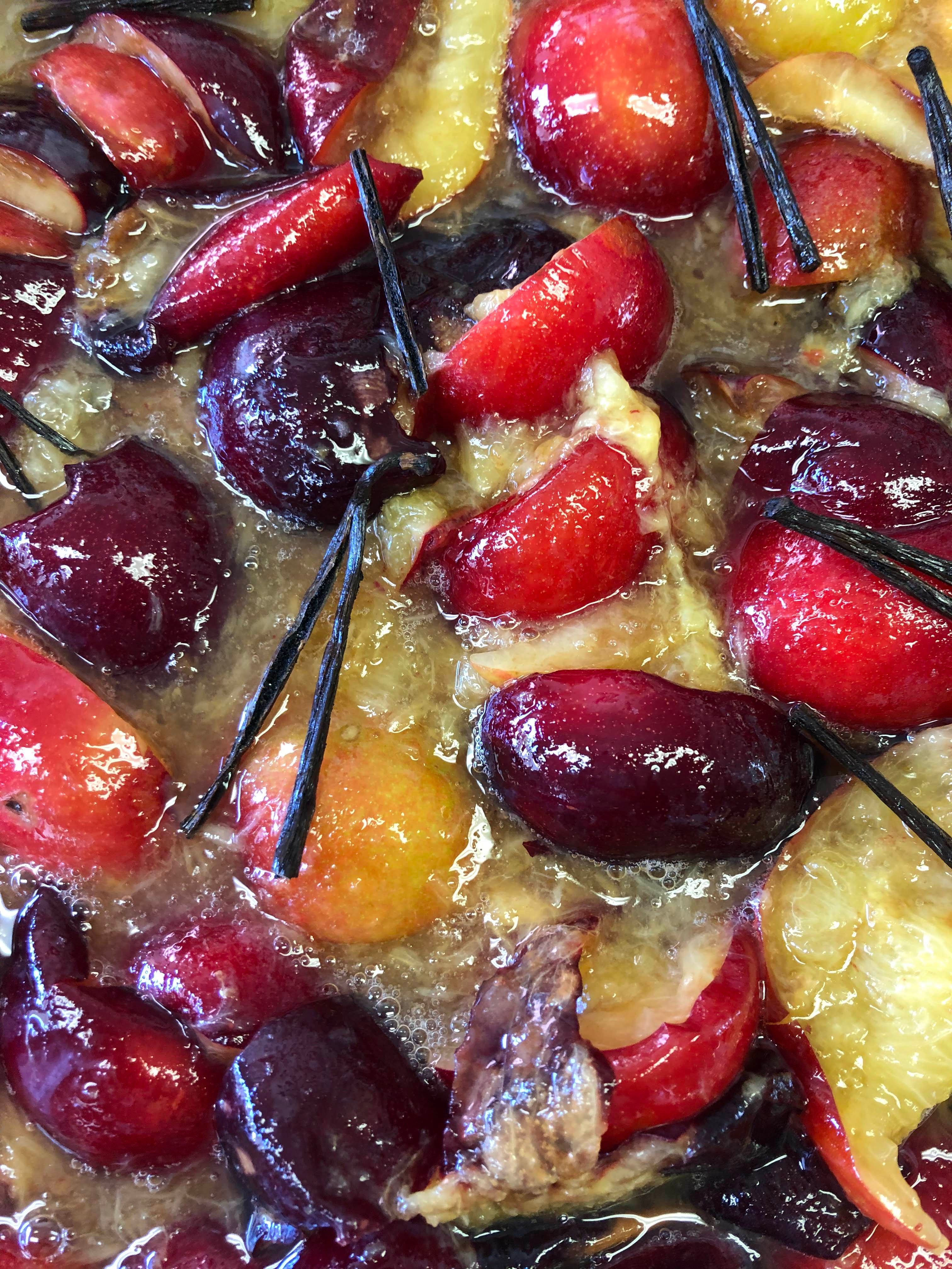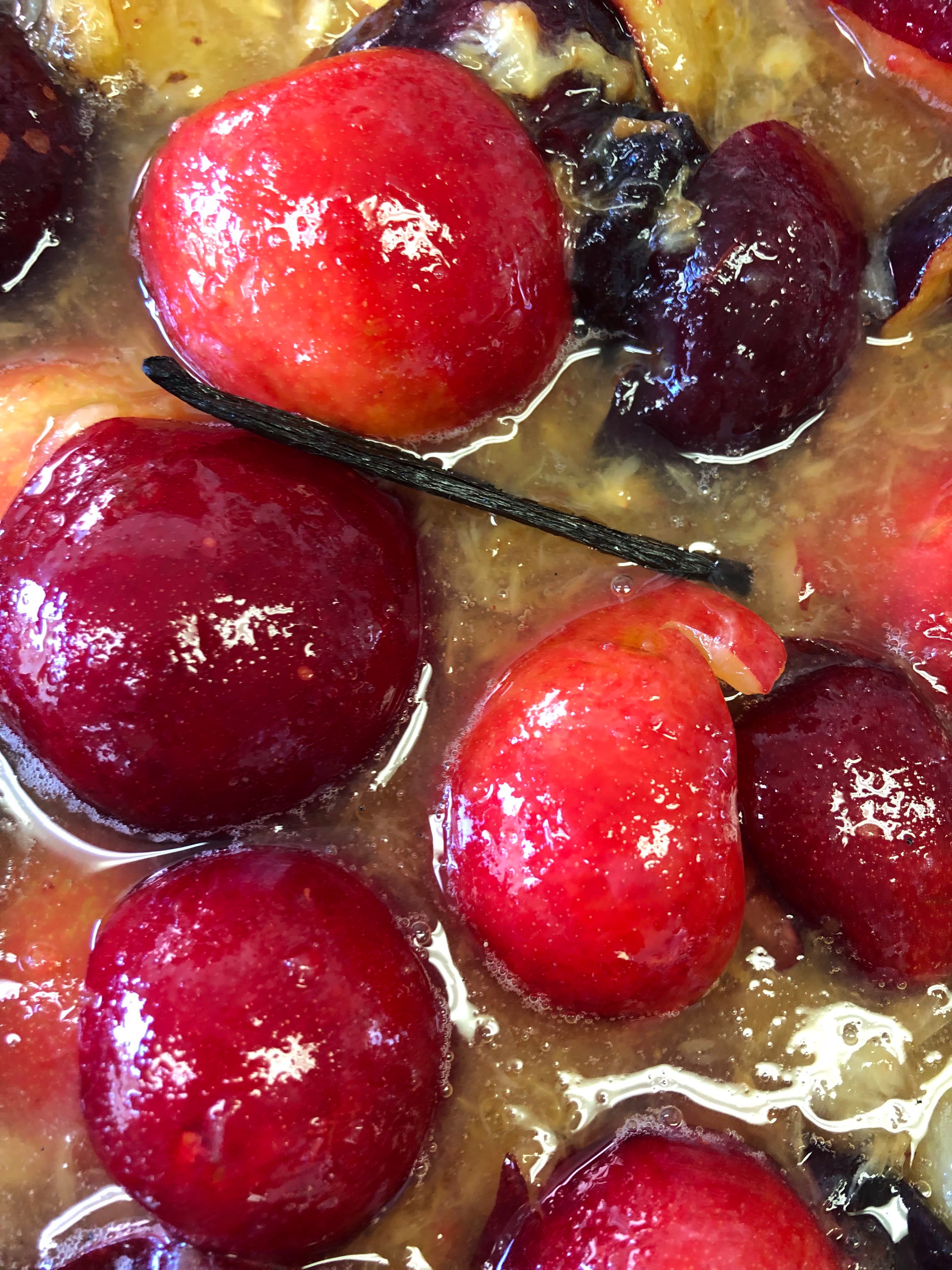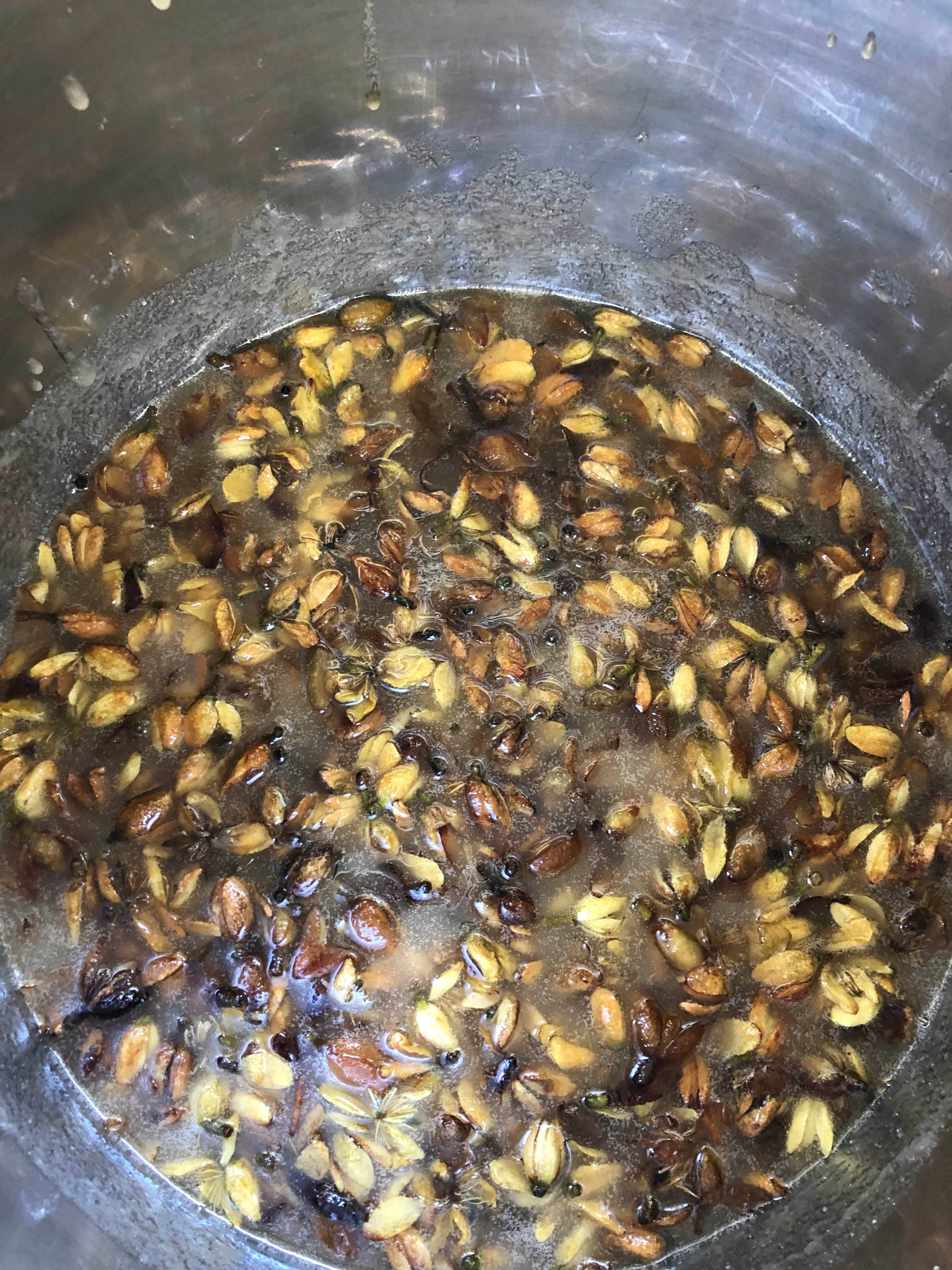 ここからは大急ぎというのは言うまでもなく、翌日には春に採ったカラタネオガタマを漬け込んでおいた砂糖と、マダガスカルから届いたばかりのバニラビーンズをマリネして香りをまとわせました。煮れば自然に実も皮もくずれて美しい色合いが溶け合います。