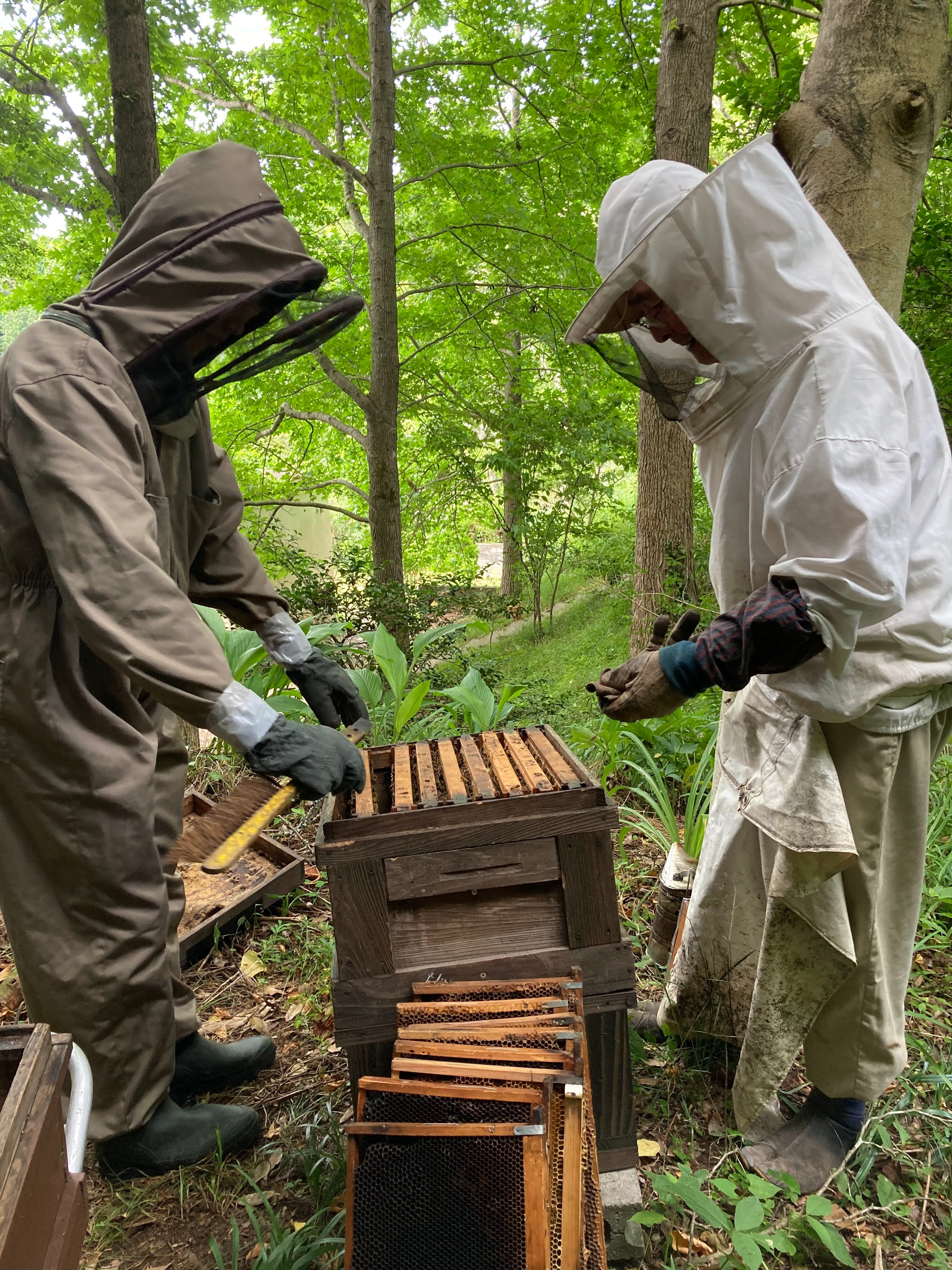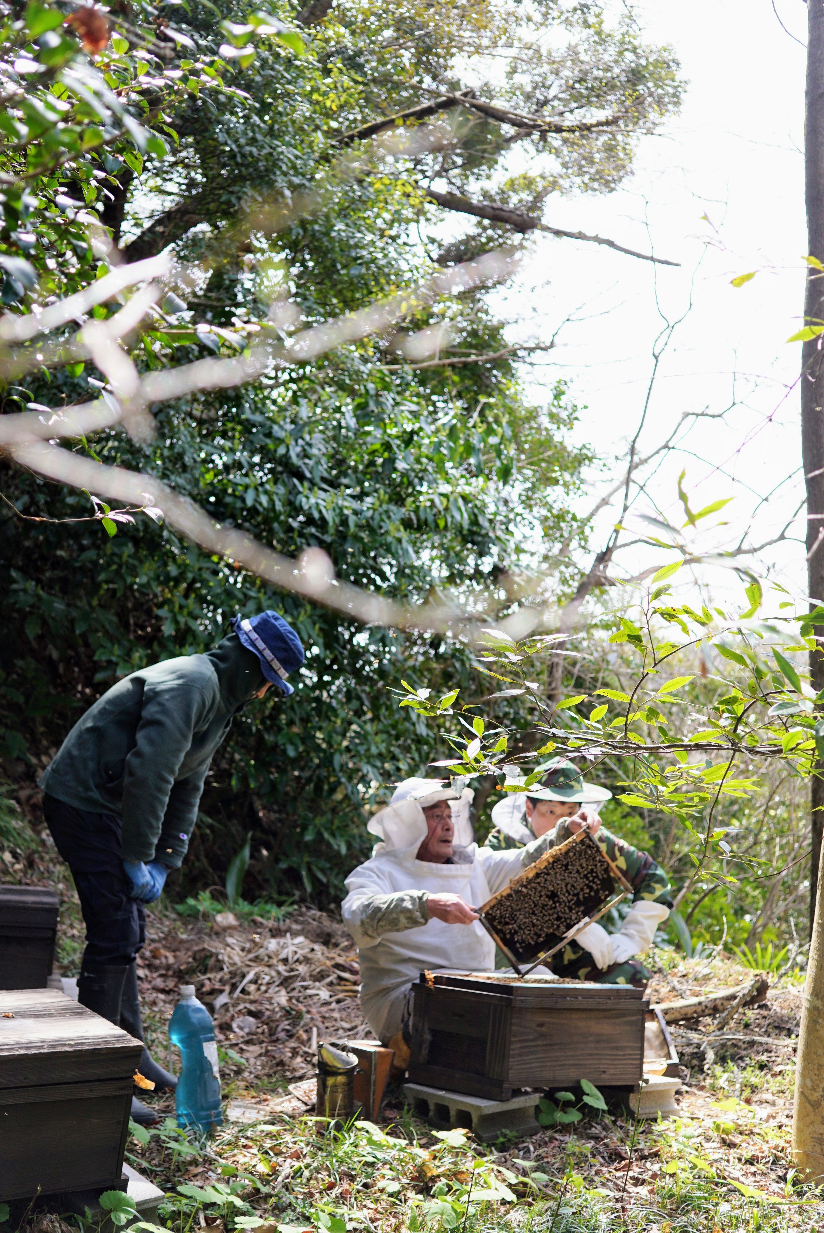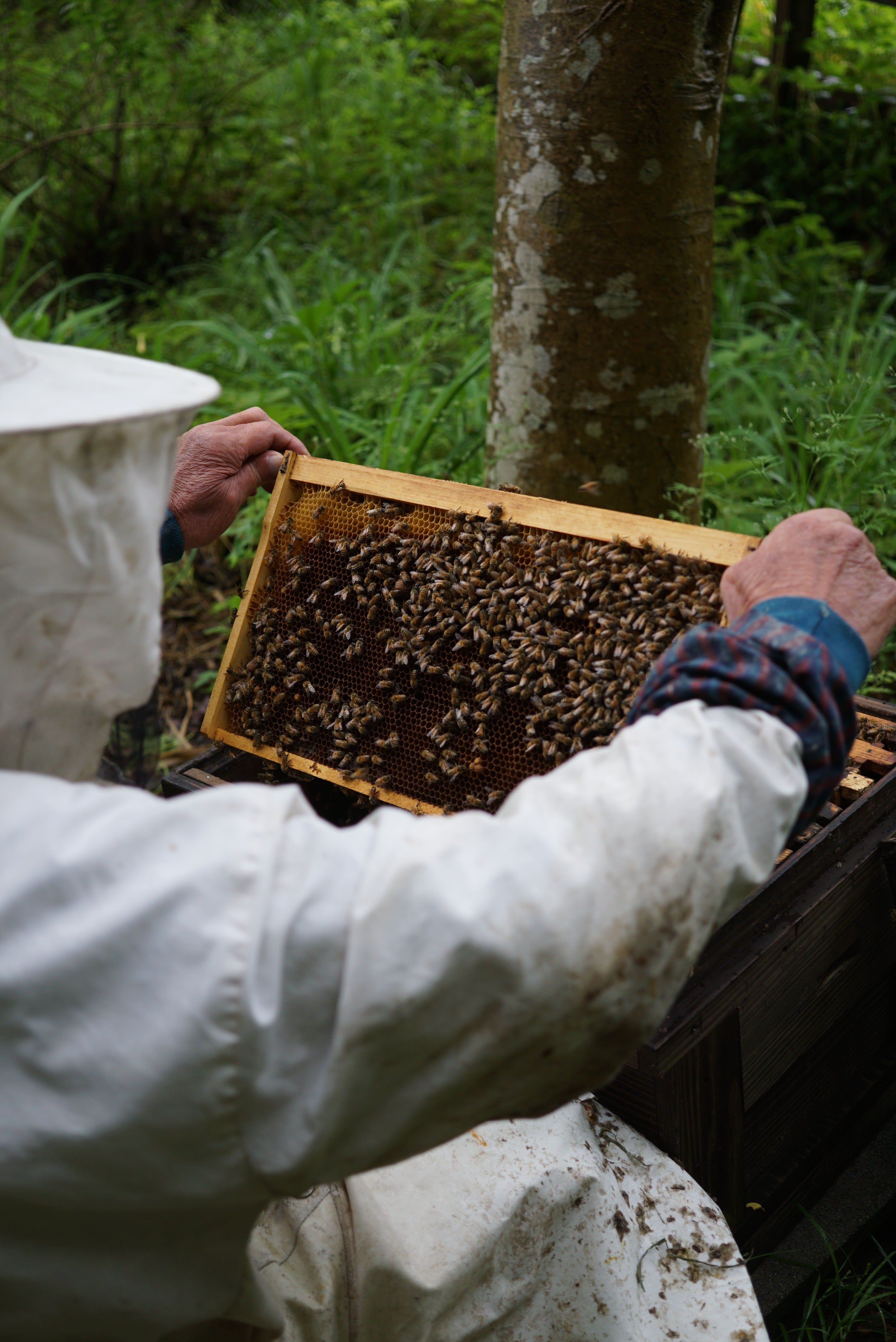 From spring to early summer, when all the plants on the property are in full bloom, the bees are actively flying around, and we can hear and see their wings in various places. We, along with Mr. Asao, a local beekeeper, dressed in unfamiliar protective clothing, inspect the hives and help with the honey collection.