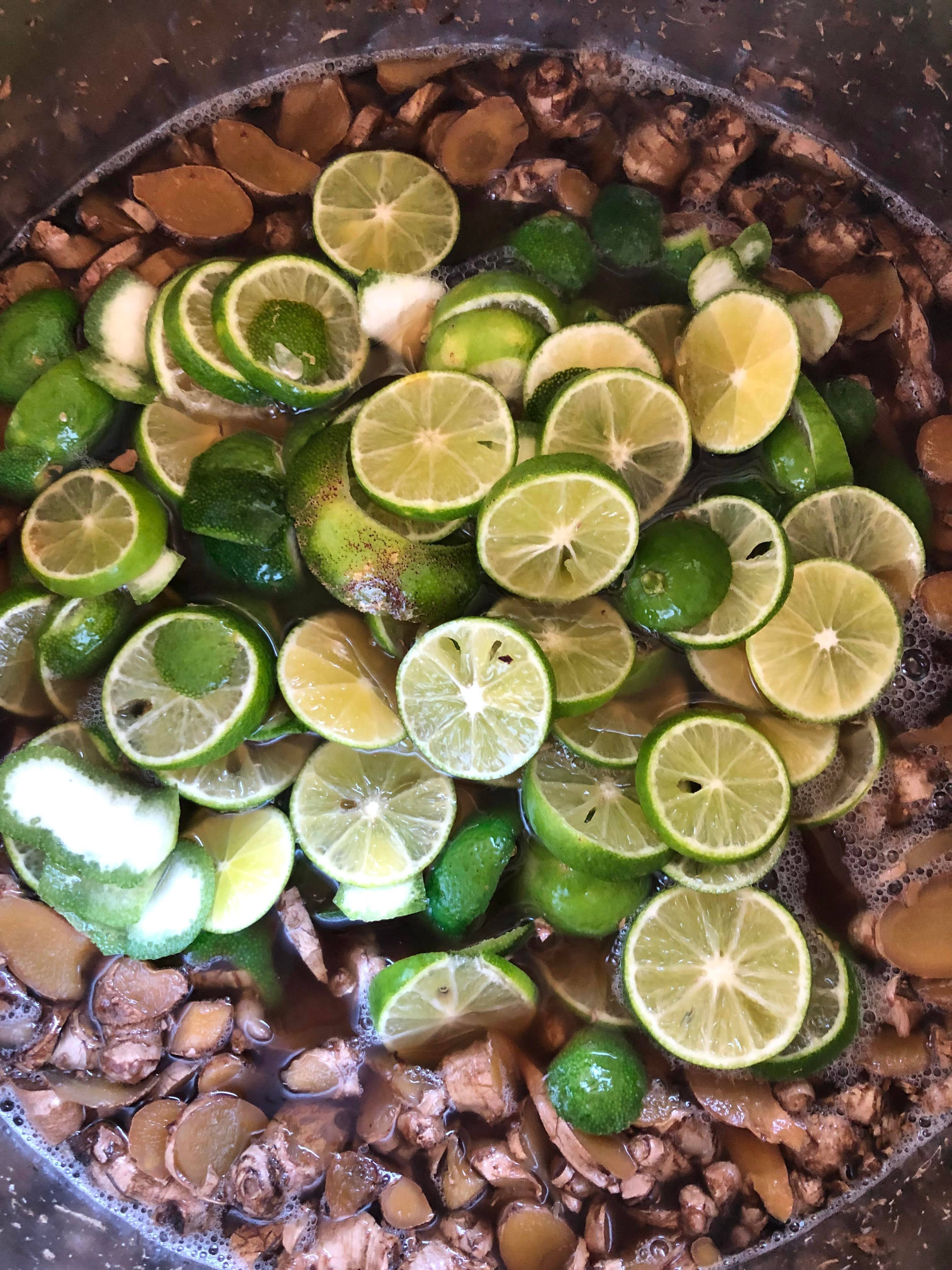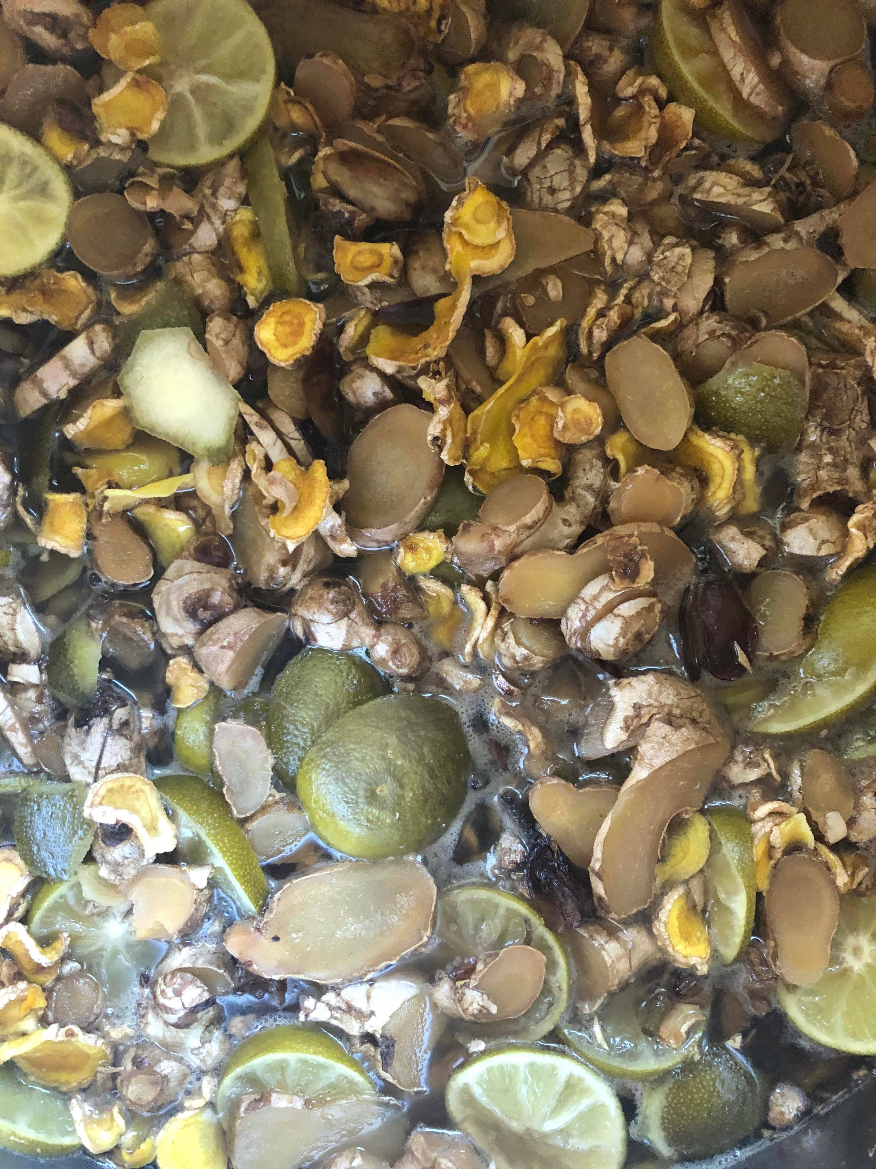 This luxurious syrup uses no water at all, but a base of citrus juice, ginger, turmeric, and a generous amount of vanilla seeds.