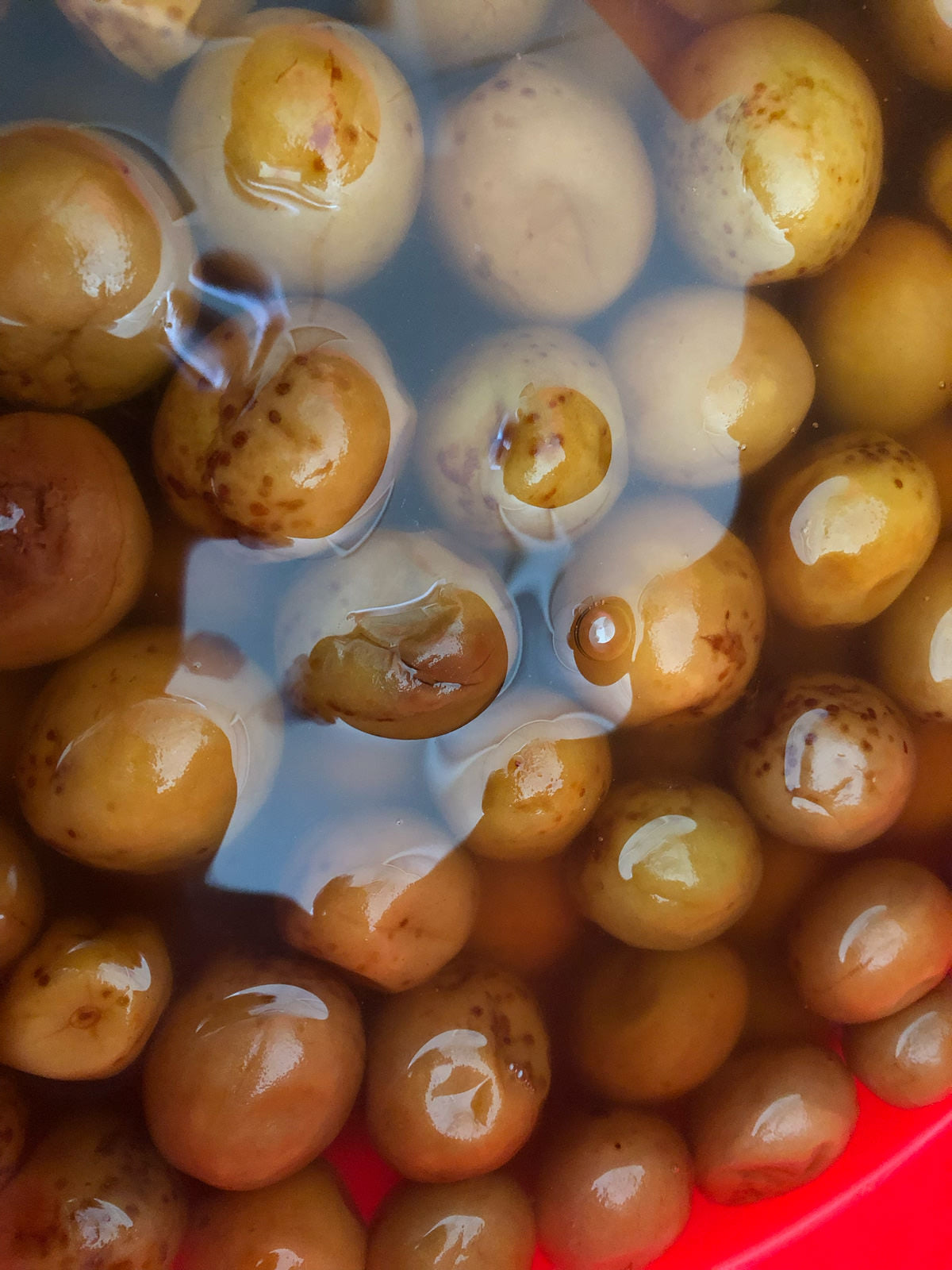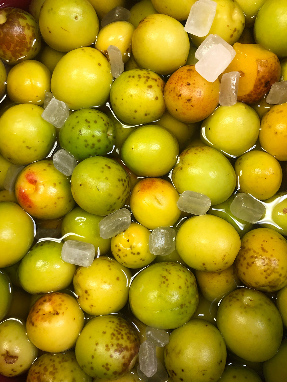 The plums were harvested last summer and stored in pickling liquid in the distillery's cellar for about six months. The hard berries were so full of the sweet and sour pickling liquid that they seemed ready to burst.