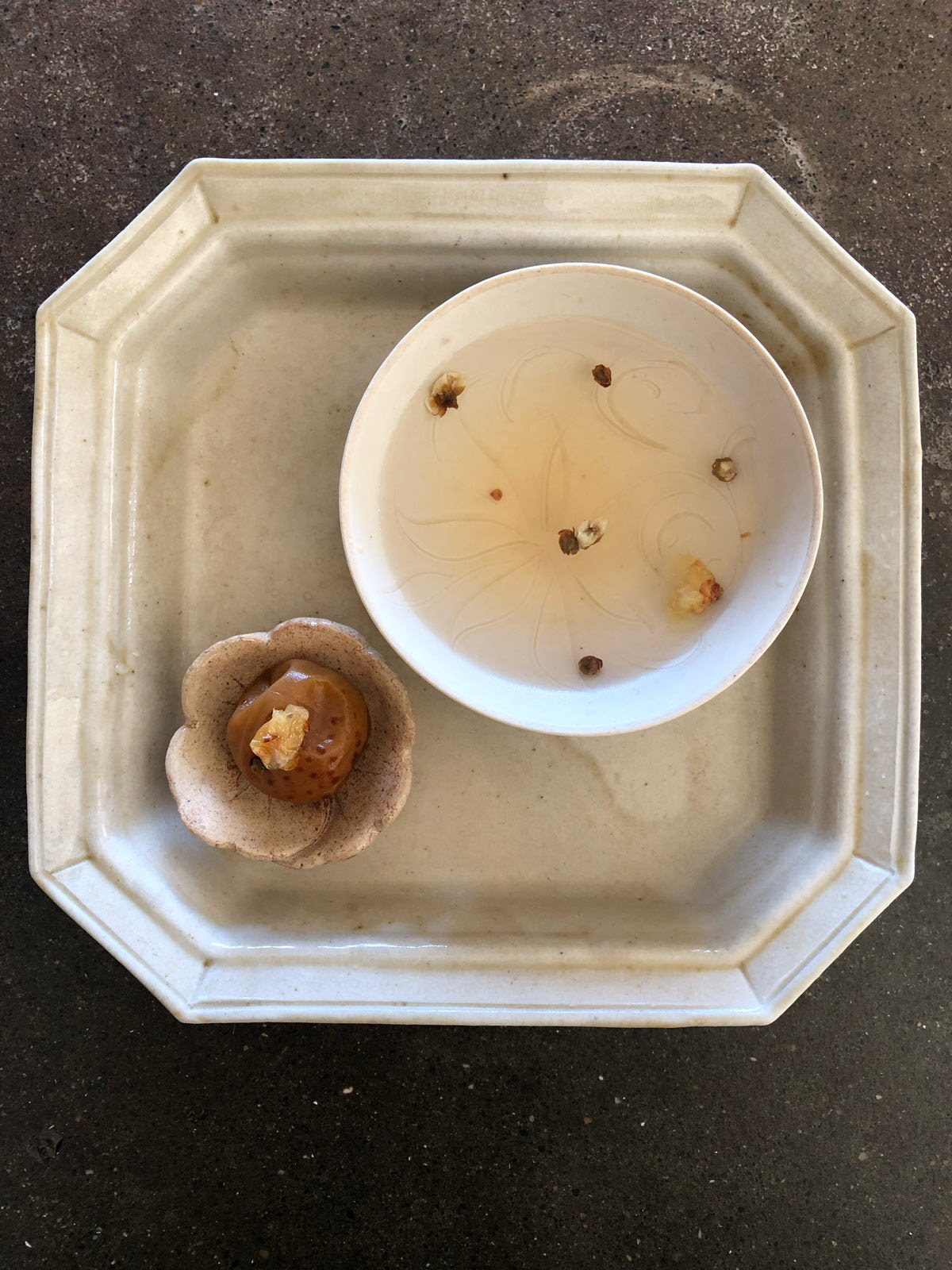 瓶のピクルス液は、白湯にひとさじふたさじ加えて梅花茶に。塩気もあるのでじわっと体を温め、元気をくれます。春の節句のお料理の前に、甘酒の代わりに小さな器に注いでいただくのもおすすめです。