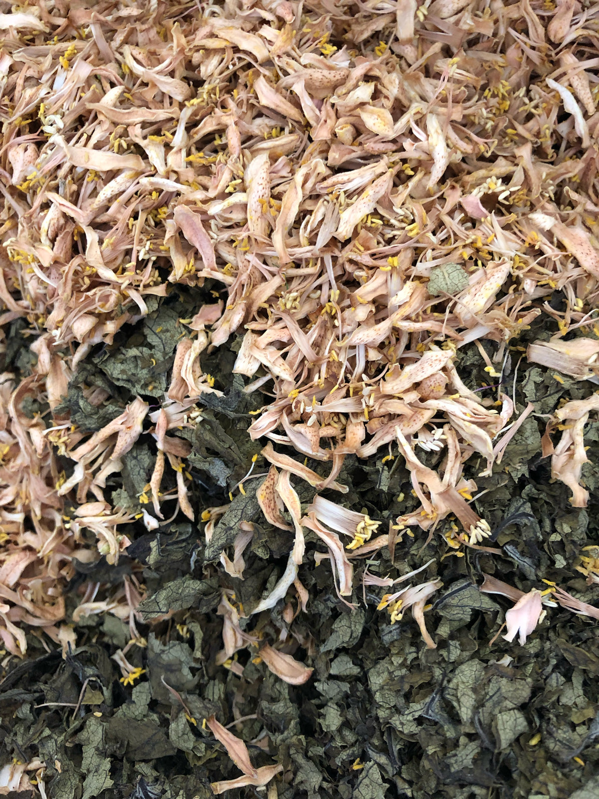 We have a large persimmon tree that produces dazzling bright yellow-green soft leaves in the spring. We picked the leaves and fermented them, they lost their yellow-green color, but turned out to be a beautiful gray-green tea. I combined them with citrus petals from my garden and discovered that jasmine flowers and citrus flowers have a similar aroma, which led me to the idea of combining them with jasmine tea.