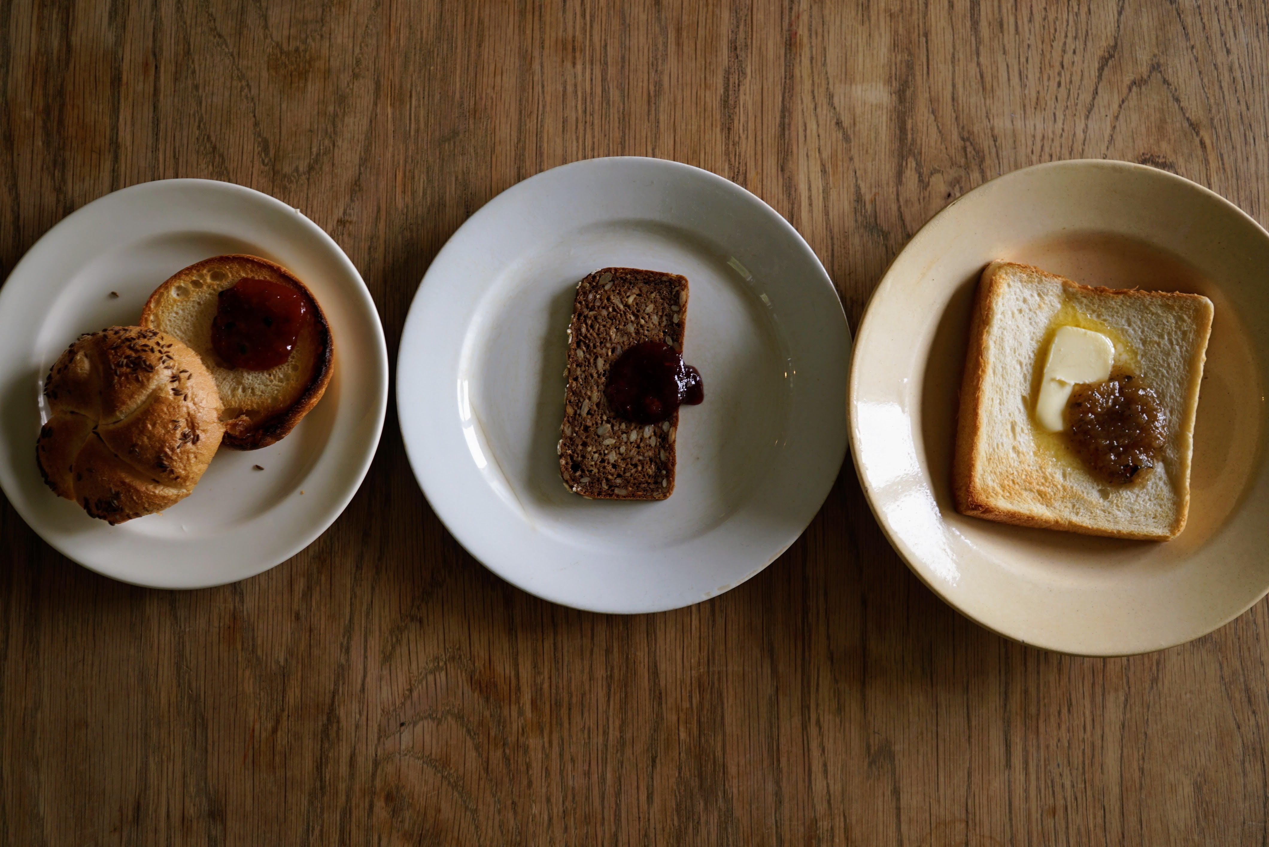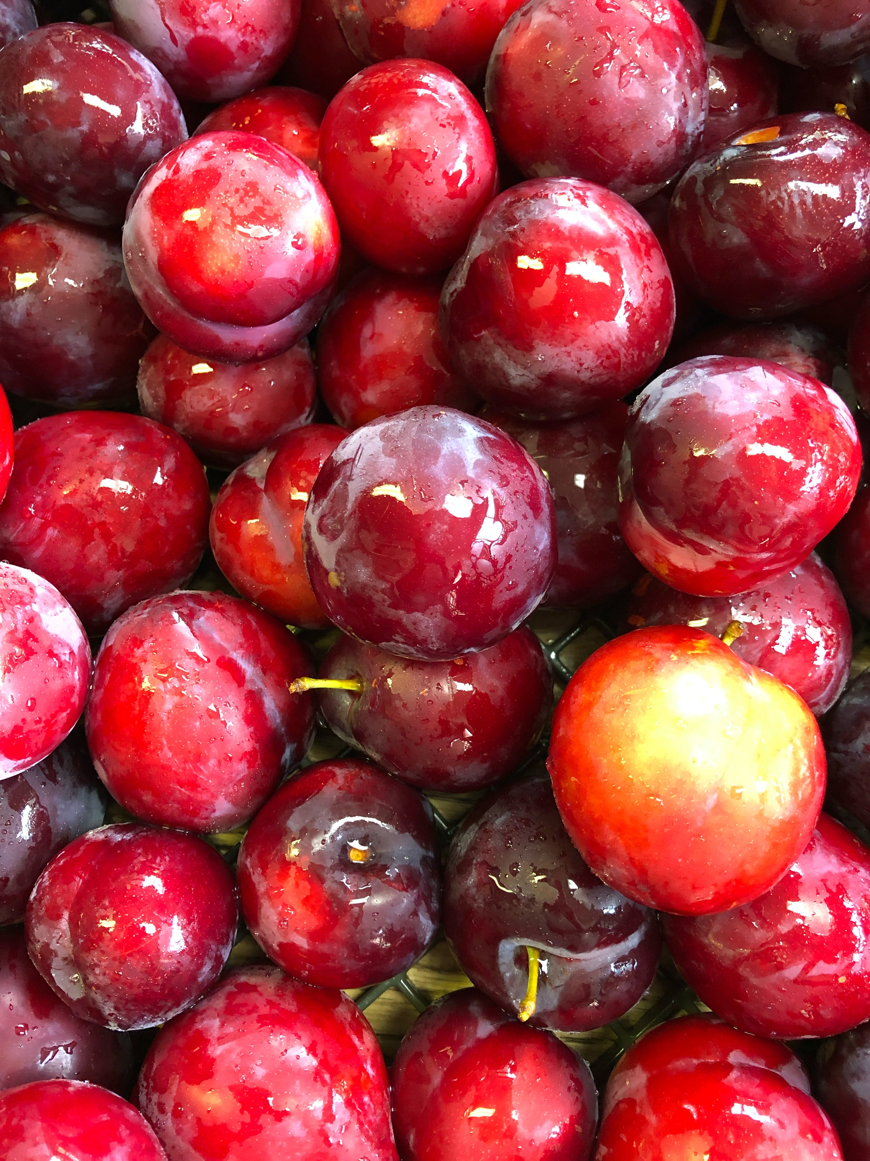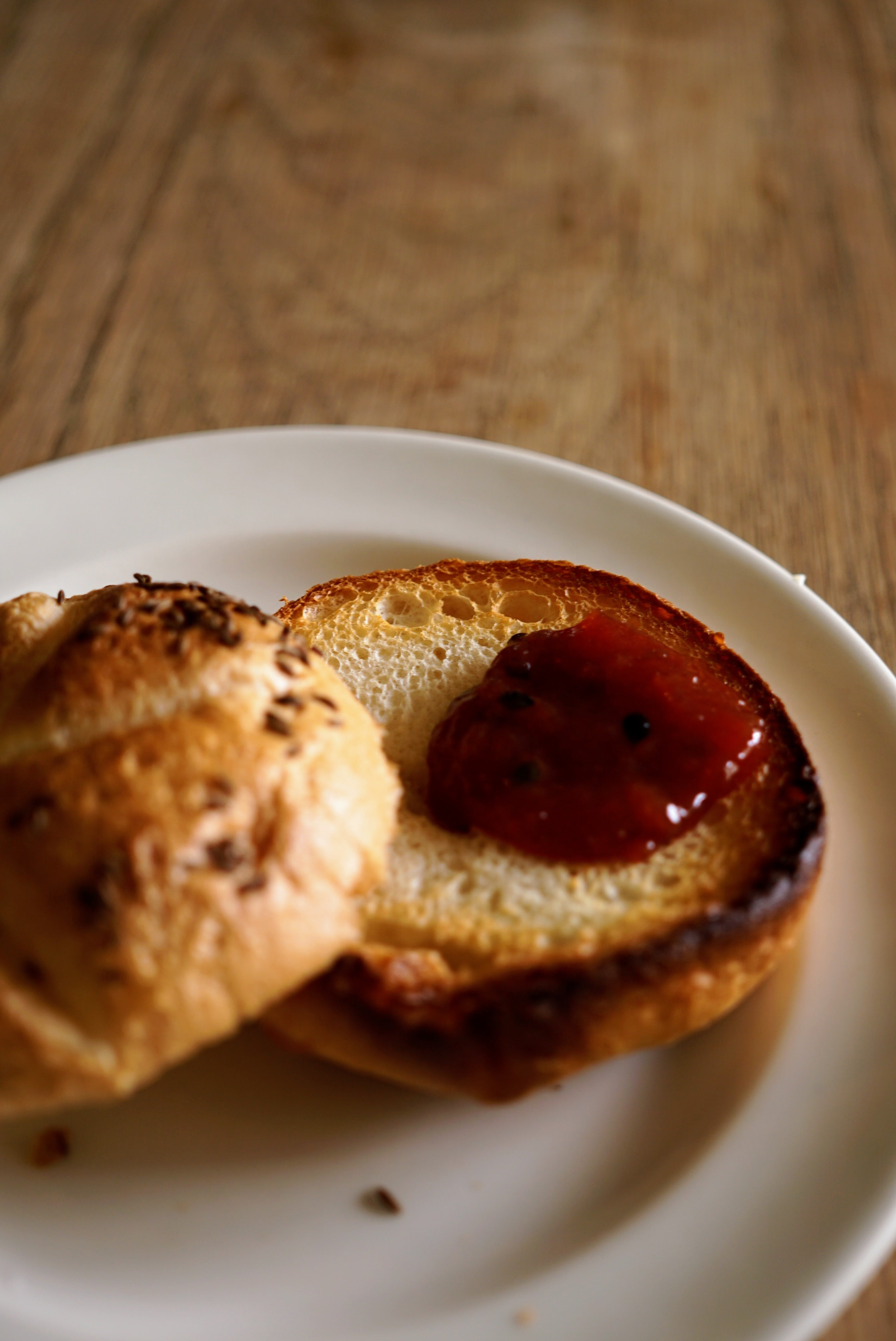 We combined them with freshly harvested plums from Yamanashi, which are from a different place, but at the same time of the year, to make a lovely red jam with black dots. The crunchy passion fruit seeds add a textural accent, and the addition of mountain peach liqueur at the end gives the jam a sweet, subtle aroma.