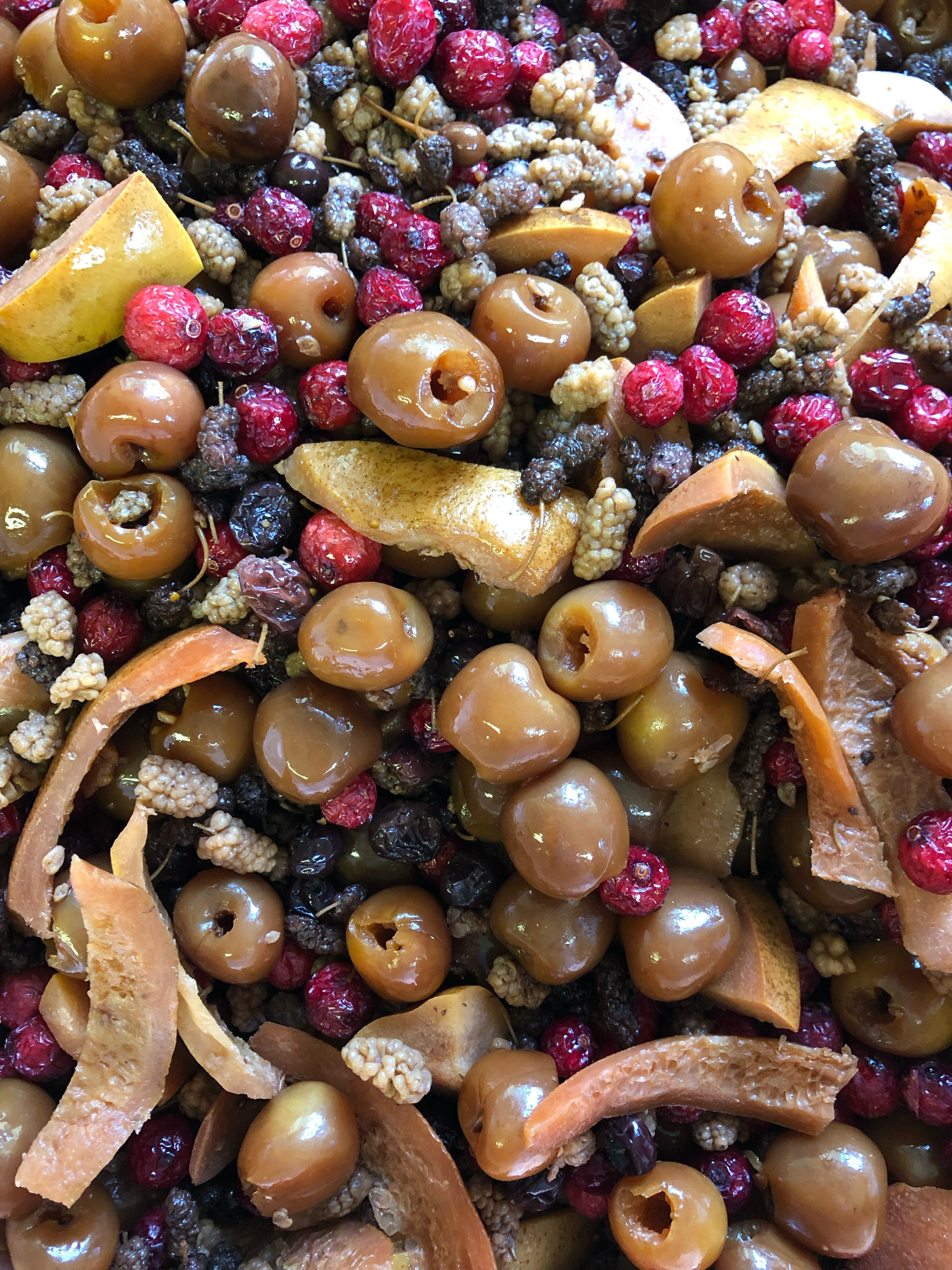 原材料:さくらんぼ(山形産)、ドライクランベリー、花梨、安政柑の皮、実、桑の実、ジュンベリー、山桃のシロップ、ニッケイの根、葉、ラベンダー、ローリエ、タイム、橙皮、グラニュー糖