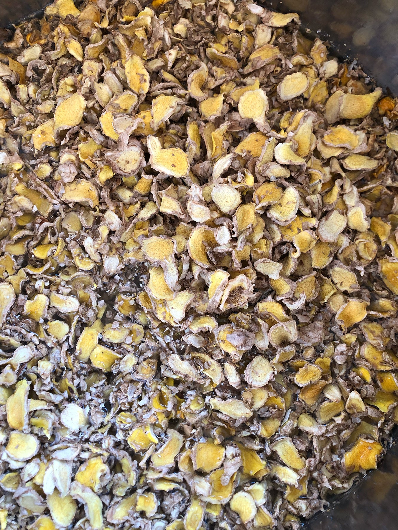 mitosayaの庭を代表する植物の一つがウコンです。ターメリックともいいカレーのスパイスや、健康食品、染色などでも使われますが、私は毎年、スライスして乾燥させたものをシロップに仕立てます。私が庭を担当するようになってからは、栽培の段階からウコンとの付き合いが始まり、より作る気持ちも熱くなるというものです。